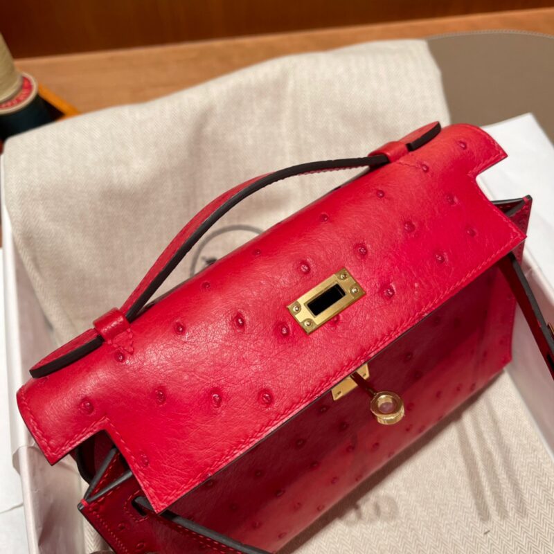 Kelly Pochette Generation South African Ostrich kk leather. Q5 Flag Red (Rouge Casaque). Gold Buckle.