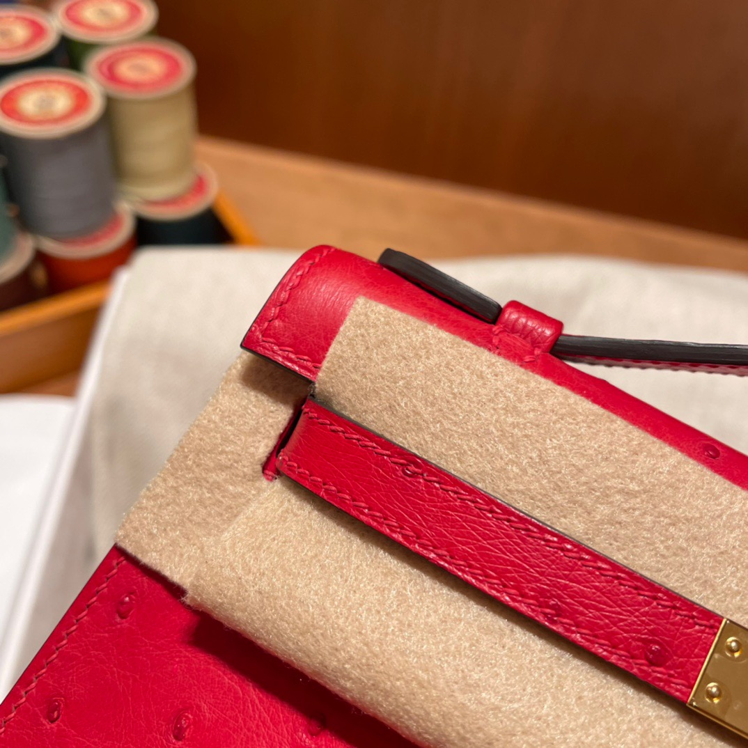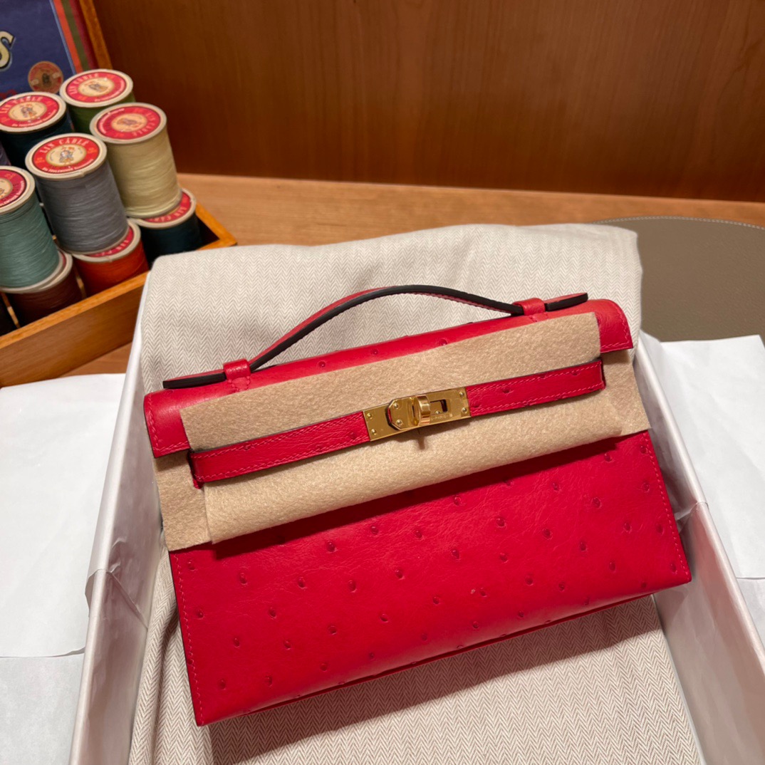 Kelly Pochette Generation South African Ostrich kk leather. Q5 Flag Red (Rouge Casaque). Gold Buckle.