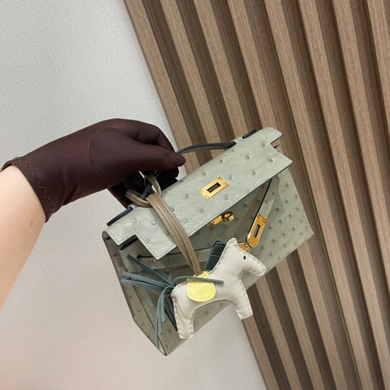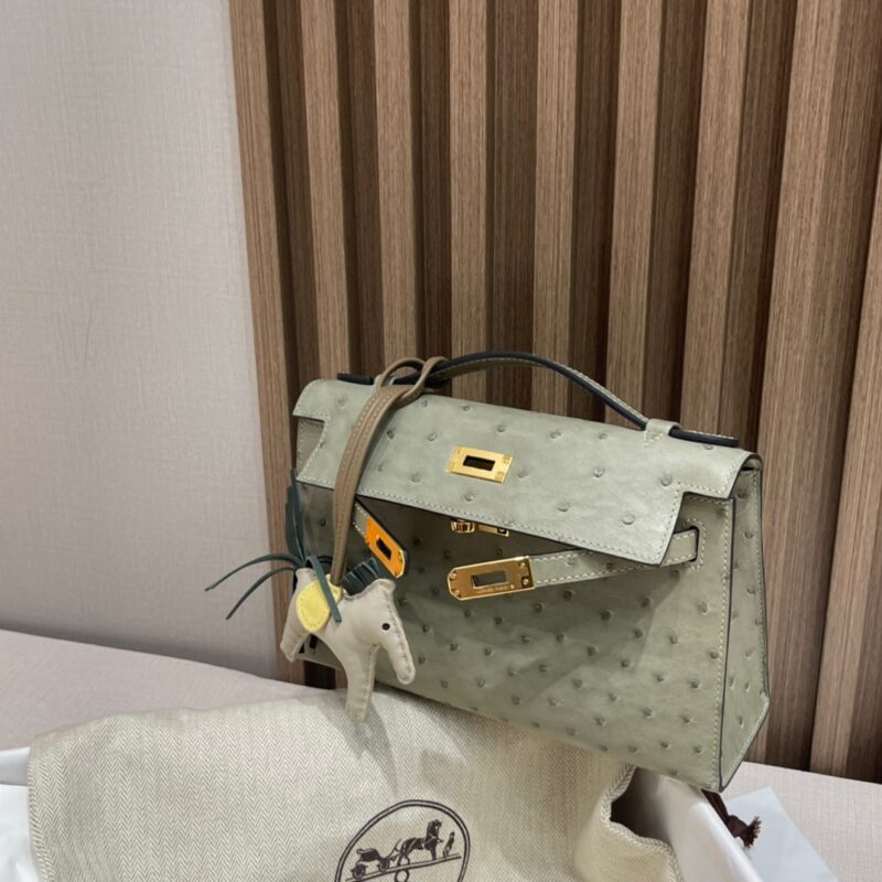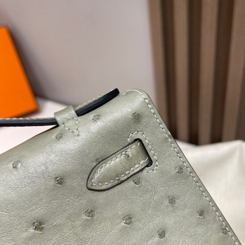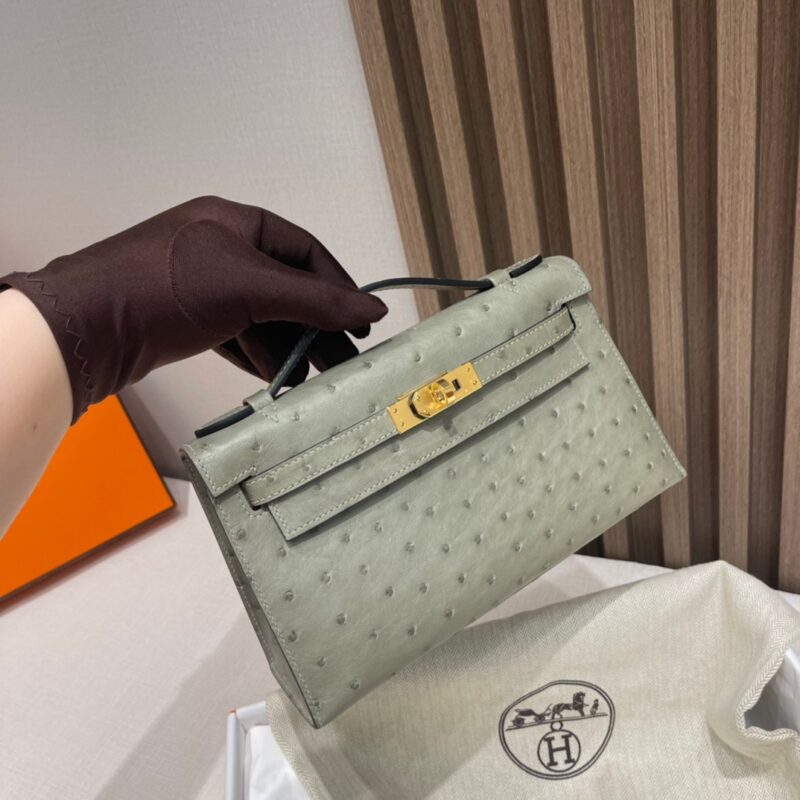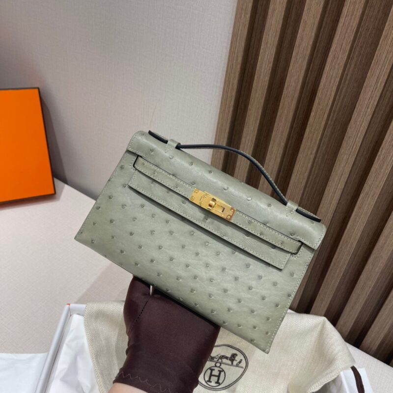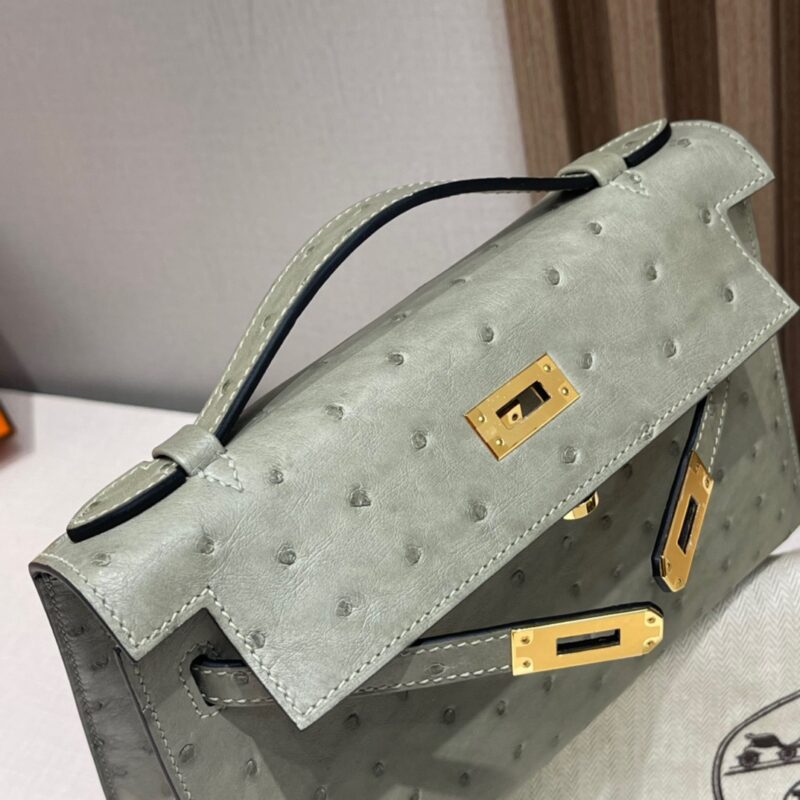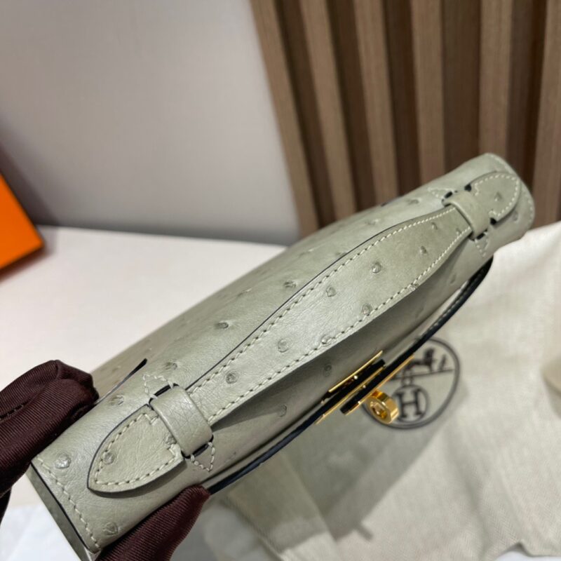 Kelly Pochette Generation South African Ostrich kk leather. Q1 Sage Green (Sauge). Gold Buckle.