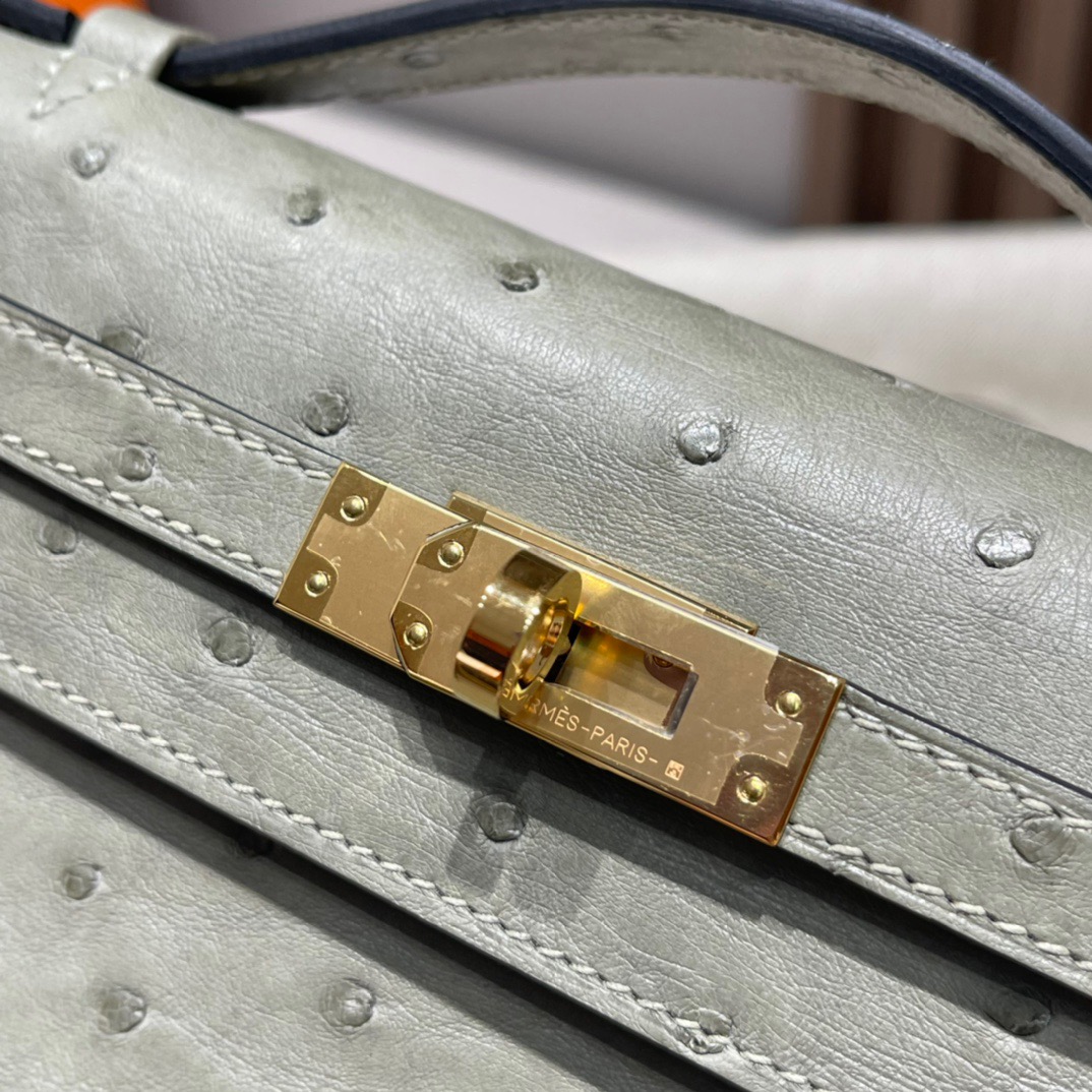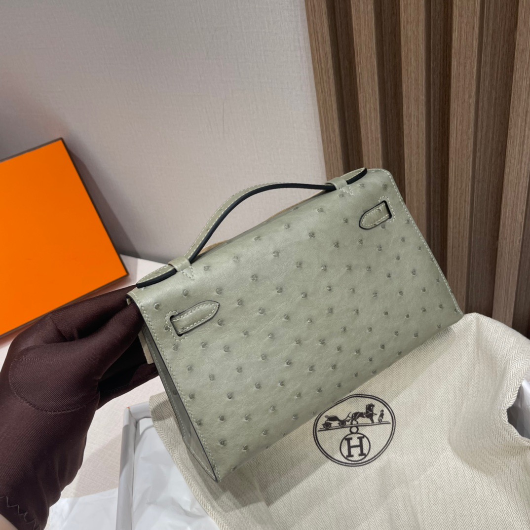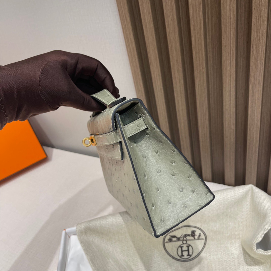 Kelly Pochette Generation South African Ostrich kk leather. Q1 Sage Green (Sauge). Gold Buckle.
