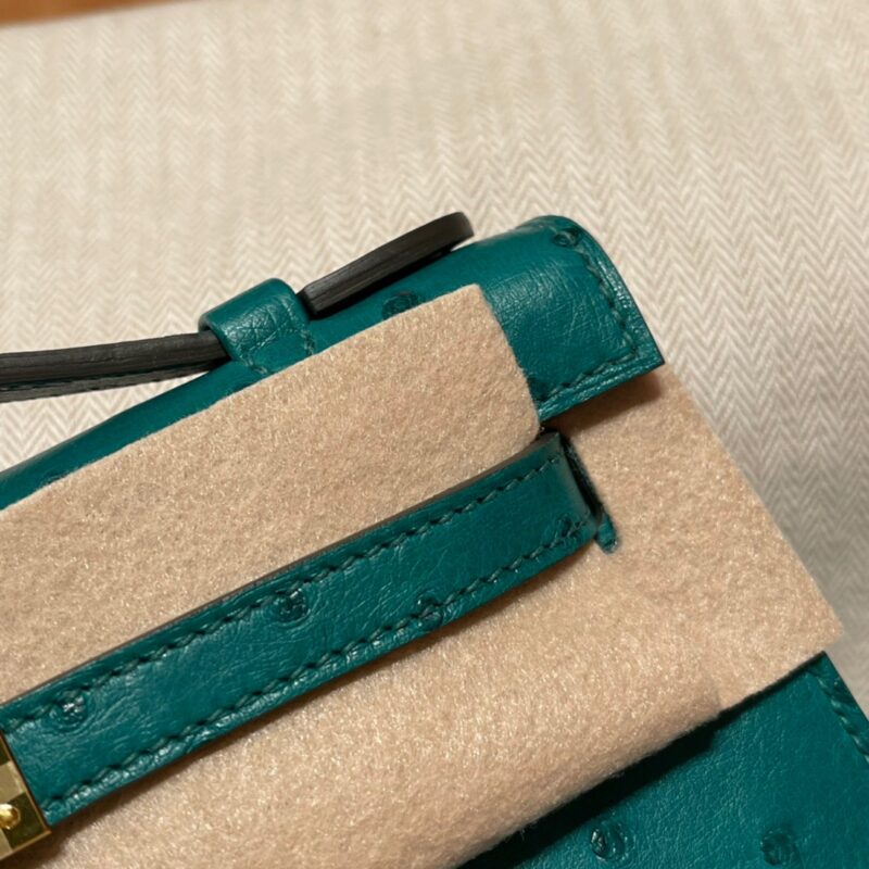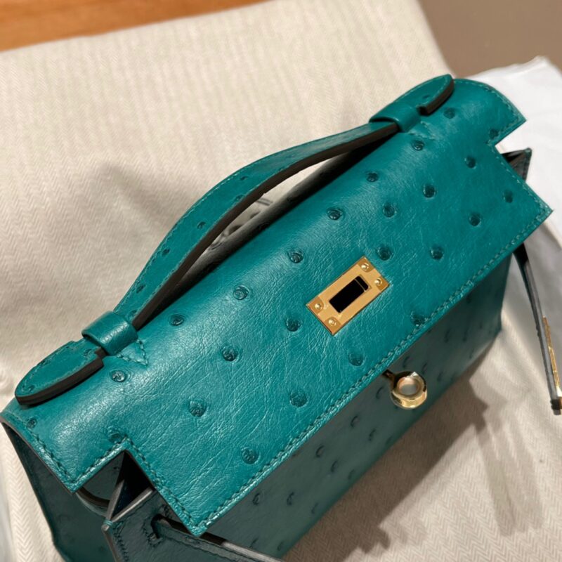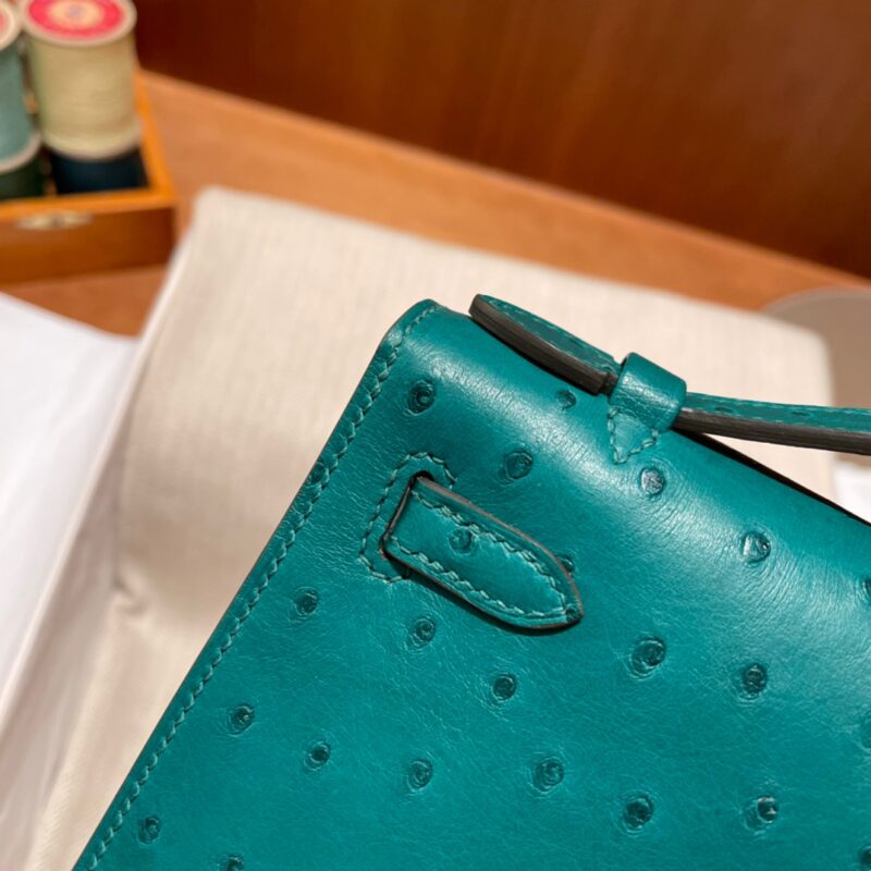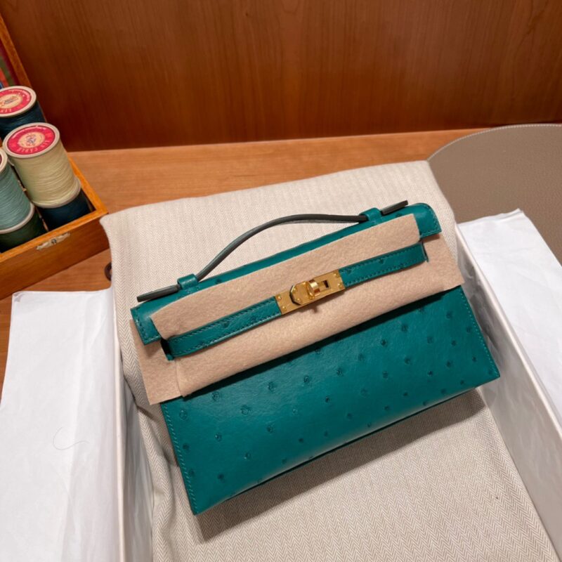 Kelly Pochette generation Ostrich leather. U4 Velvet Green (Vert Vertigo). Gold Buckle.