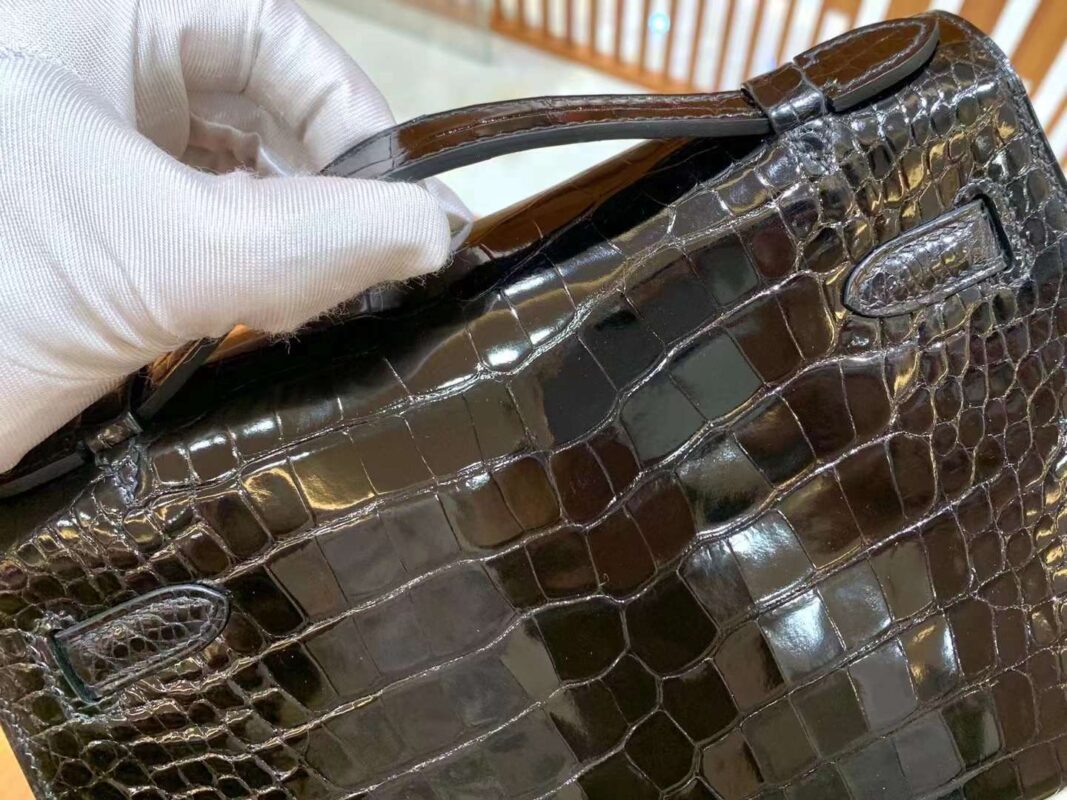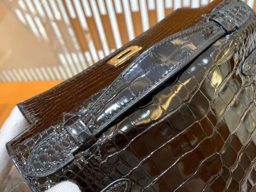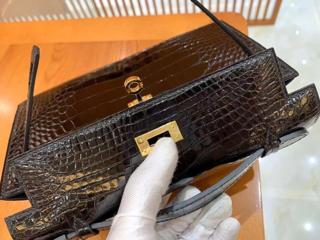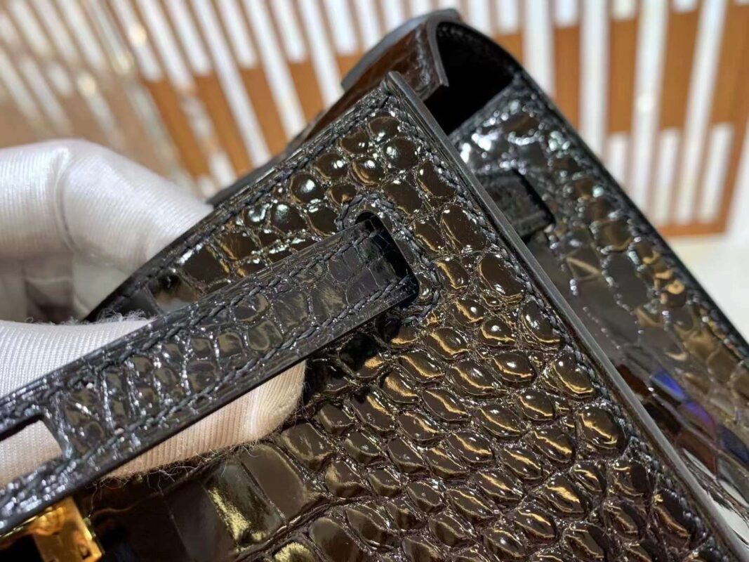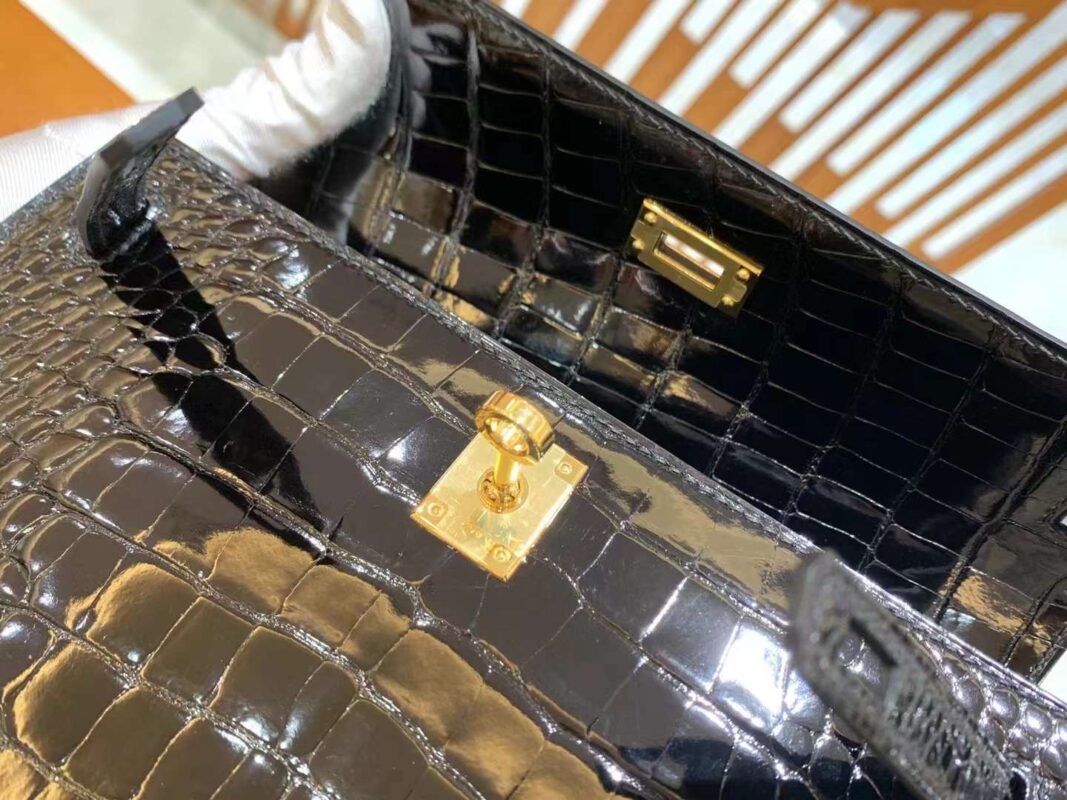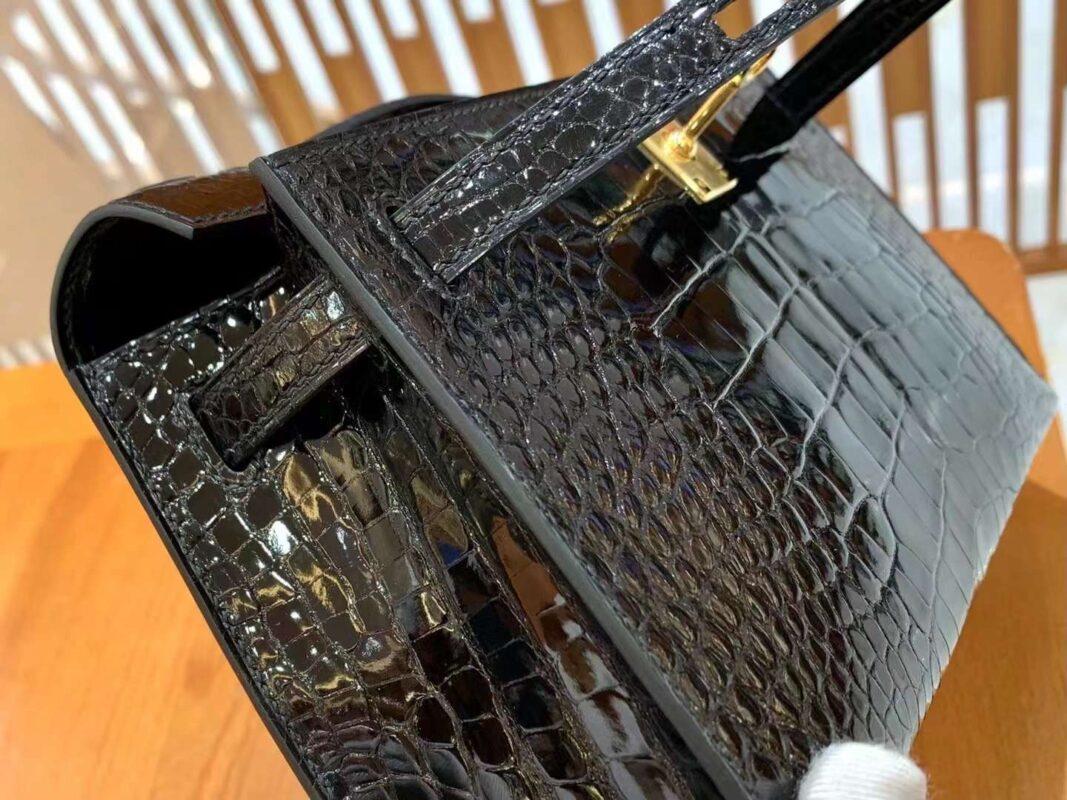 Mini Kelly Generation 22cm. Shiny Alligator leather. Black. Gold Buckle