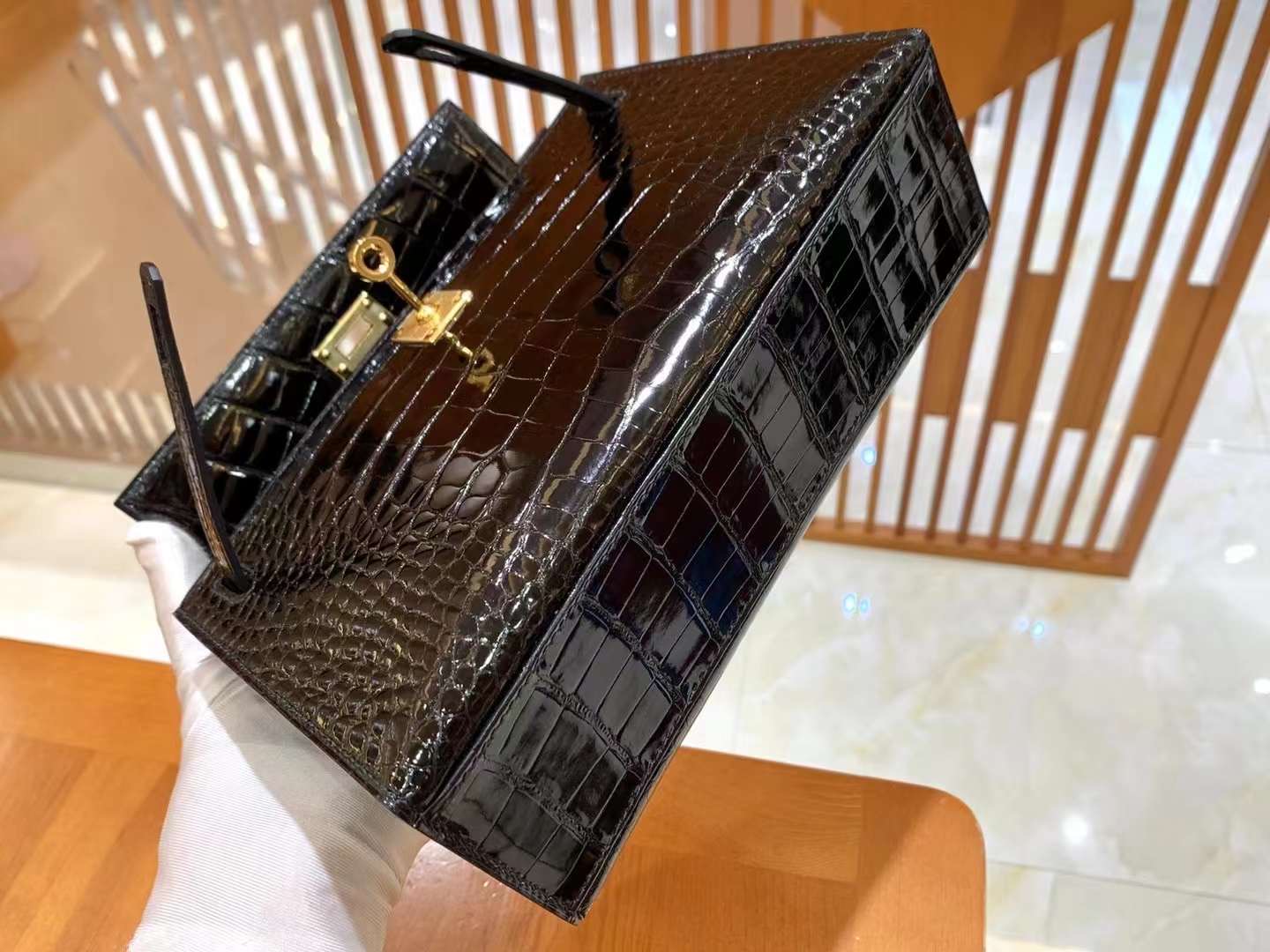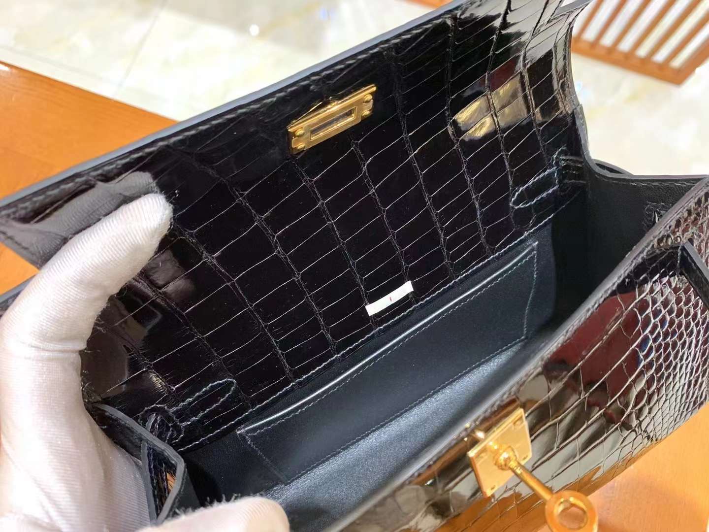 Mini Kelly Generation 22cm. Shiny Alligator leather. Black. Gold Buckle