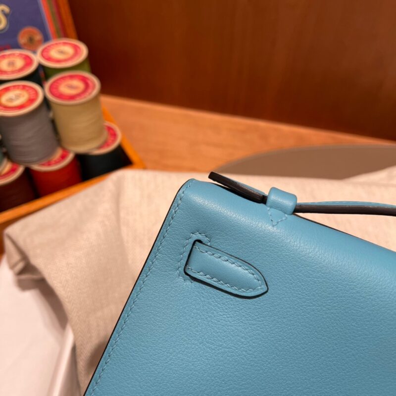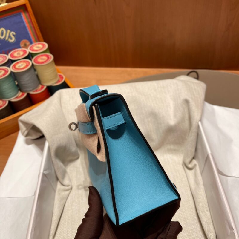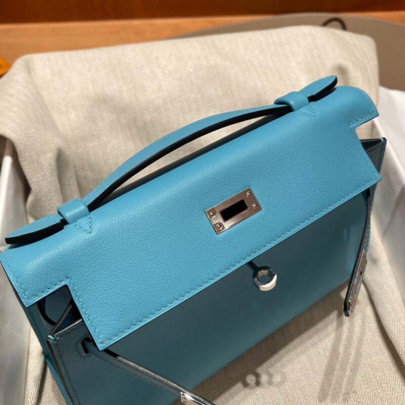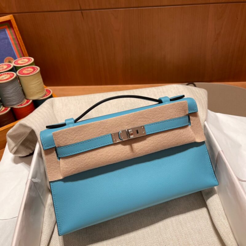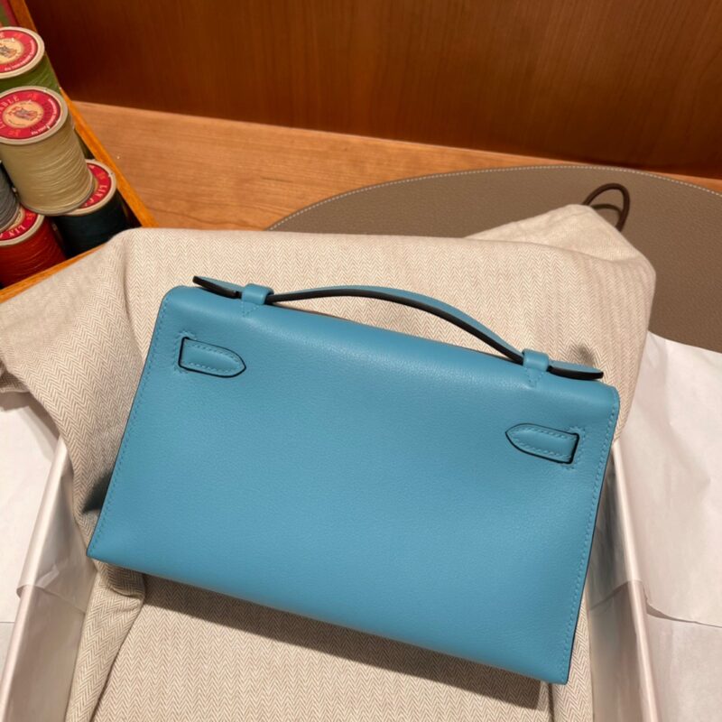 Kelly Pochette Generation Evening Bag Clutch It is a perfect partner with the pig nose chain. Swift Leather. P3 Blue de Nord. Silver Buckle.