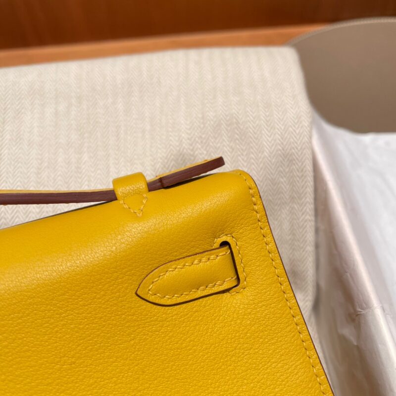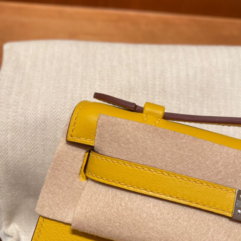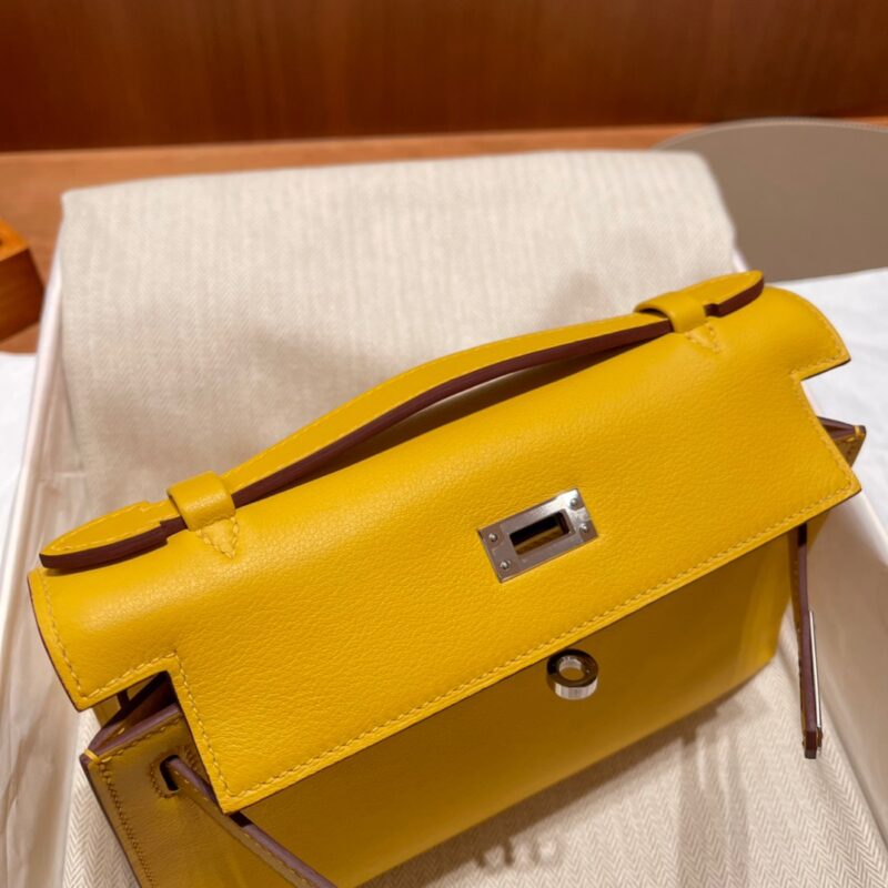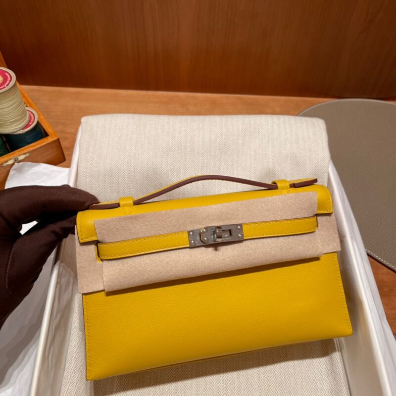 Kelly Pochette Generation Evening Bag Clutch It is a perfect partner with the pig nose chain. Silver Buckle. Swift leather. 9D Jaune Ambre.