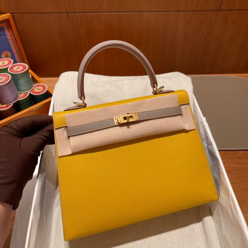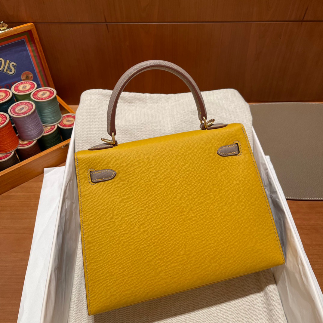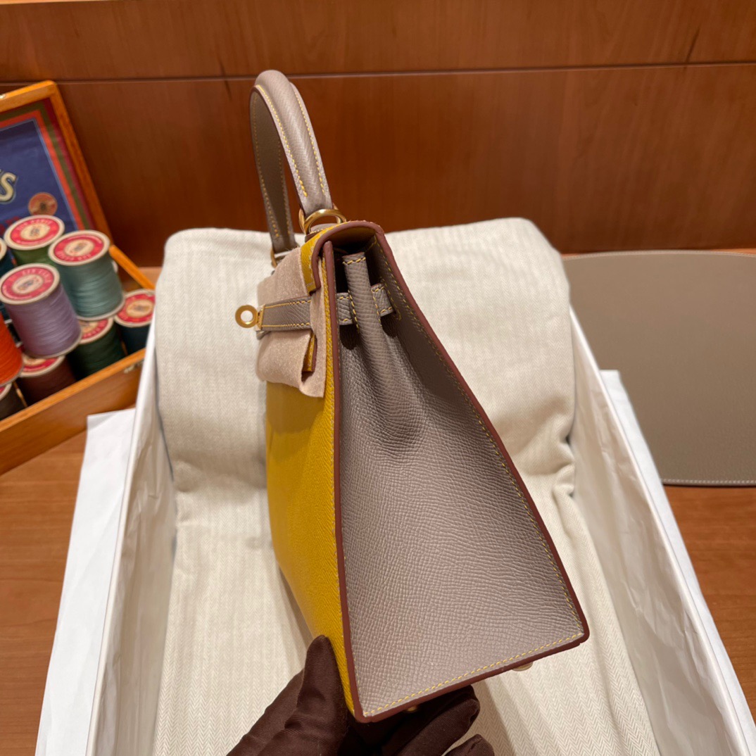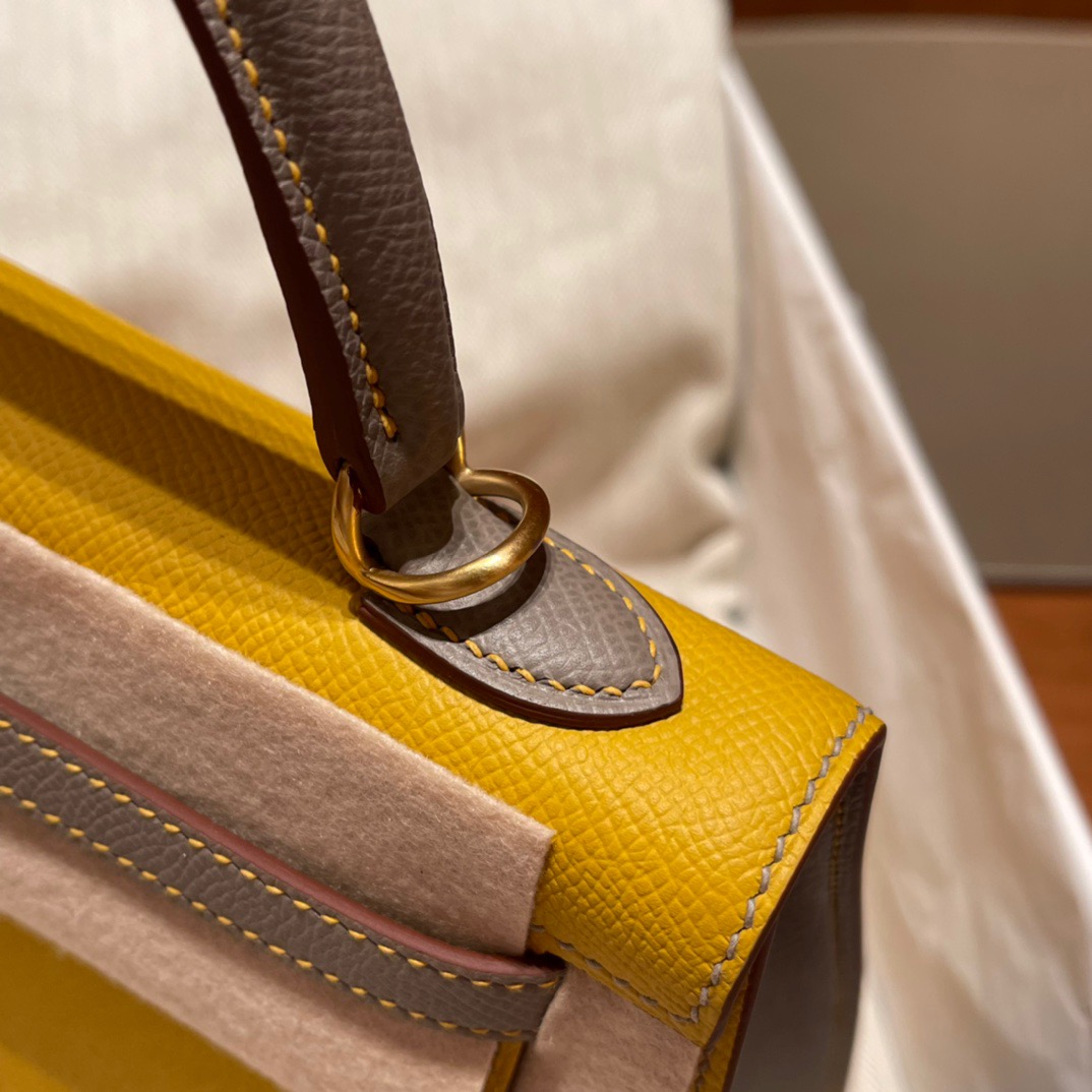 Special Order Kelly 25cm Palm Pattern Epsom leather. 9D Amber Yellow with m8 Asphalt Gray. Frosted Gold Buckle