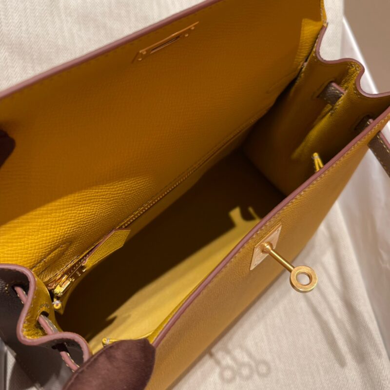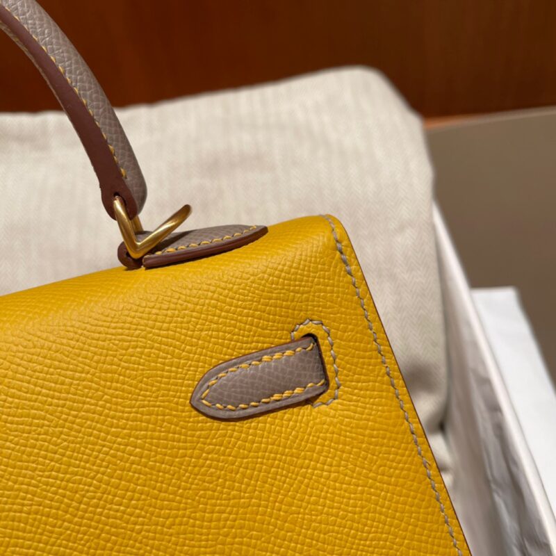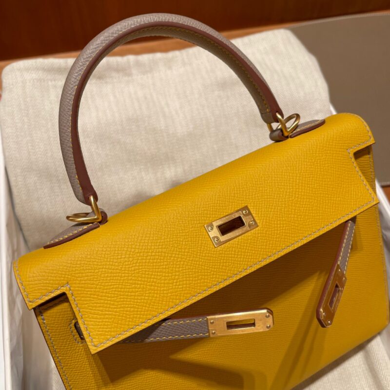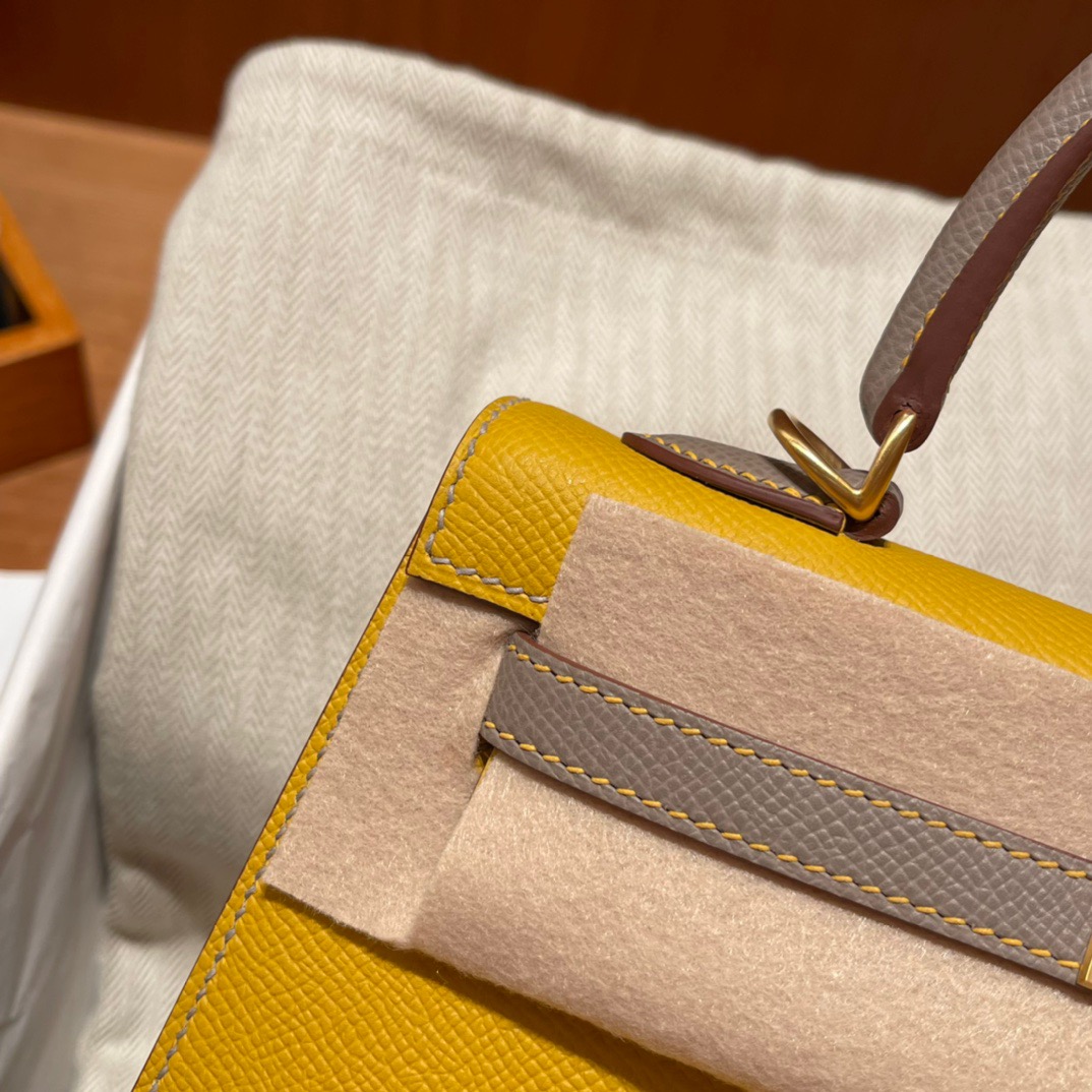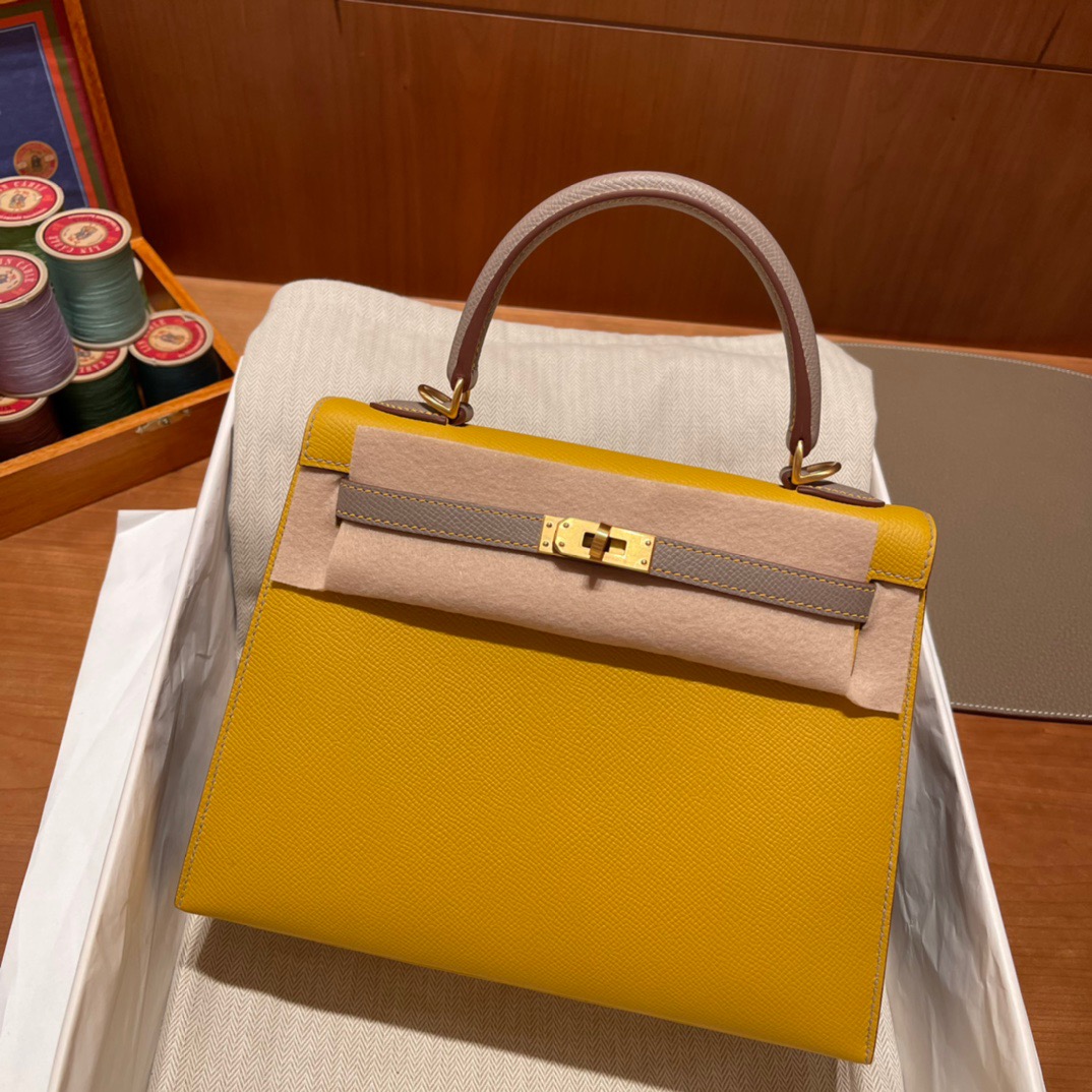 Special Order Kelly 25cm Palm Pattern Epsom leather. 9D Amber Yellow with m8 Asphalt Gray. Frosted Gold Buckle