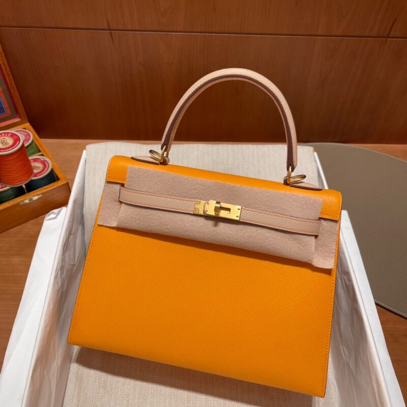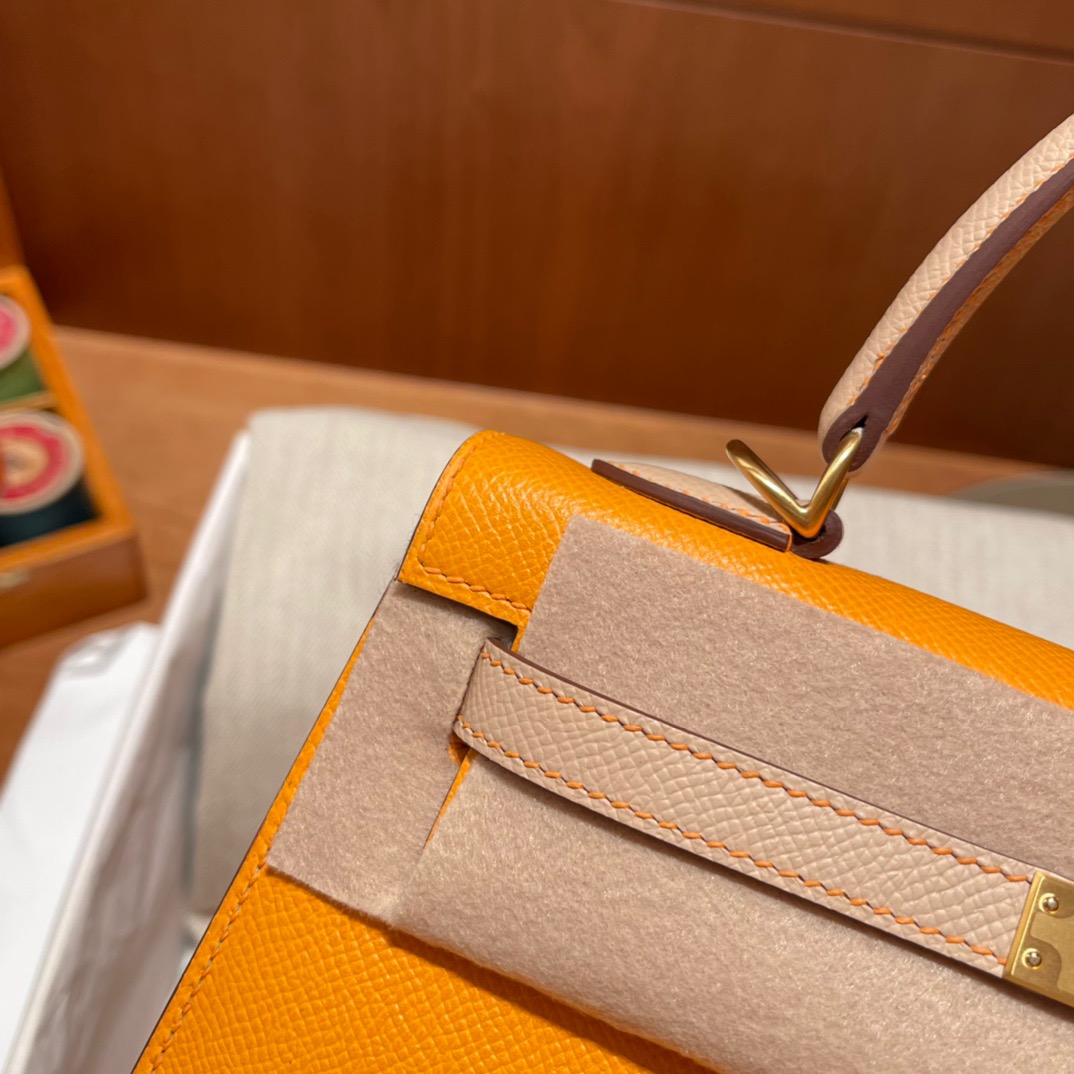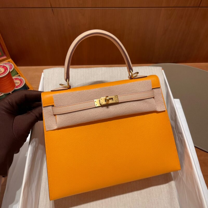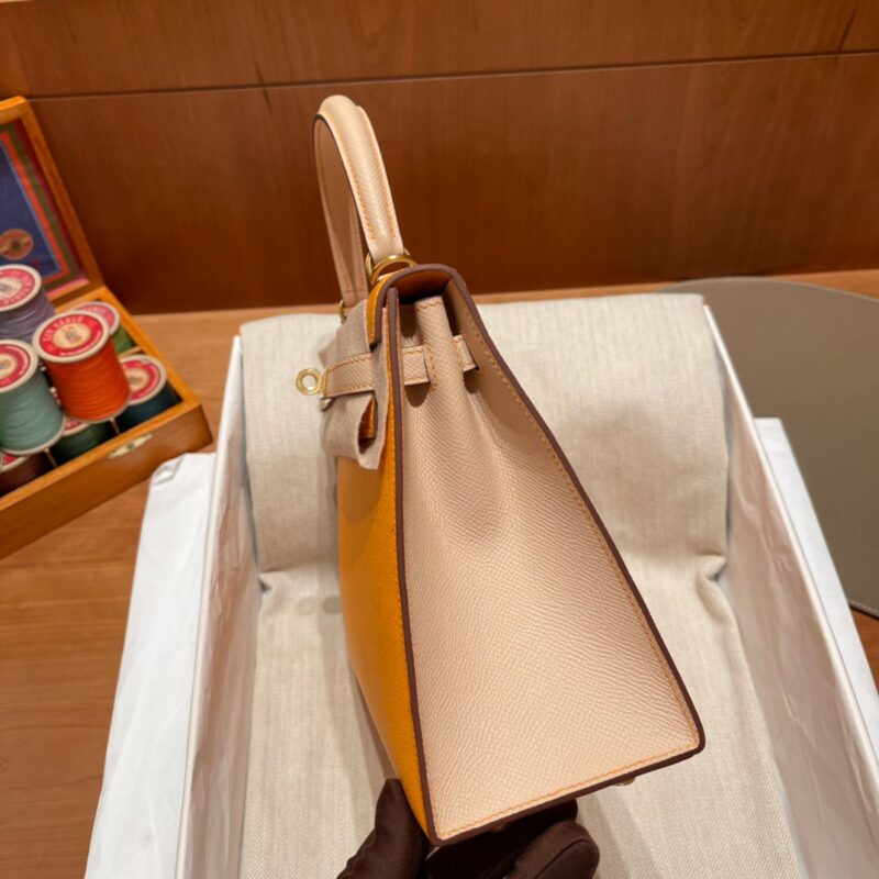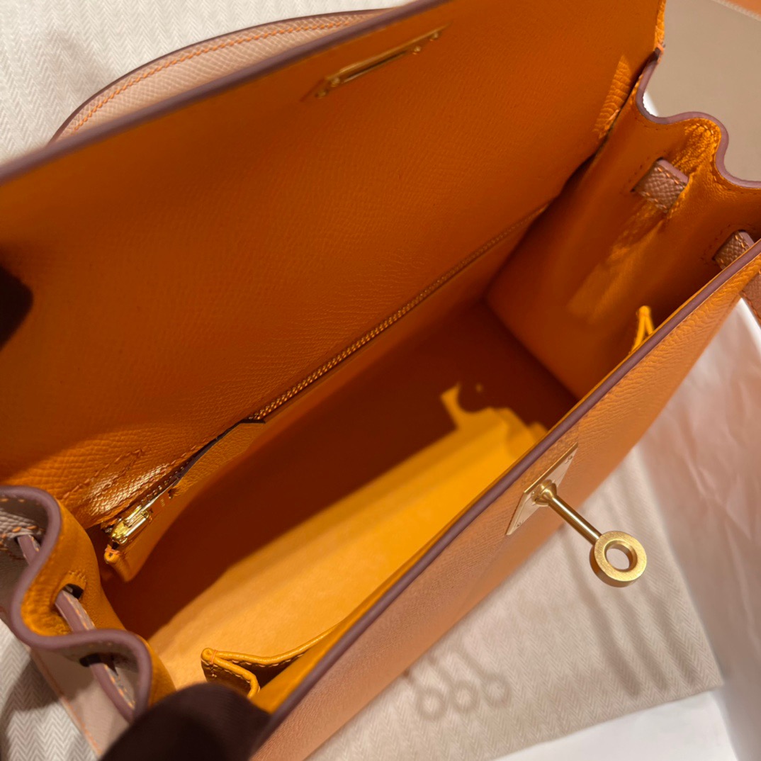Kelly so 25cm Epsom Leather 9V Sun Yellow/S2 Trench Coat Grey. Frosted Gold Buckle