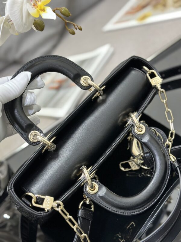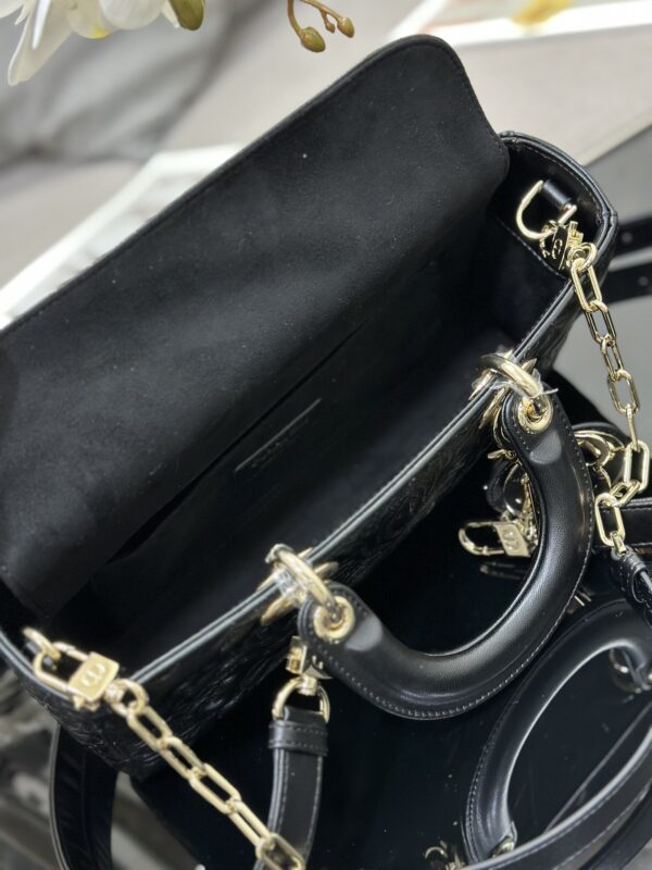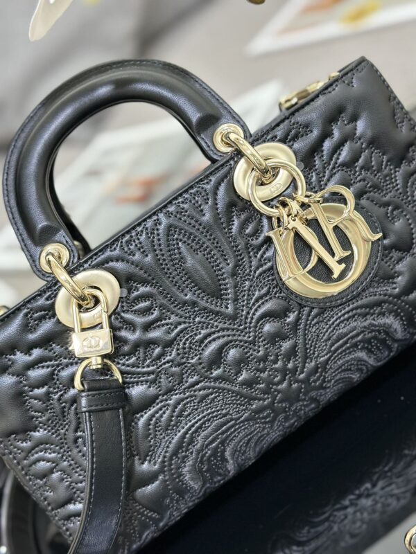 Lady D-Joy horizontal panel in embossed black features bold quilted detailing with cannage topstitching and hand-embroidered Ornamental motifs for an Andalusian Baroque feel and individual style. Elevated by the D.I.O.R. charm in light gold-finish metal, adding movement and sparkle to the delicate silhouette. The medium size features a detachable chain shoulder strap and an adjustable, detachable leather shoulder strap that can be carried by hand, on the shoulder or crossbody, ideal for everyday styling. Detachable chain shoulder strap. Detachable and adjustable leather shoulder strap. Dust bag included. Dimensions: 26 x 13.5 x 5 cm, Model: M0540