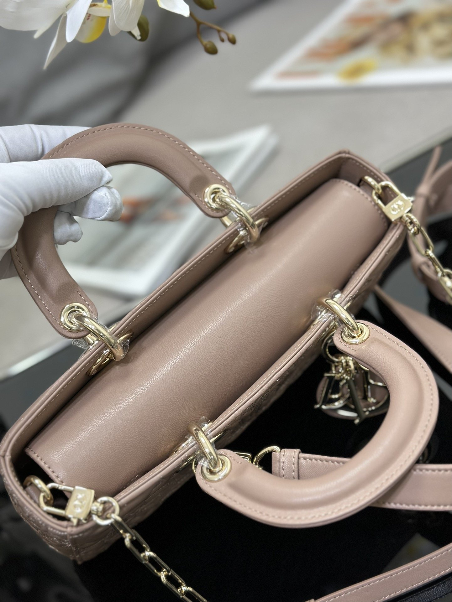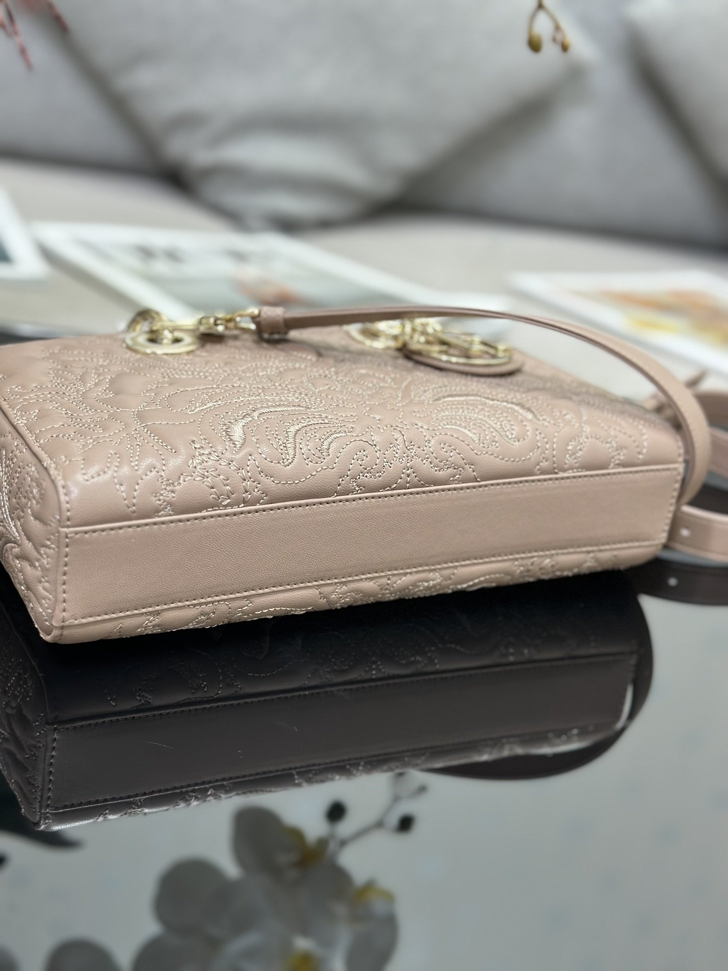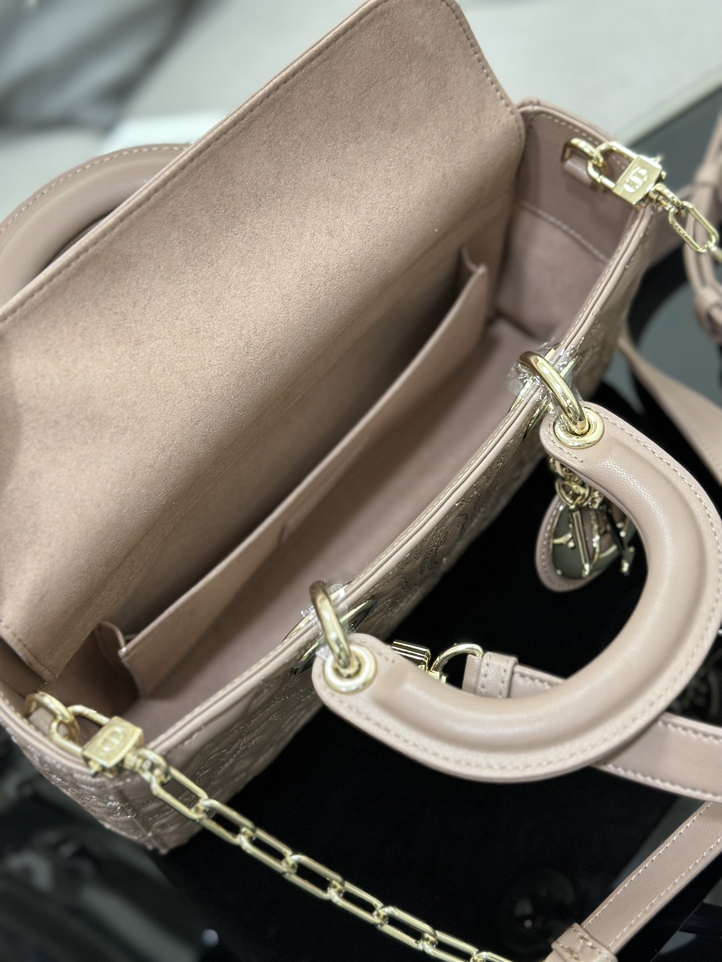 Lady D-Joy cross-panel embossed pink features bold quilted detailing with cannage topstitching and hand-embroidered Ornamental motifs for an Andalusian baroque feel and individual style. Elevated by the D.I.O.R. charm in light gold-finish metal, adding movement and sparkle to the delicate silhouette. The medium size features a detachable chain shoulder strap and an adjustable, detachable leather shoulder strap that can be carried by hand, on the shoulder or crossbody, ideal for everyday styling. Detachable chain shoulder strap. Detachable and adjustable leather shoulder strap. Dust bag included. Dimensions: 26 x 13.5 x 5 cm, Model: M0540