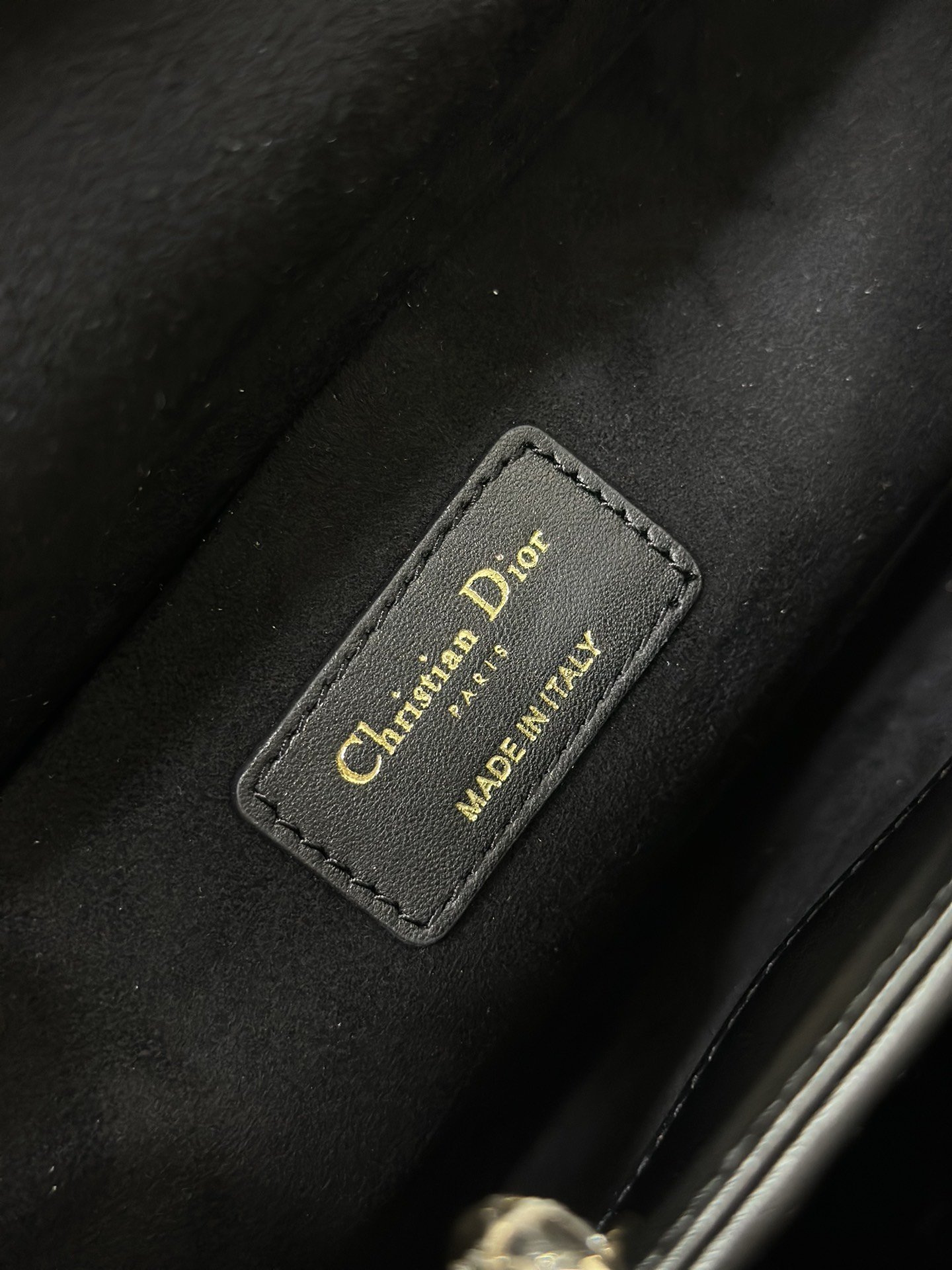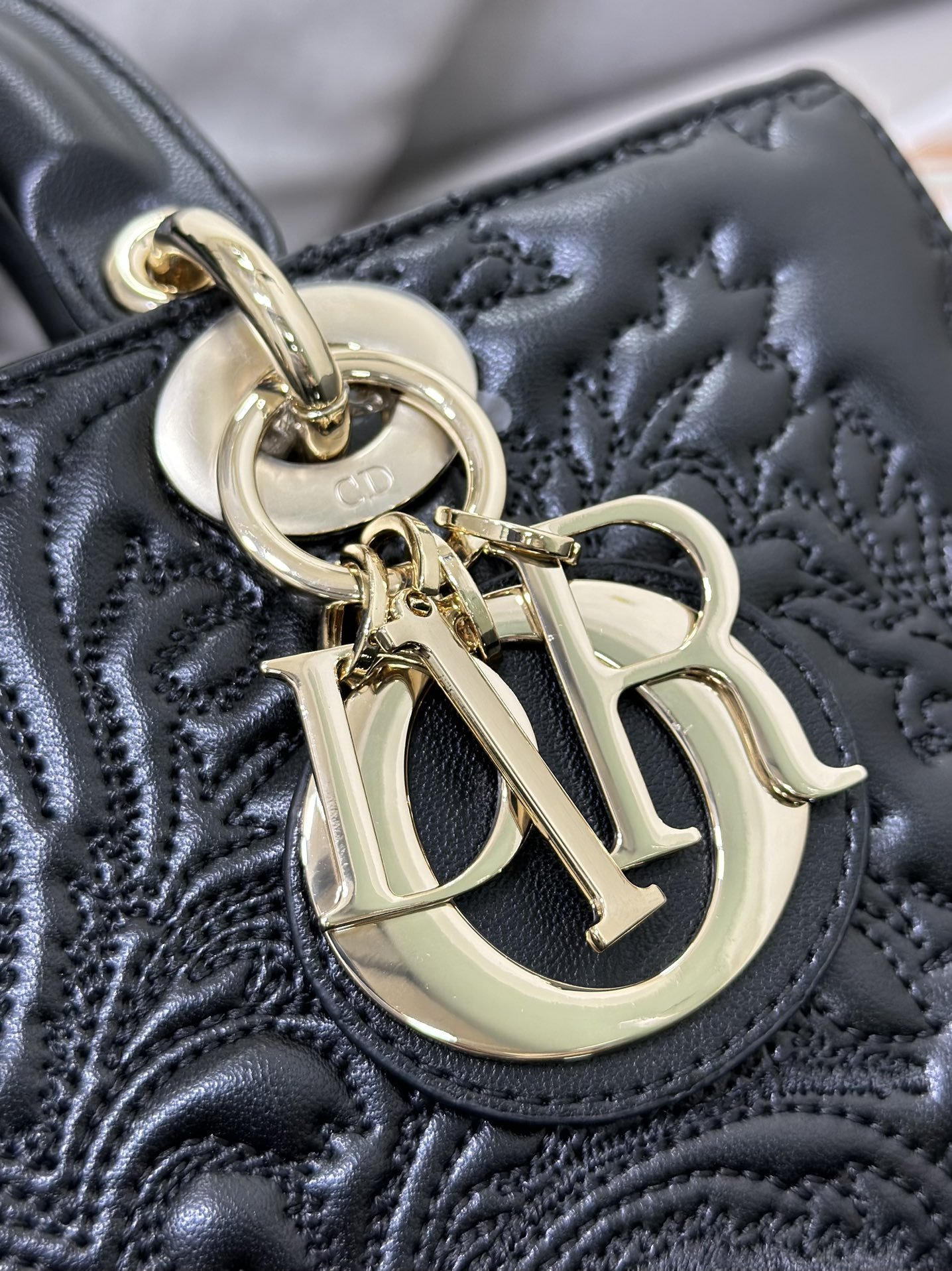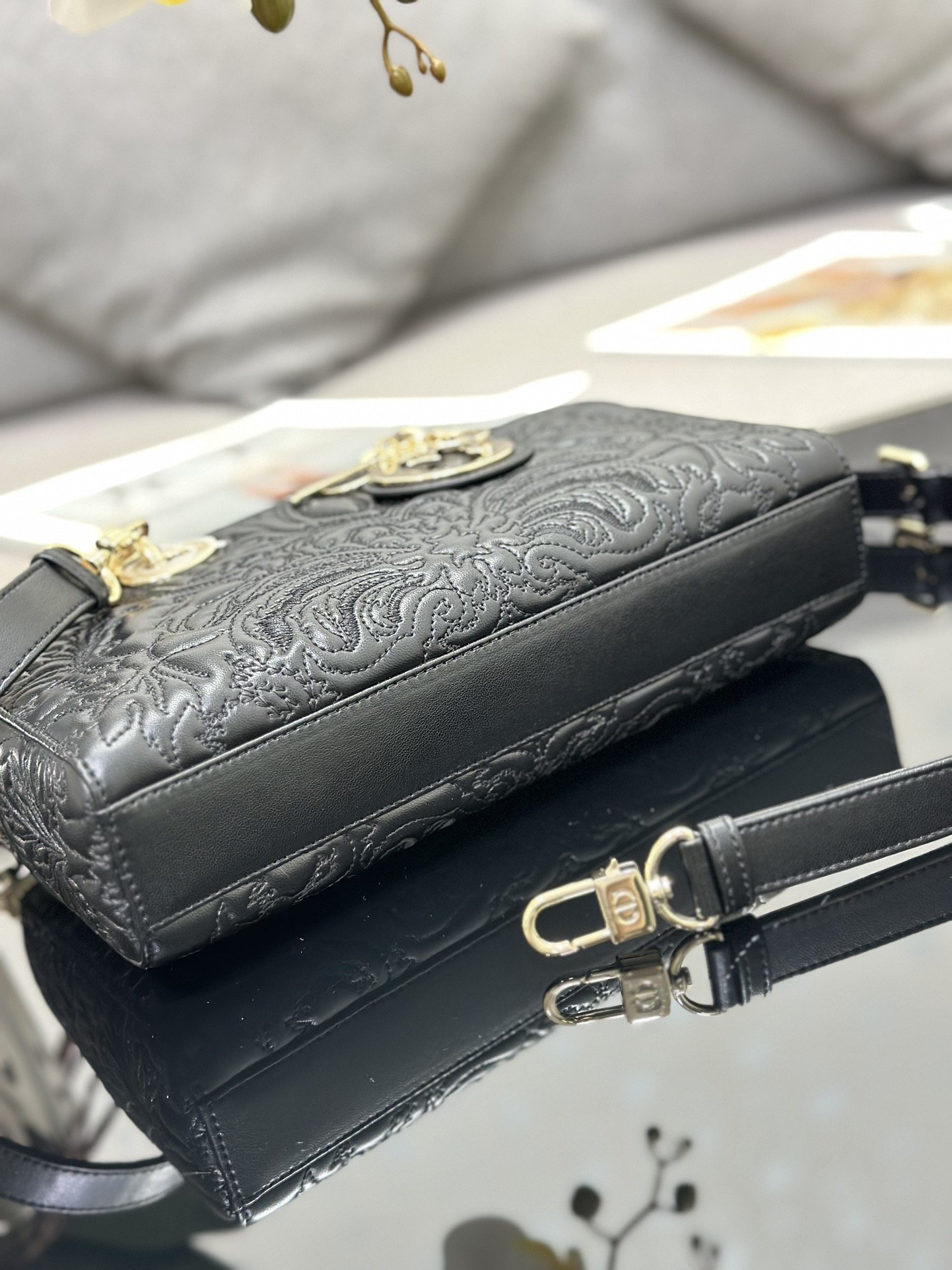Lady D-Joy horizontal panel in embossed black features bold quilted detailing with cannage topstitching and hand-embroidered Ornamental motifs for an Andalusian Baroque feel and individual style. Elevated by the D.I.O.R. charm in light gold-finish metal, adding movement and sparkle to the delicate silhouette. The medium size features a detachable chain shoulder strap and an adjustable, detachable leather shoulder strap that can be carried by hand, on the shoulder or crossbody, ideal for everyday styling. Detachable chain shoulder strap. Detachable and adjustable leather shoulder strap. Dust bag included. Dimensions: 26 x 13.5 x 5 cm, Model: M0540