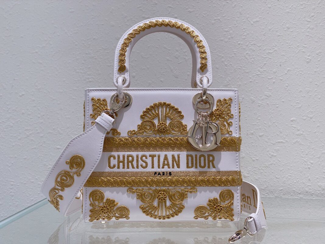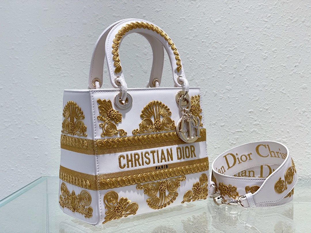 The Lady D-Lite bag combines timeless elegance with the Dior brand’s modern edge. Crafted from white cowhide leather and embroidered throughout with a gold filigree effect pattern, it interprets Mr. Dior’s tapestries in a poetic design. The “CHRISTIAN DIOR PARIS” logo on the front is complemented by a metal-clad metal “D.I.O.R.” charm, which adds a touch of flair to the delicate silhouette. The medium model features a wide, detachable, reversible, embroidered shoulder strap that can be worn by hand or cross-body. “CHRISTIAN DIOR PARIS” logo on the front Removable wide shoulder strap Internal zip pocket Large patch pocket Can be worn with other embroidered straps Size 24cm
