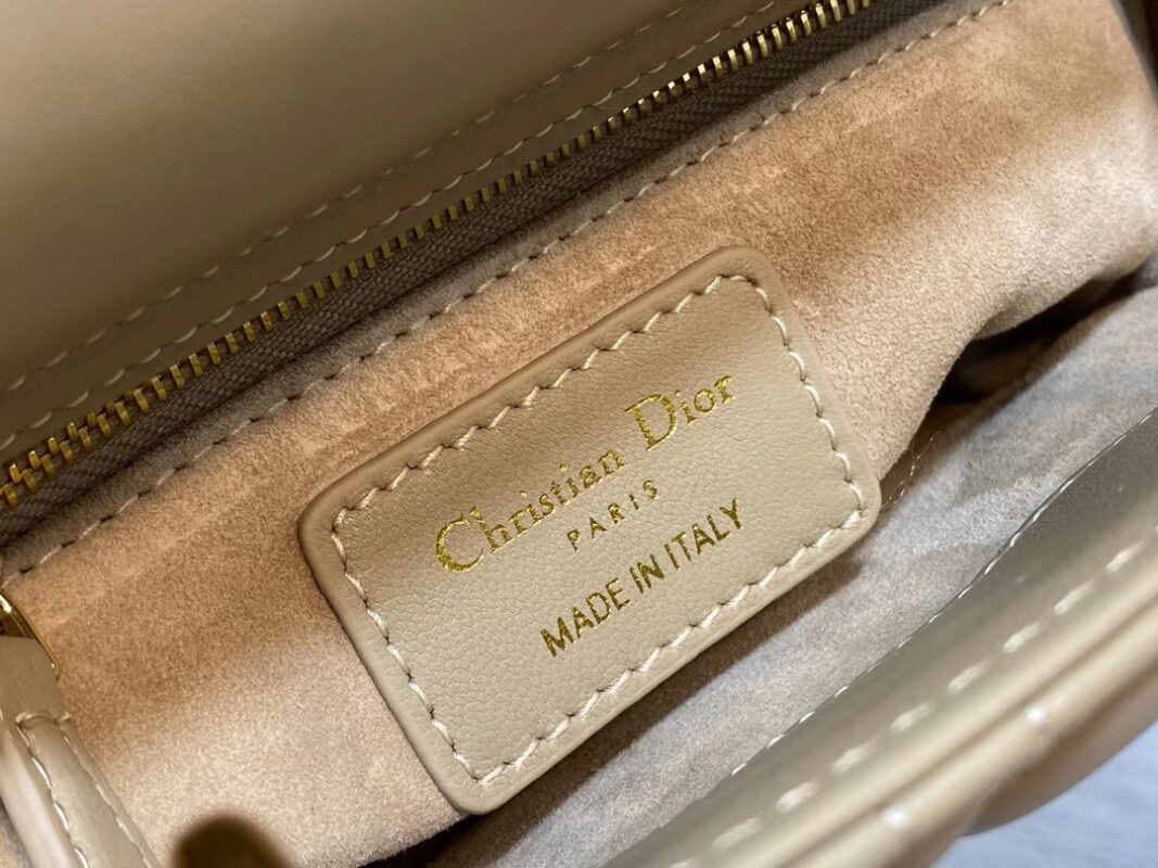 Lady Dior Bag in Apricot Lambskin epitomizes Dior’s vision for elegance and beauty. Combining refined and dignified temperament with a sleek and modern style, it is an enduring classic. The signature metal ‘D.I.O.R.’ charm in a light gold finish adds a touch of movement to the delicate silhouette, with an adjustable leather shoulder strap. A detachable metal chain shoulder strap. Size: 17x15x7cm