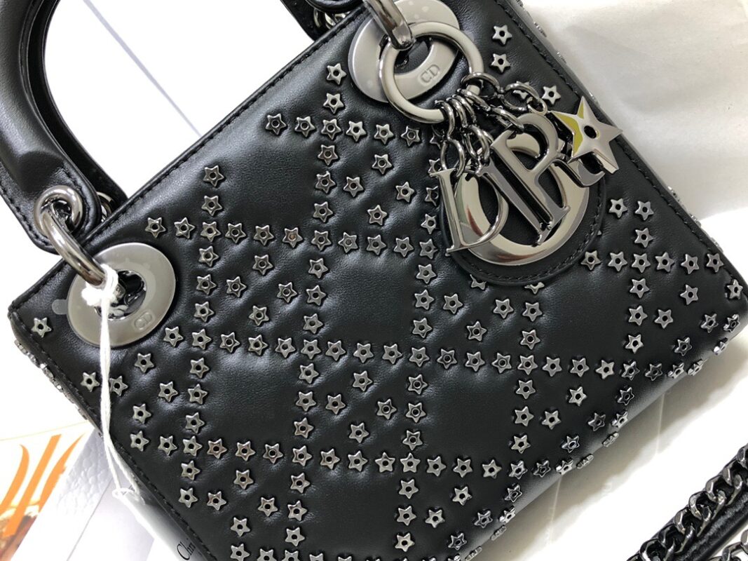 Lady Dior three-square five-pointed star blackFully handmade, carefully crafted from sheep leather, with imported sheep tendons inside, Sophisticated and elegant styles are timeless. The Lucky Star Cannage pattern is created with hand-decorated stars, a reinterpretation of the iconic pattern. Style it with a metal “D.I.O.R.” charm with a light gold finish. With the detachable chain shoulder strap, it can be carried by hand or cross-body, making it the ideal companion for evening wear. Detachable chain shoulder strap, interior zip pocket, can be combined with other embroidered shoulder straps.Dimensions: 17 x 15 x 7 cm