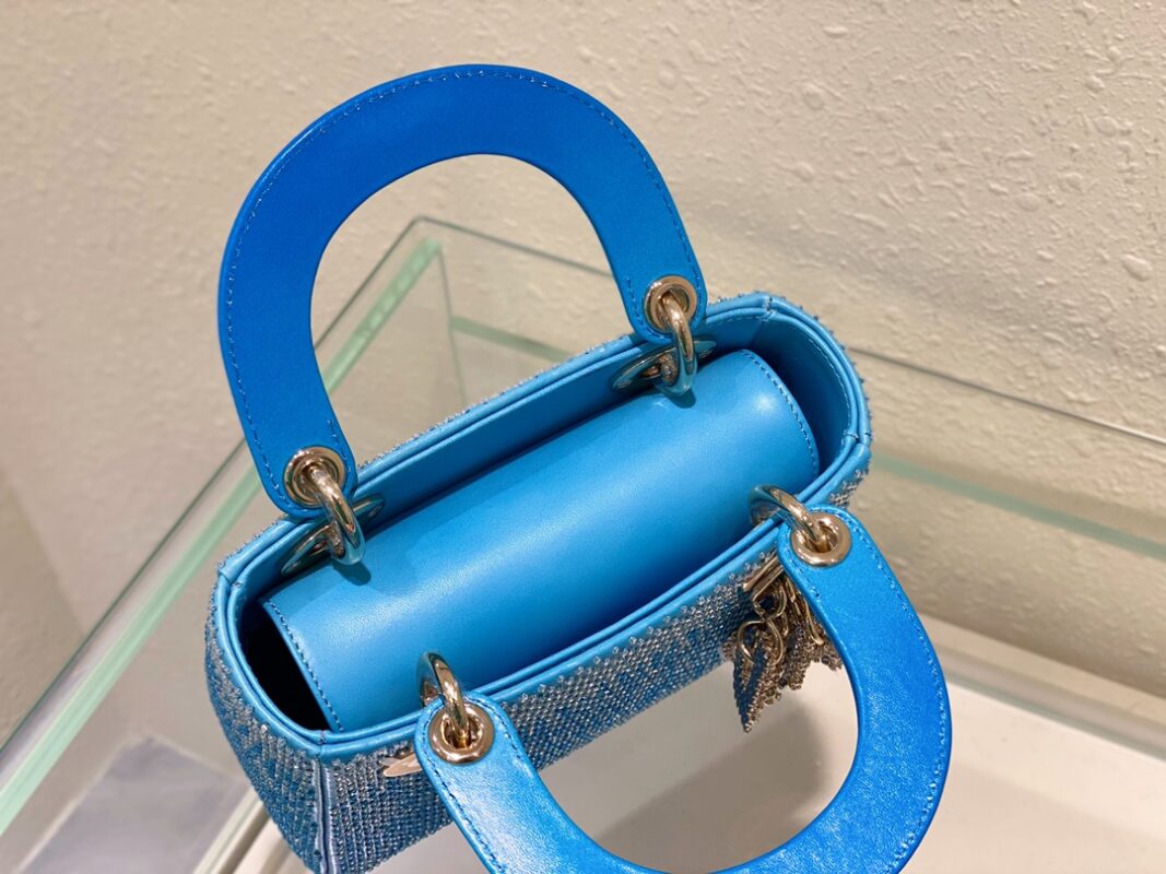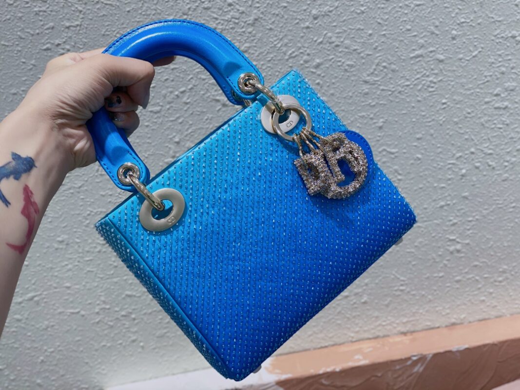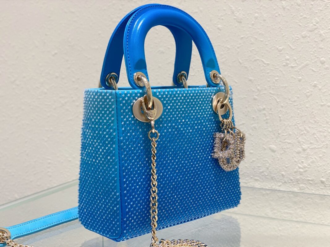 Lady Dior 17 Blue Metallic This Lady Dior bag epitomizes Dior’s profound vision of elegance and beauty. The sleek and elegant design is timeless. Crafted from metallic blue sheepskin, the textured effect is accentuated by gradient effects and embroidered beading, accented with a metal ‘D.I.O.R.’ charm in a light gold-finished finish, adding a flair to the delicate silhouette. The mini style, with its detachable chain shoulder strap, can be carried by hand or cross-body, making it the ideal companion for evening wear. Detachable chain shoulder strap. Internal zip pocket. Can be worn with other embroidered straps. Dust bag included Size 17cm