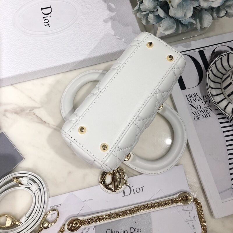The Lady Dior three-panel white lambskin bag epitomizes Dior’s insight into elegance and beauty. Combining refined and dignified temperament with a sleek and modern style, it is an enduring classic. The signature metal ‘D.I.O.R.’ charm in a light gold finish adds a touch of flair to the delicate silhouette, with an adjustable leather shoulder strap. A detachable metal chain shoulder strap. Size: 17x15x7cm