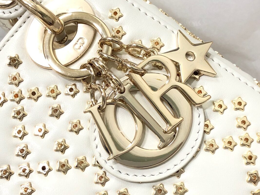 Lady Dior three-square five-pointed star white Fully handmade, carefully crafted from sheep leather, with imported sheep tendons inside, Sophisticated and elegant styles are timeless. The Lucky Star Cannage pattern is created with hand-decorated stars, a reinterpretation of the iconic pattern. Style it with a metal “D.I.O.R.” charm with a light gold finish. With the detachable chain shoulder strap, it can be carried by hand or cross-body, making it the ideal companion for evening wear. Detachable chain shoulder strap, interior zip pocket, can be combined with other embroidered shoulder straps.Dimensions: 17 x 15 x 7 cm