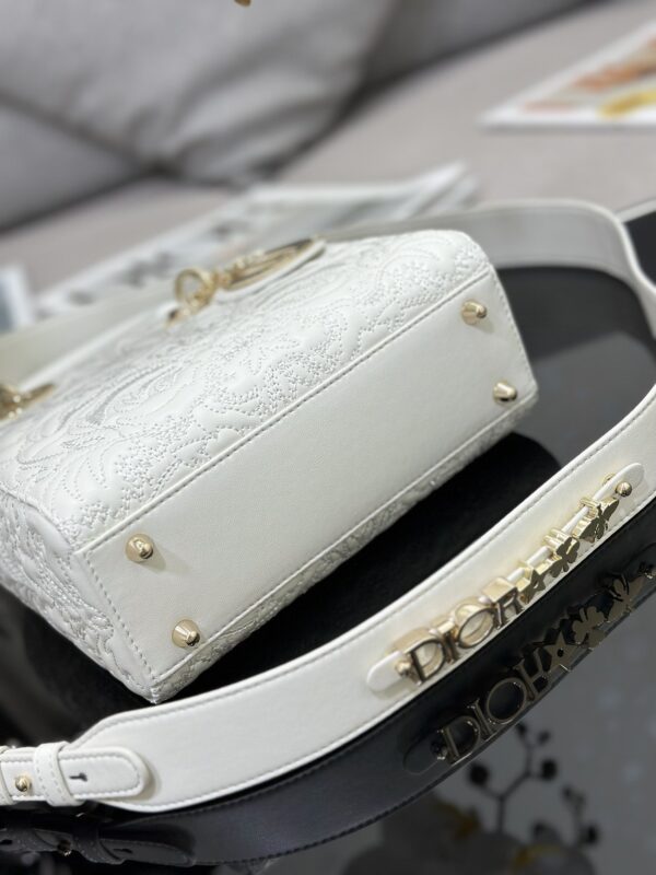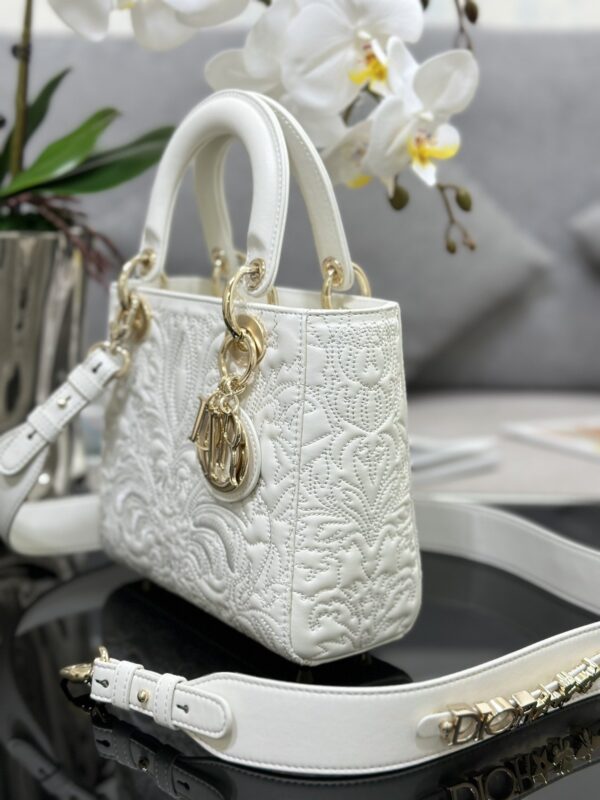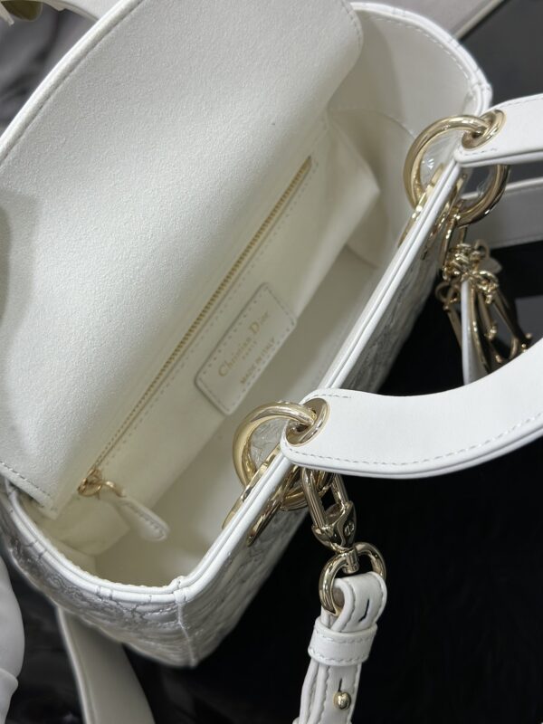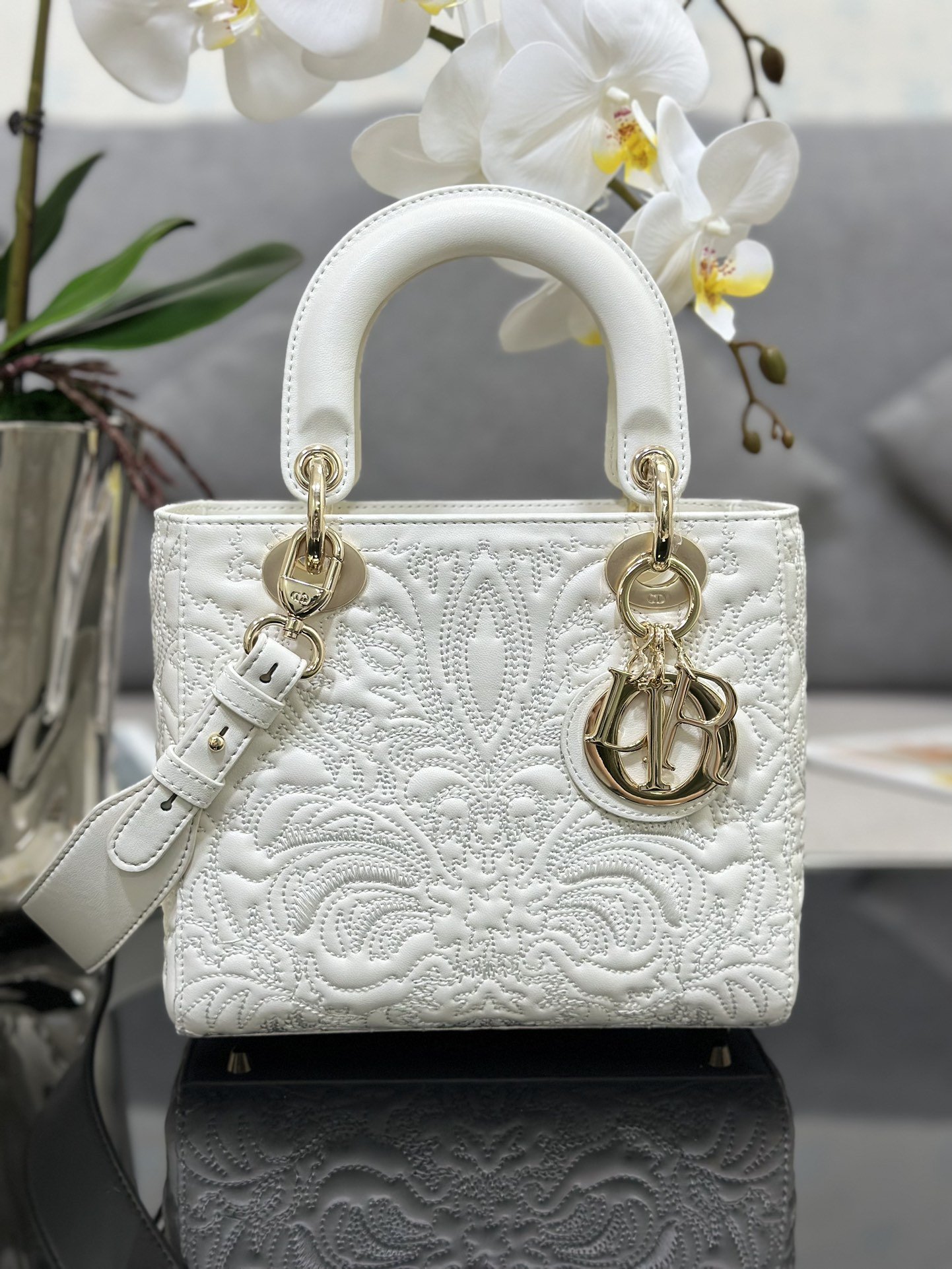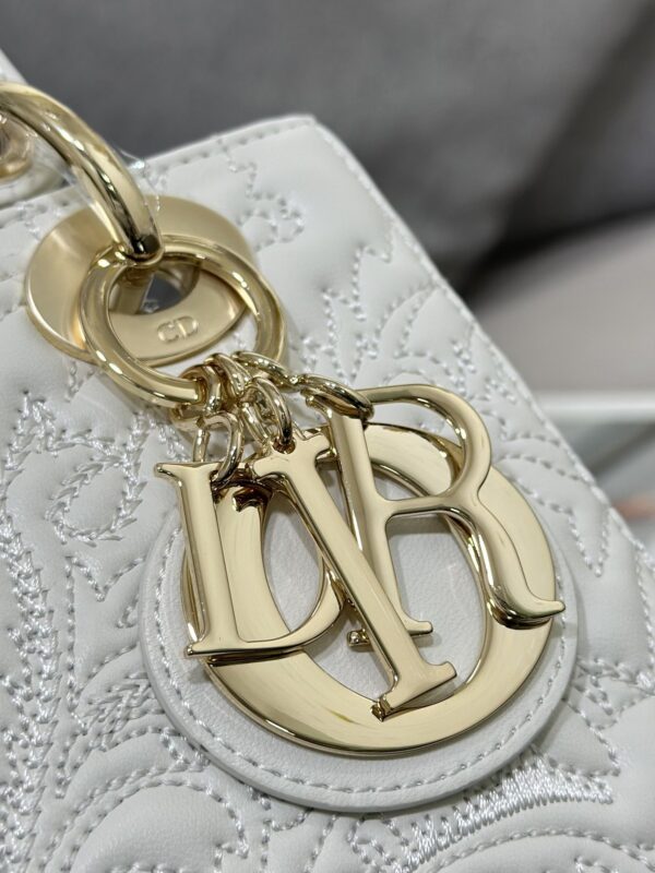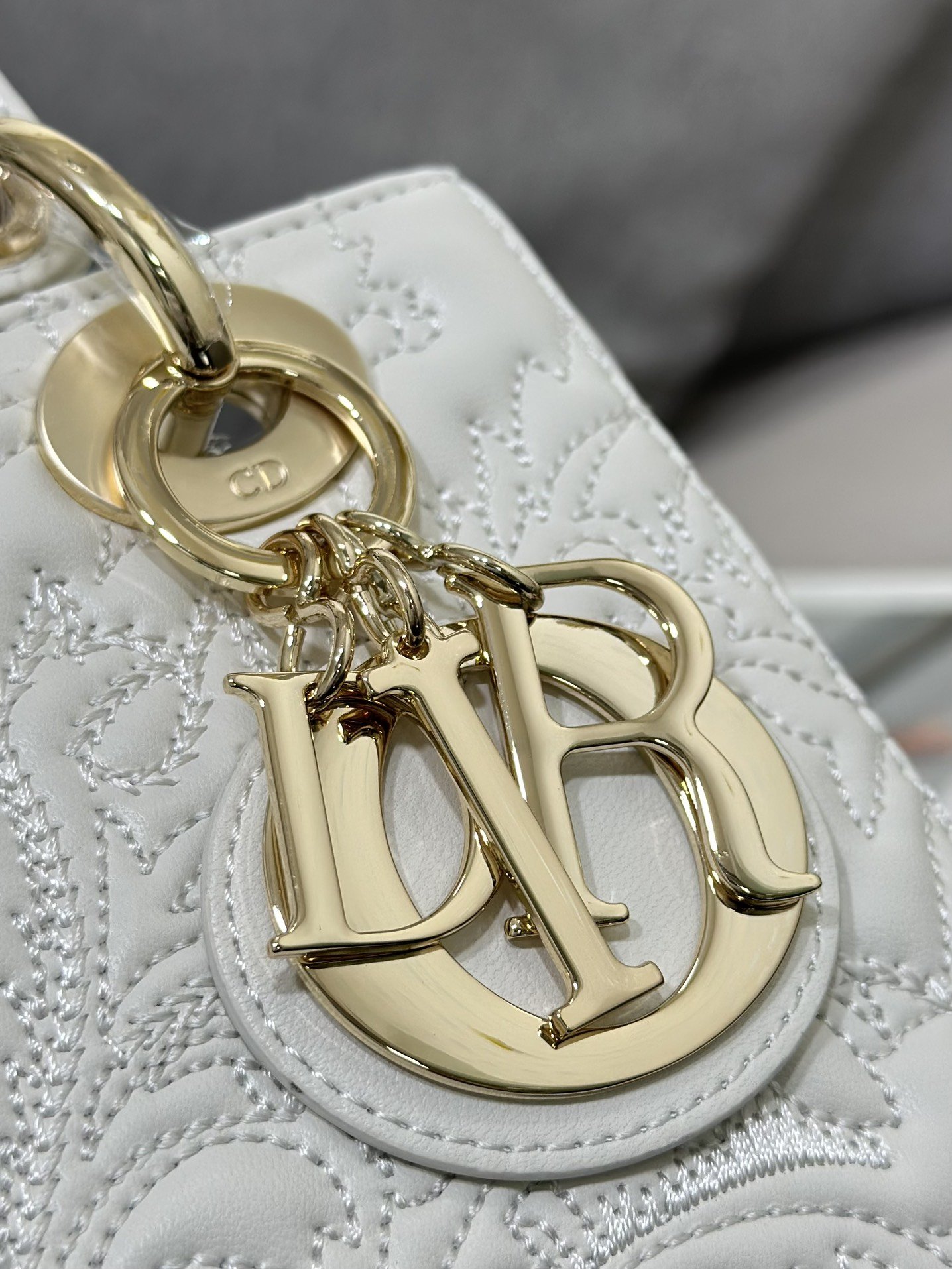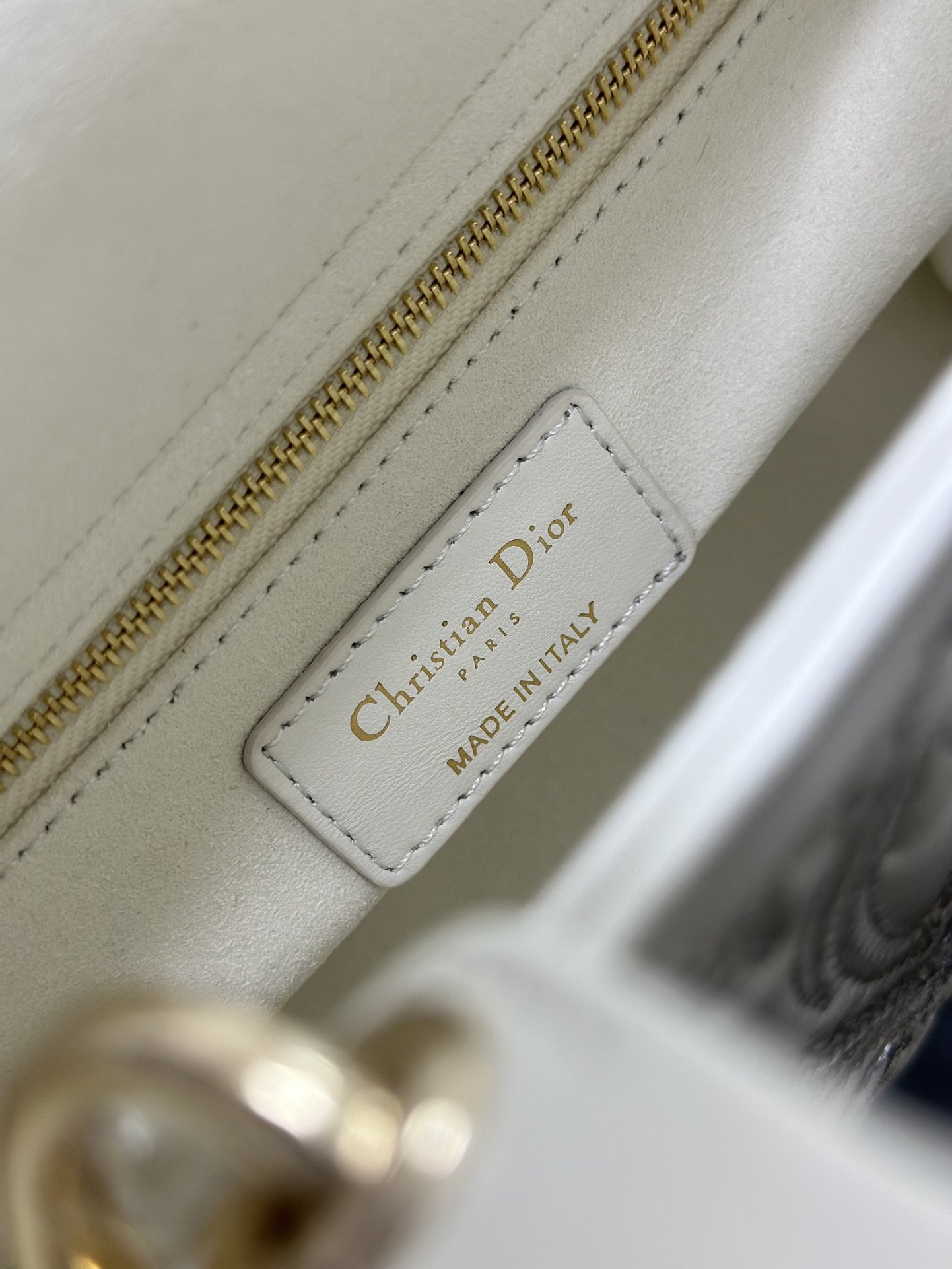The Lady Dior four-panel embossed white features striking quilted details with cannage topstitching and an Ornamental motif for an Andalusian baroque and individual style, with a chic and timeless design that’s timeless. Embellished with a D.I.O.R. charm in light gold-finish metal, it adds a touch of movement to the delicate silhouette. Pair it with wide shoulder straps that you can personalize, or add new badges on the go. Pale gold-tone metal accessories, personalized wide shoulder strap embellished with Dior emblem, can be carried by hand or on the shoulder or cross-body, dimensions: 20 x 16.5 x 8 cm