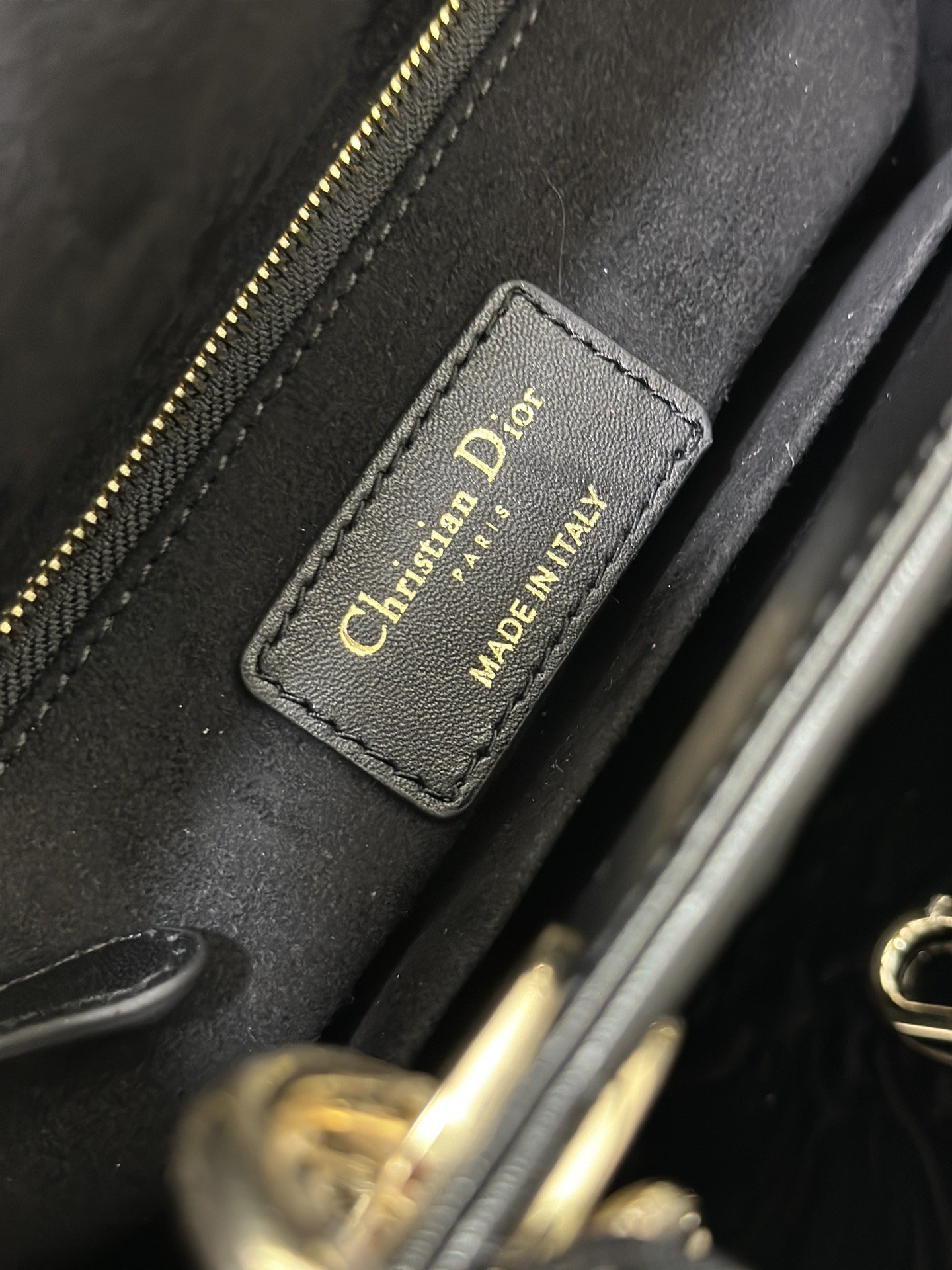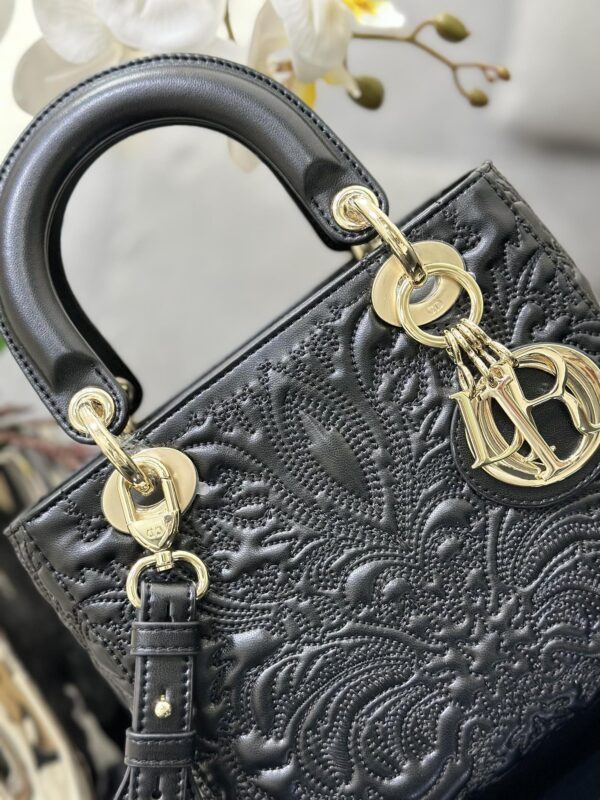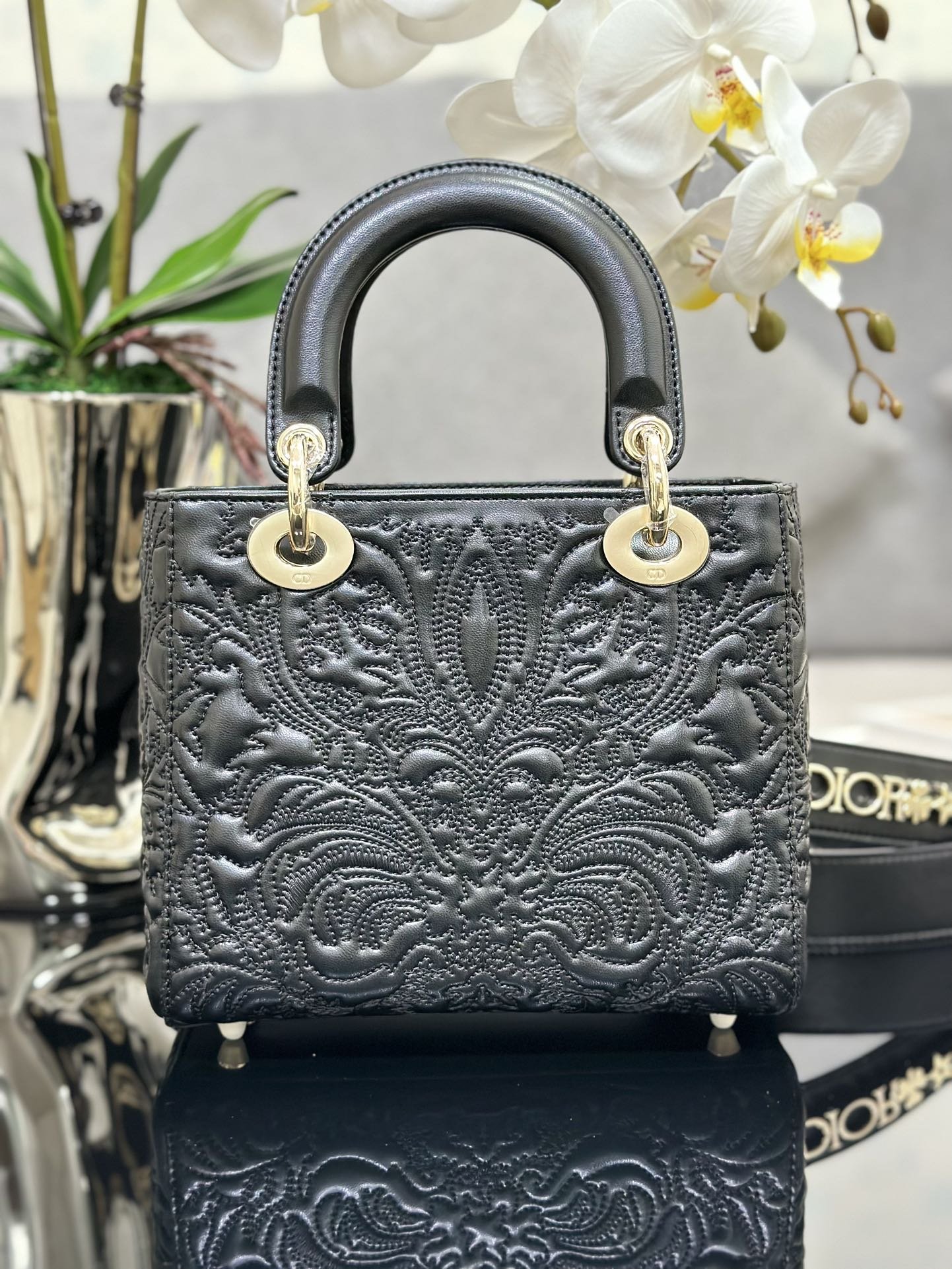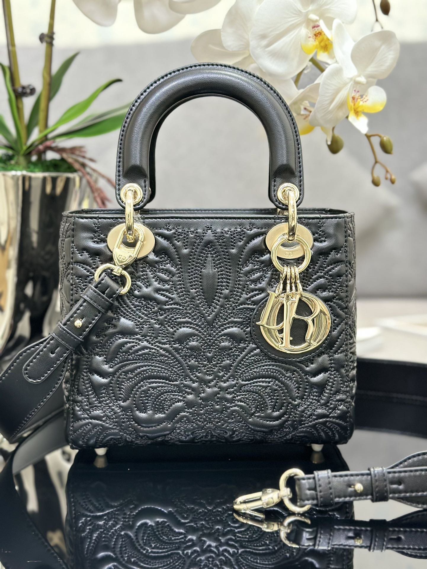 The Lady Dior four-panel embossed black features striking quilted details with cannage topstitching and an Ornamental motif for an Andalusian baroque and individual style, with a chic and timeless design that’s timeless. Embellished with a D.I.O.R. charm in light gold-finish metal, it adds a touch of movement to the delicate silhouette. Pair it with wide shoulder straps that you can personalize, or add new badges on the go. Pale gold-tone metal accessories, personalized wide shoulder strap embellished with Dior emblem, can be carried by hand or on the shoulder or cross-body, dimensions: 20 x 16.5 x 8 cm