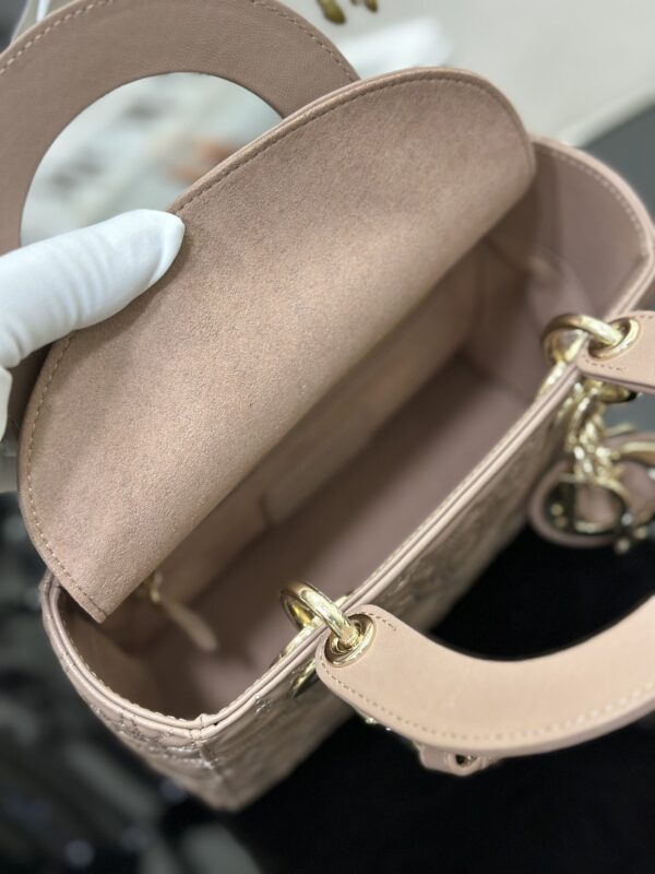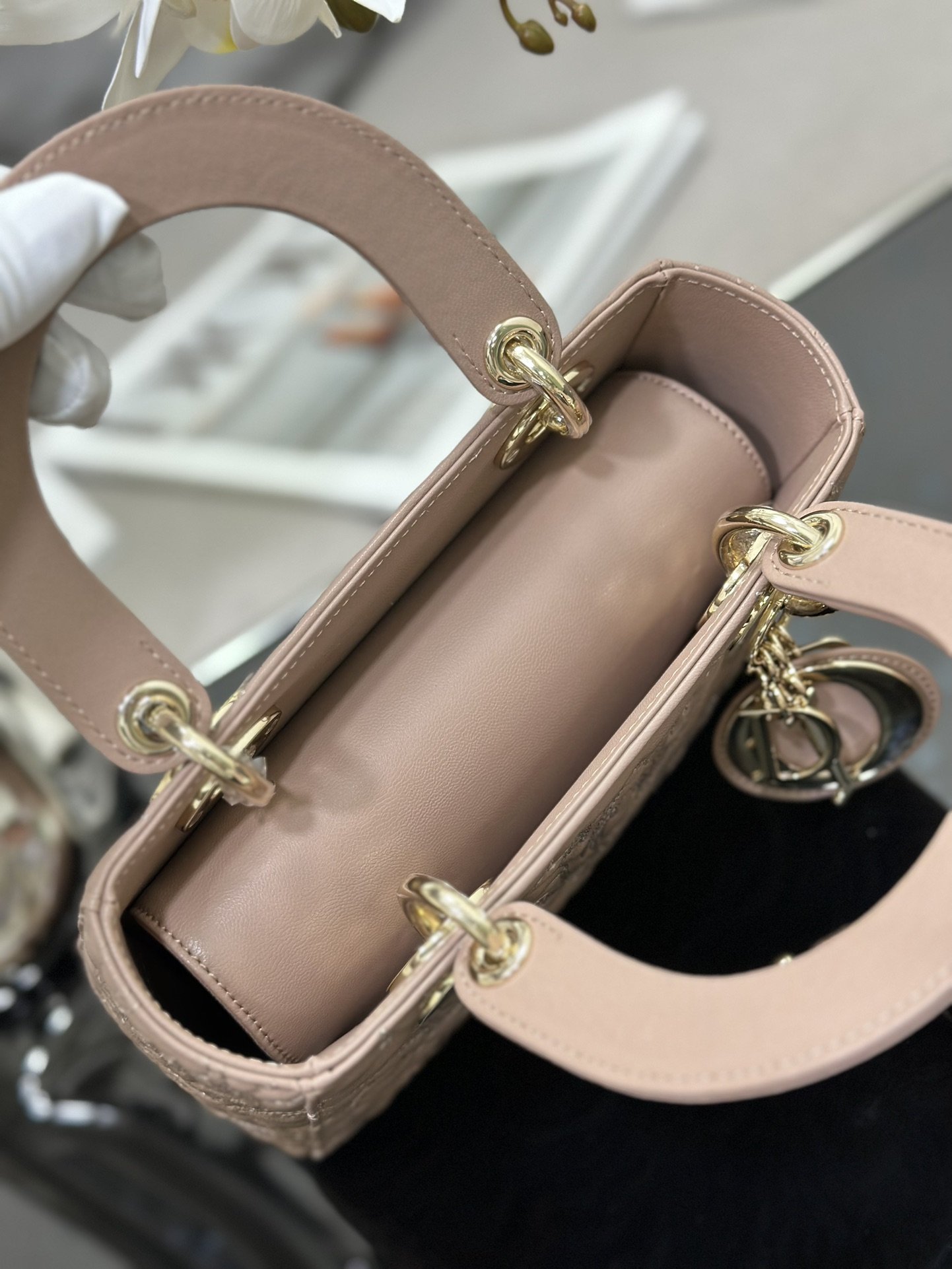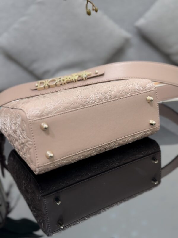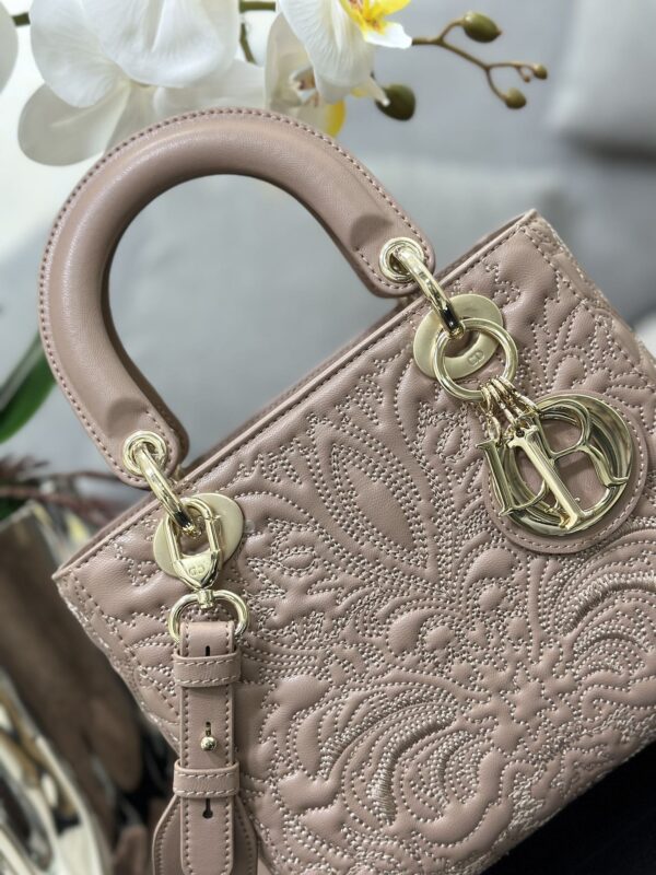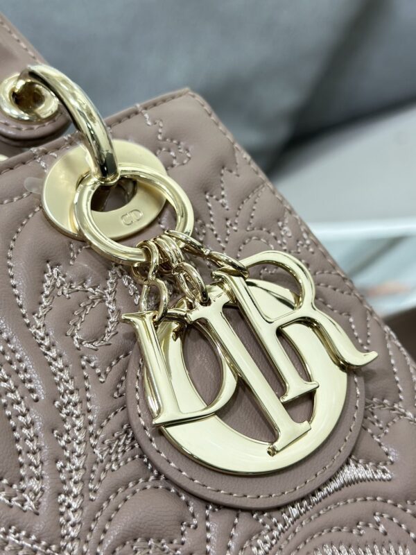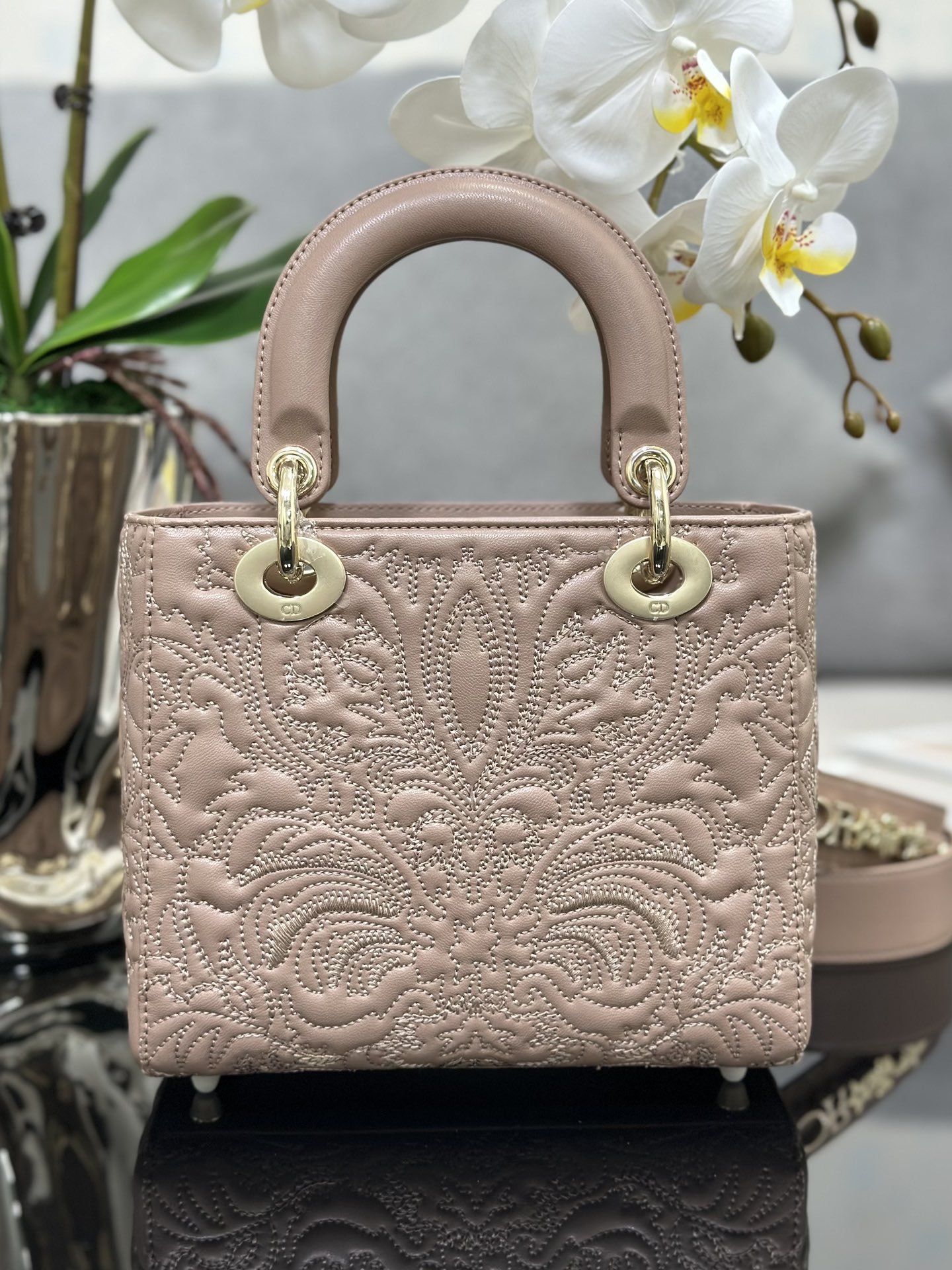 Lady Dior four-panel embossed pink features bold quilted details with cannage topstitching and an Ornamental motif for an Andalusian baroque and individual style in a chic and timeless design. Embellished with a D.I.O.R. charm in light gold-finish metal, it adds a touch of movement to the delicate silhouette. Pair it with wide shoulder straps that you can personalize, or add new badges on the go. Pale gold-tone metal accessories, personalized wide shoulder strap embellished with Dior emblem, can be carried by hand or on the shoulder or cross-body, dimensions: 20 x 16.5 x 8 cm