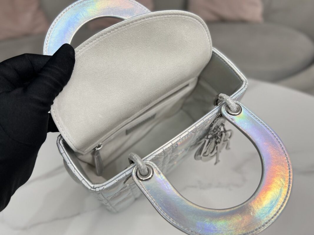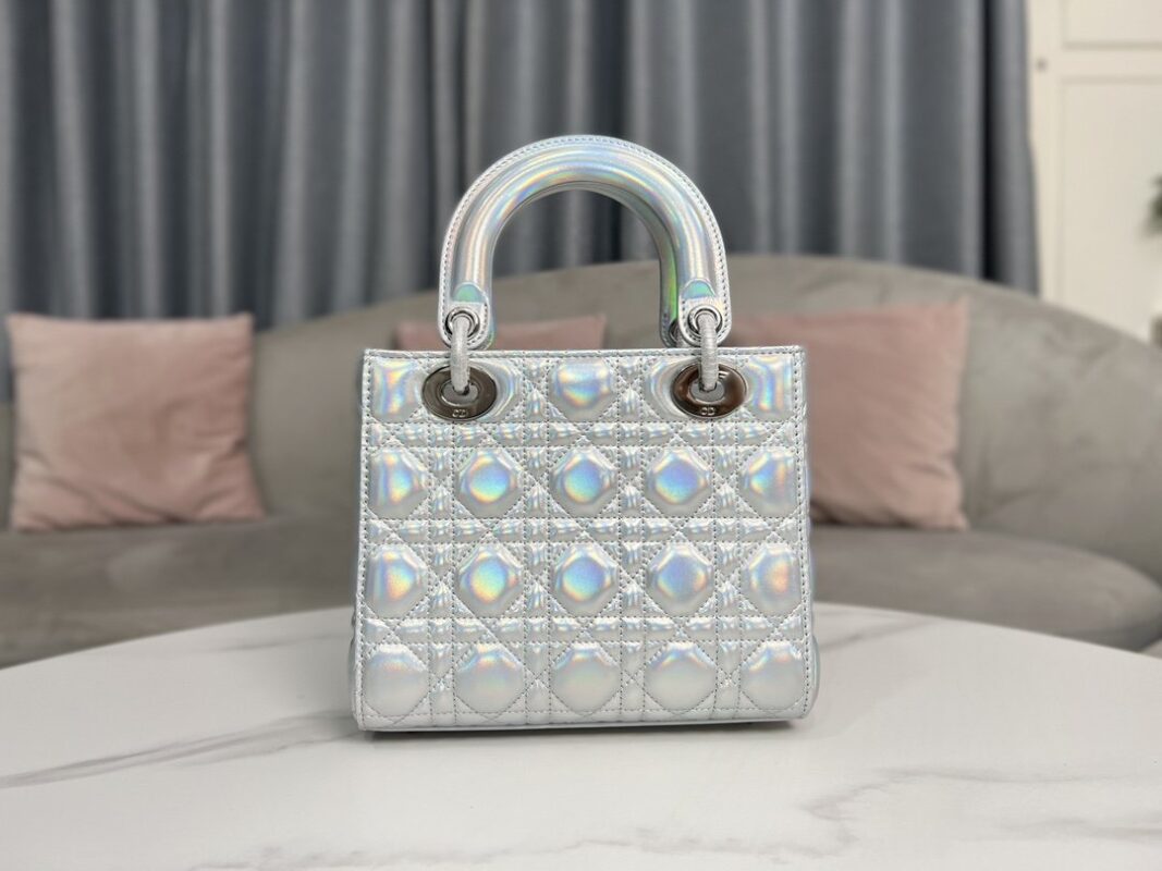 The Lady Dior My ABCDior bag from the Dior Or collection epitomizes Dior’s vision of elegance and beauty. Crafted in neon silver-tone metallic lambskin with bold quilted detailing with cannage topstitching, this timeless design is timeless. Embellished with a metal-clad metal D.I.O.R. charm, adding a touch of movement to the delicate silhouette. Small size with chic design, shoulder strap can be embellished with a badge for personalization, can be carried by hand or cross-body.