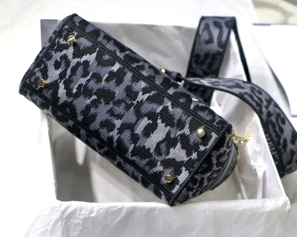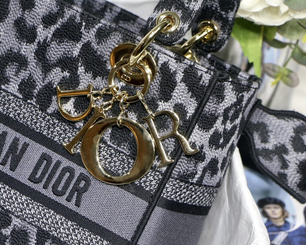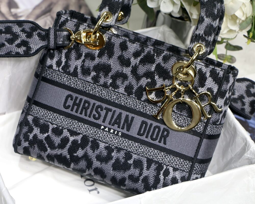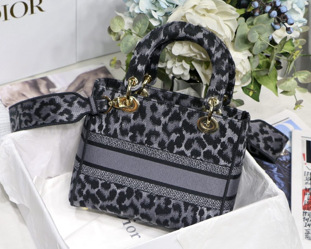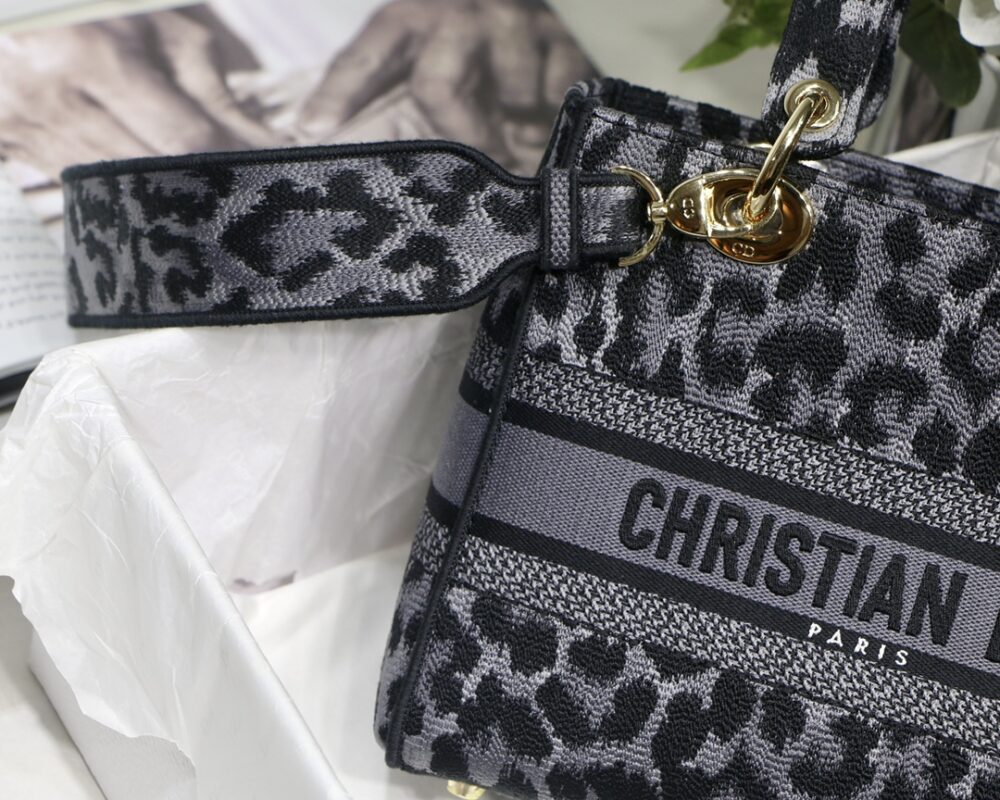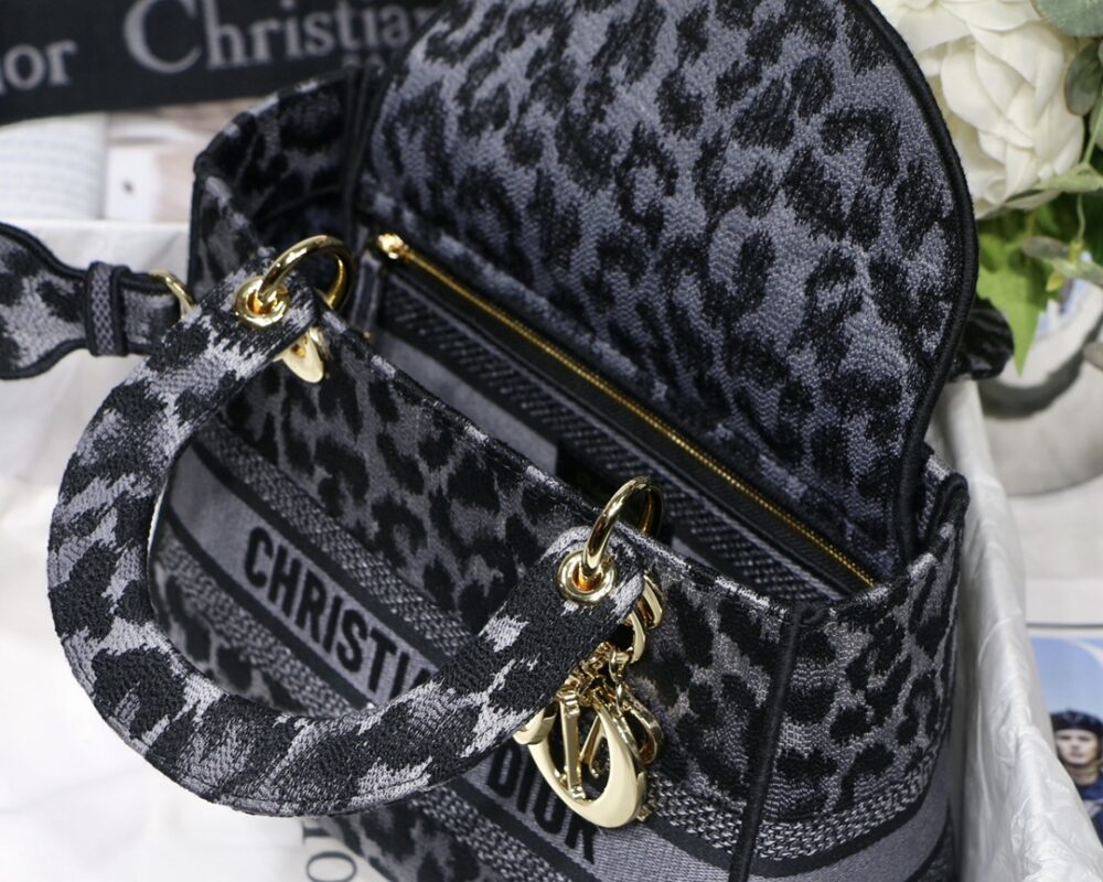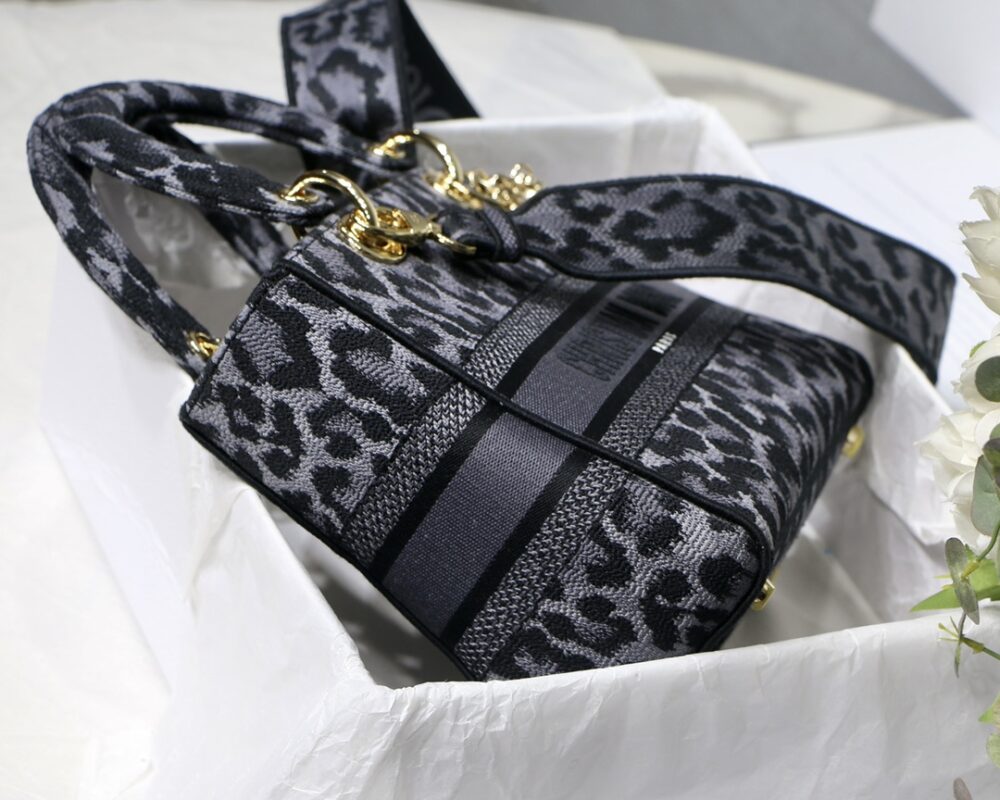 Leopard Light Gold【Lady Dior Embroidery Series】 The latest series draws a lot of natural elements, the color is close to the vegetation, various arabesque prints, embroidery and hollowing out to present the beauty of nature. Break through the conventional bag shape, the cloth material is used. Embroidered Logo on the front adds elegance. The small shoulder strap design, the addition of wide shoulder straps is more harmonious. Size: 24*20*11cm