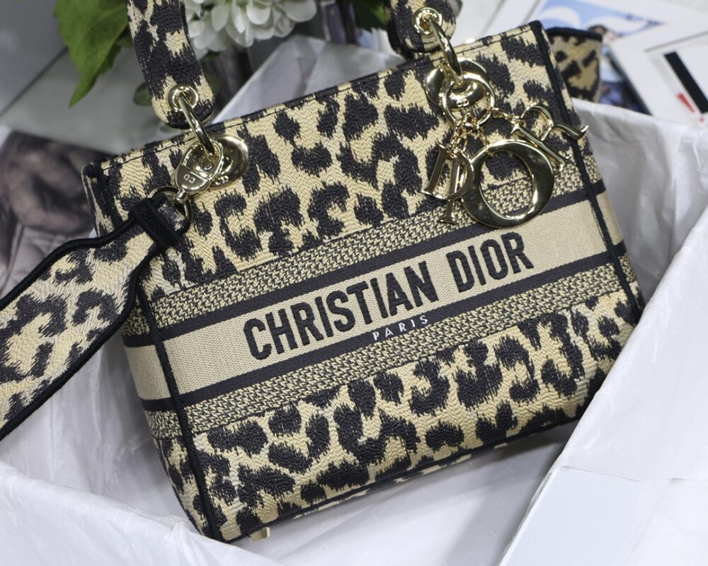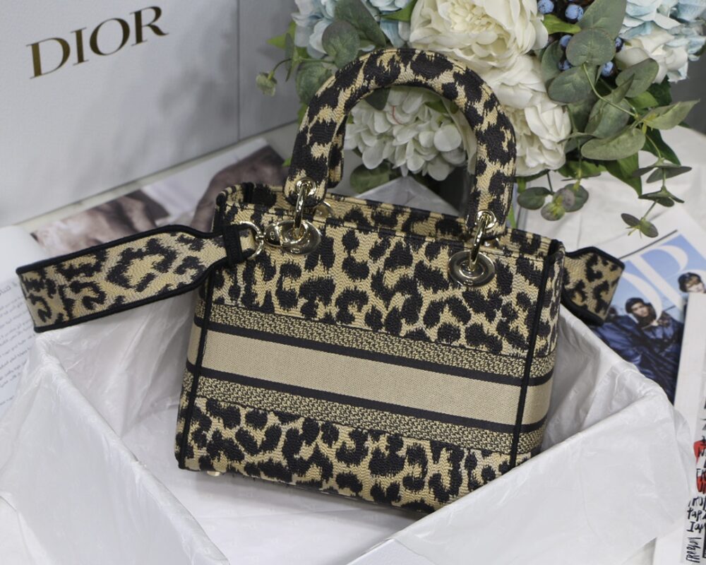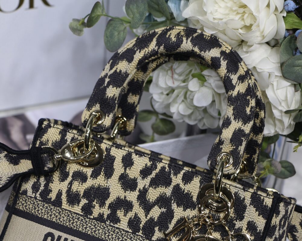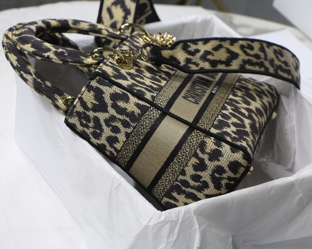 Leopard Light Gold【Lady Dior Embroidery Series】 The latest series draws a lot of natural elements, the color is close to the vegetation, various arabesque prints, embroidery and hollowing out to present the beauty of nature. Break through the conventional bag shape, the cloth material is used. Embroidered Logo on the front adds elegance. The small shoulder strap design, the addition of wide shoulder straps is more harmonious. Size: 24*20*11cm