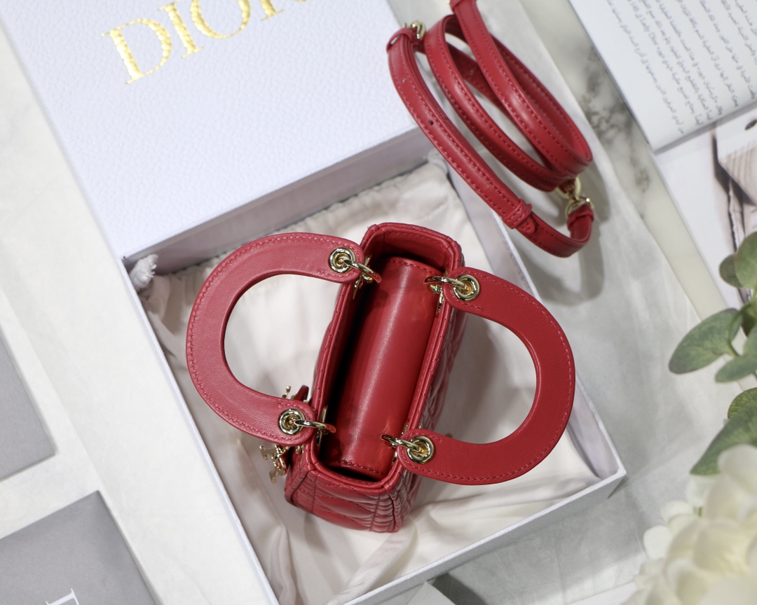 Lady Dior Super Mini 12cm Red Size: 12*10*5cmThis ultra-mini Lady bag embodies D’s insight into sophistication and beauty. Crafted from sheepskin with cannage topstitching, the signature fit is enhanced by a charm. The mini shape can hold a variety of small essentials, making it the ideal companion for evening looks.