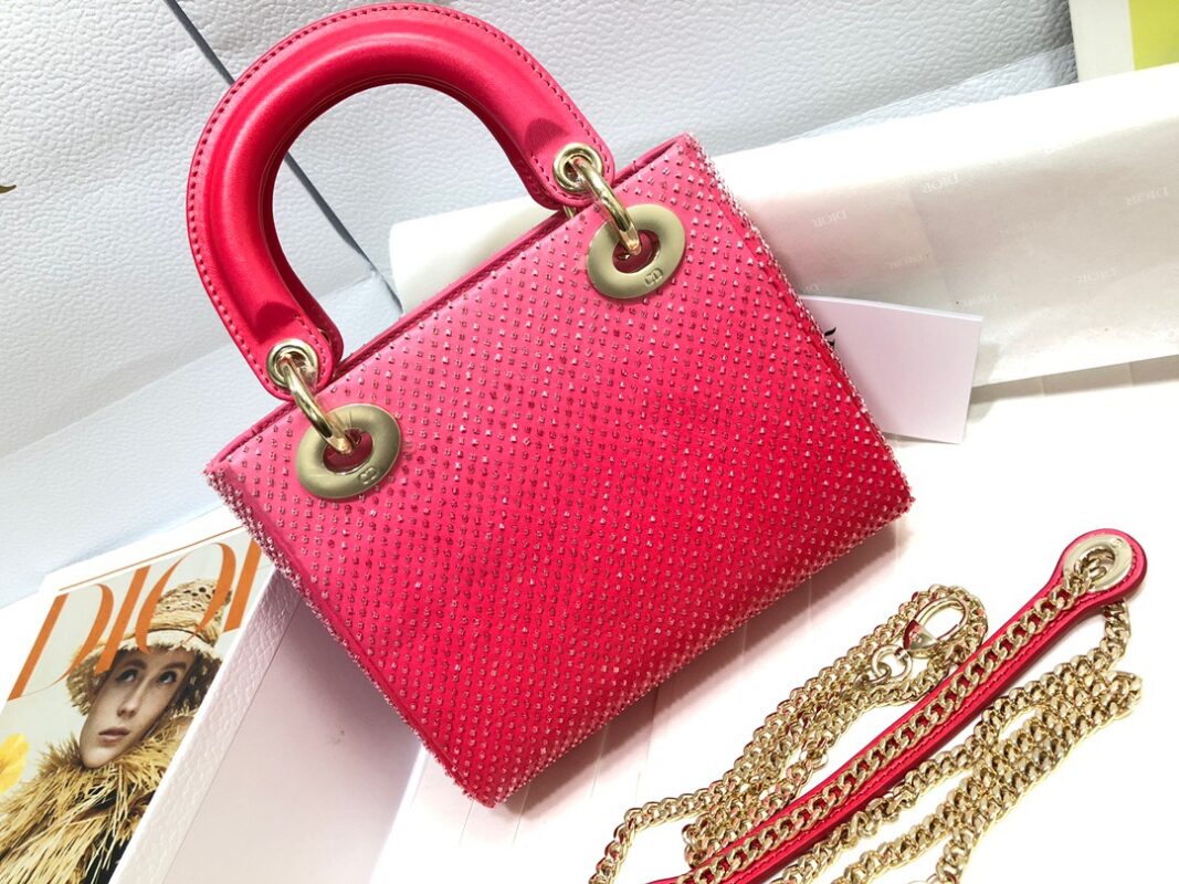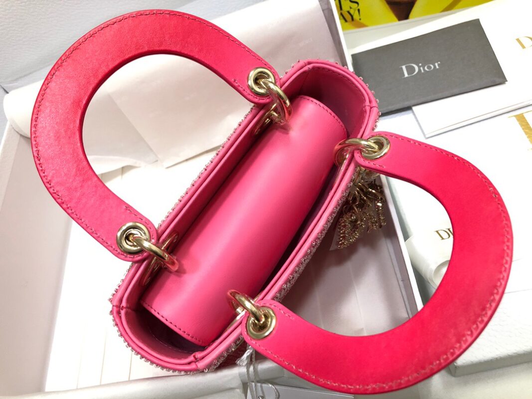 Lady Dior three-grid embroidered gradient beads, with imported lamb tendons inside, crafted from metallic cannage sheepskin leather, the gradient effect and embroidered beads highlight the texture effect, embellished with a light gold-finish metal “Dior” charm. Adds a touch of movement to delicate silhouettes. The mini style, with its detachable chain shoulder strap, can be carried by hand or cross-body, making it the ideal companion for evening wear. Detachable chain shoulder strap, which can be matched with other embroidered shoulder straps at will. Size: 17×15×7cm