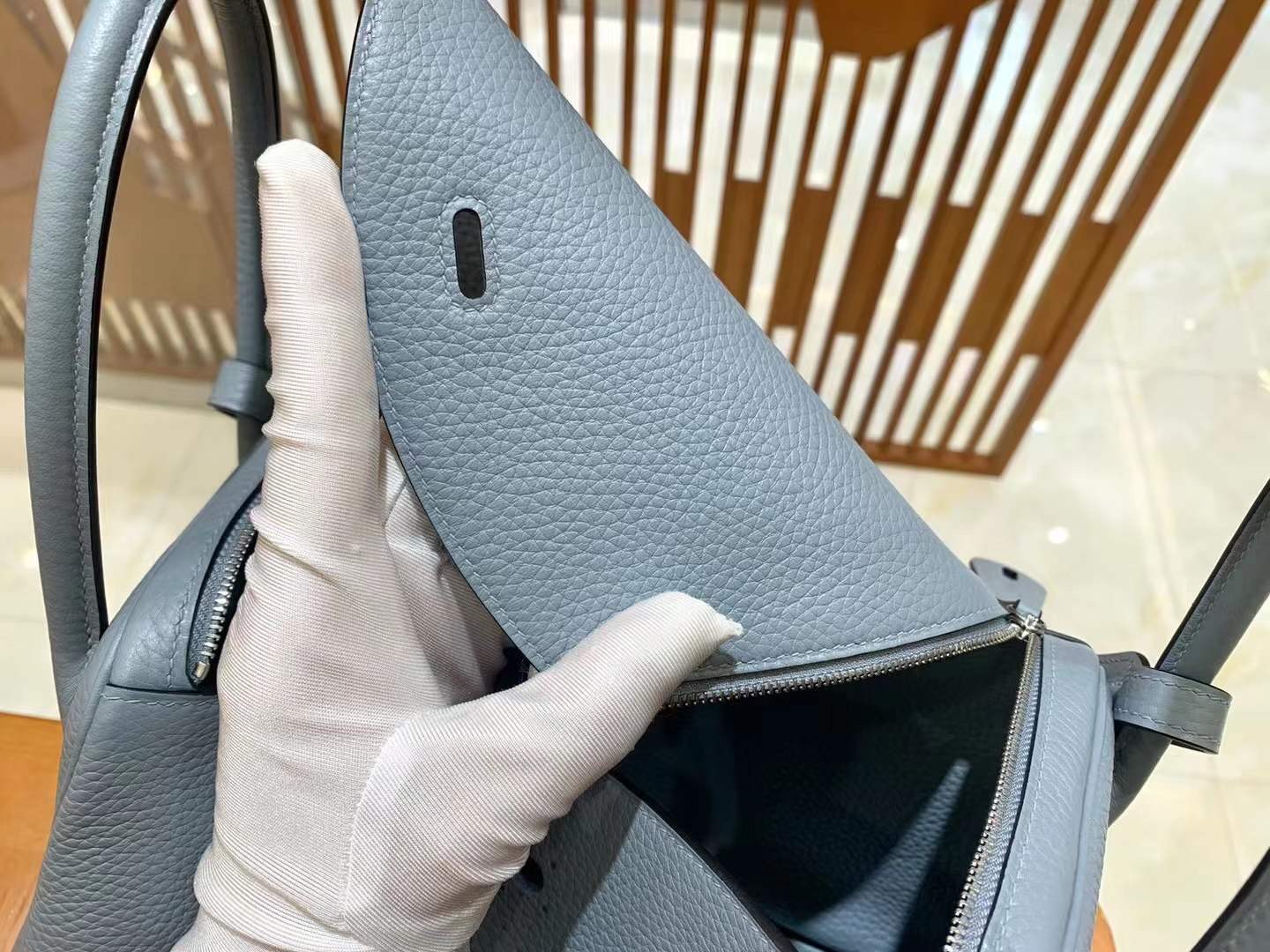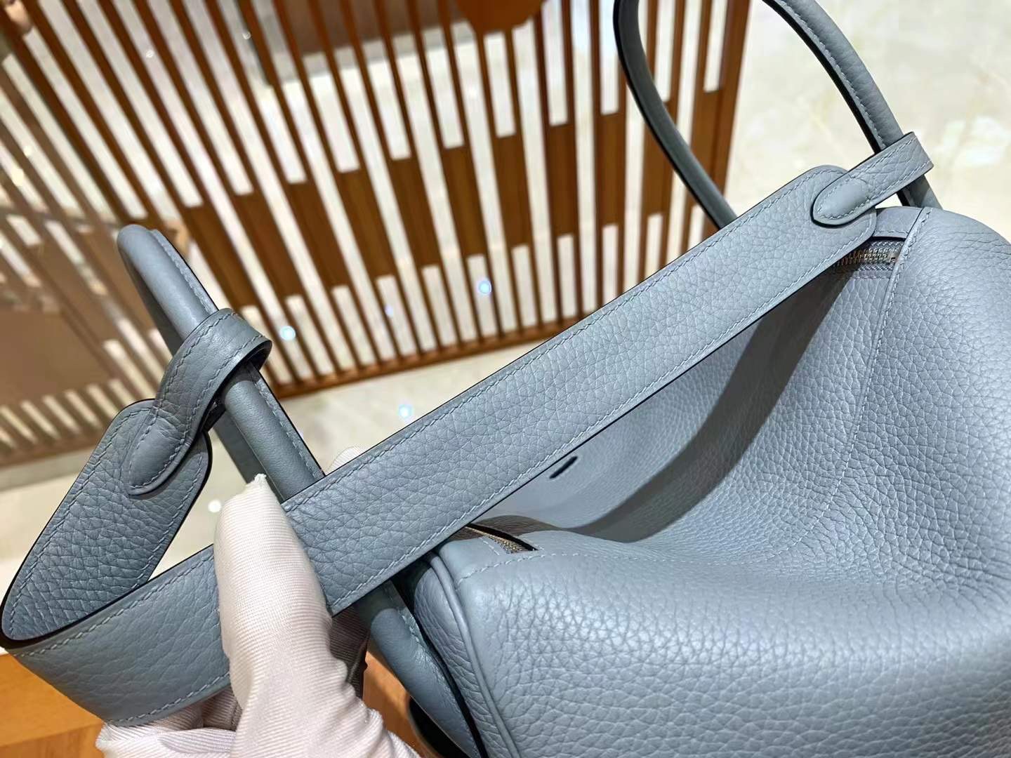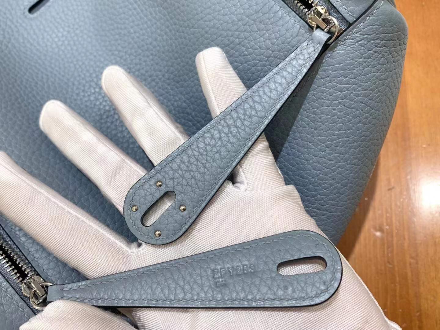 Lindy 26cm Linen Blue Imported TC cowhide. Fully hand-sewn