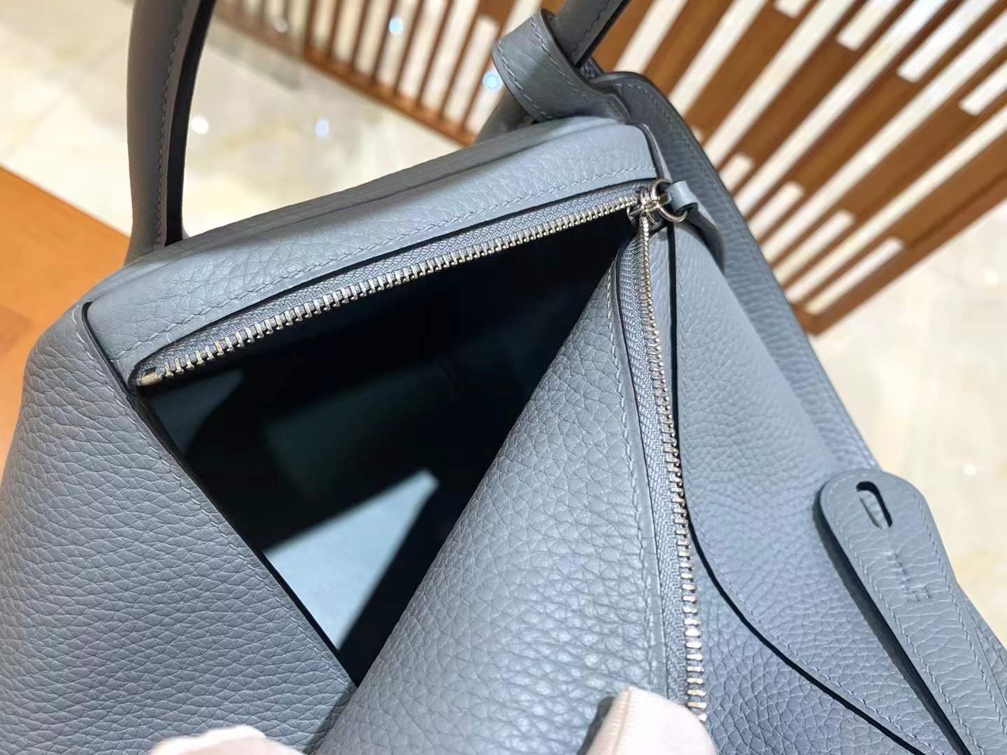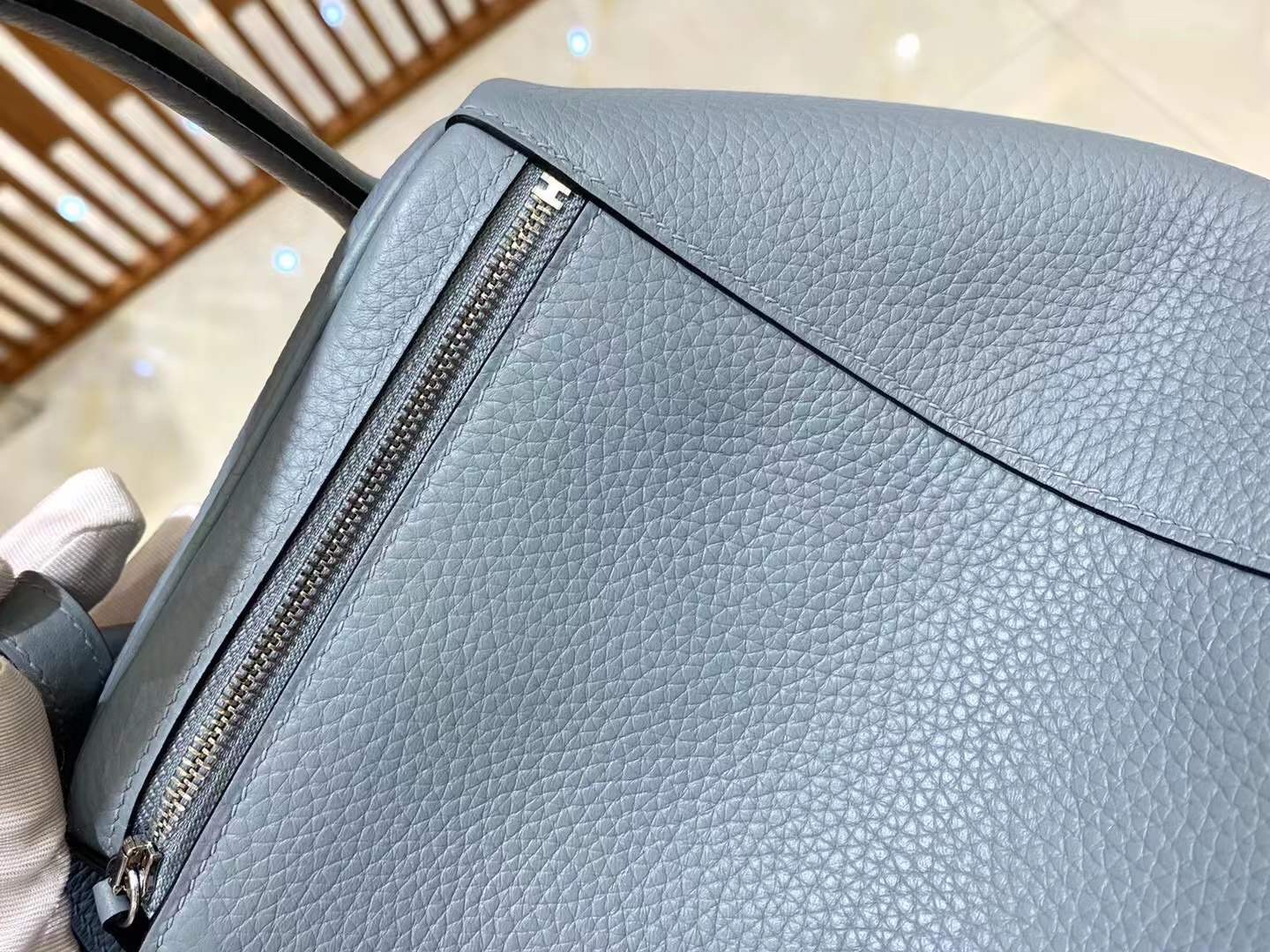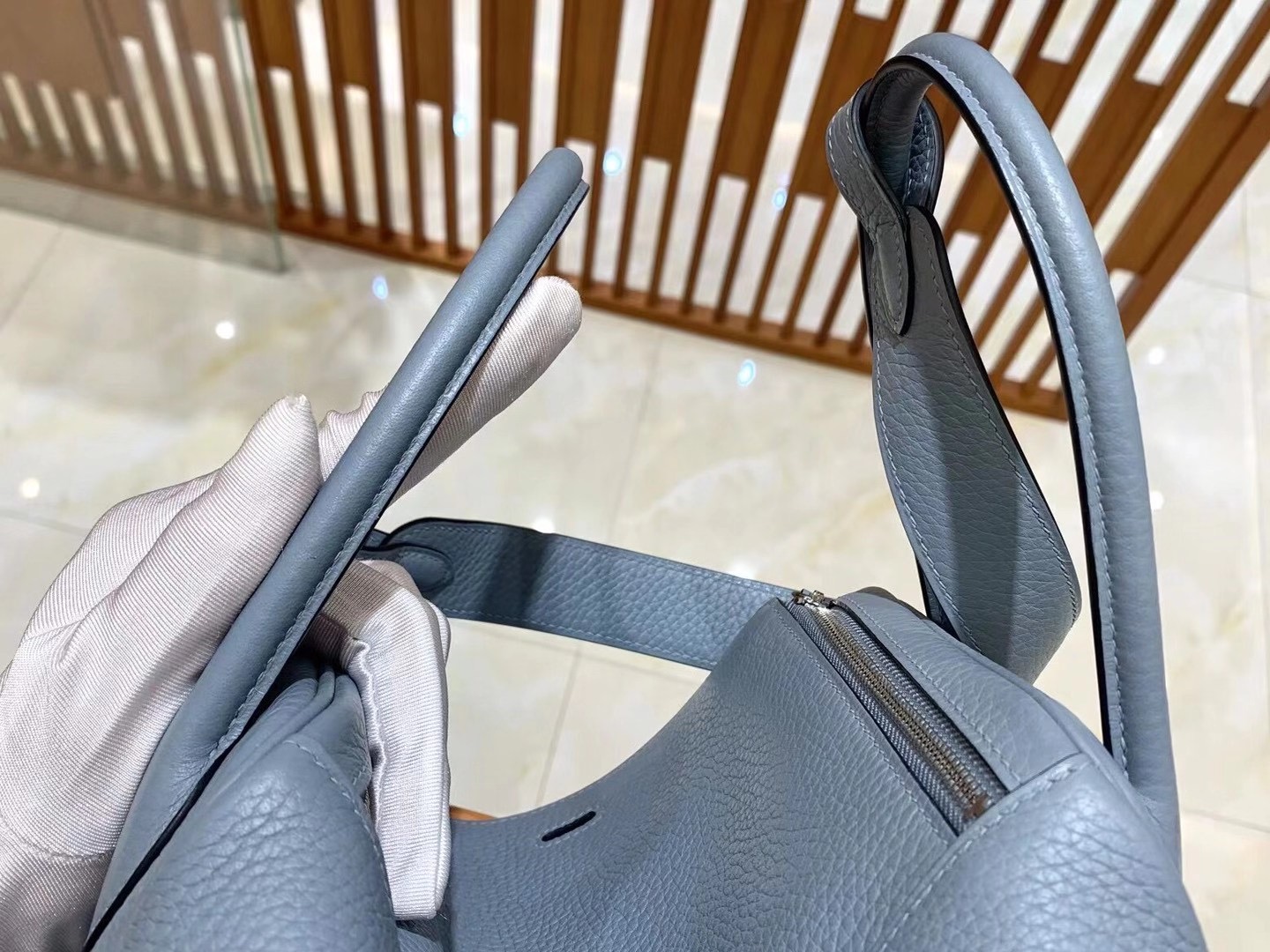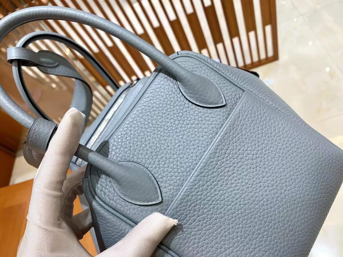 Lindy 26cm Linen Blue Imported TC cowhide. Fully hand-sewn