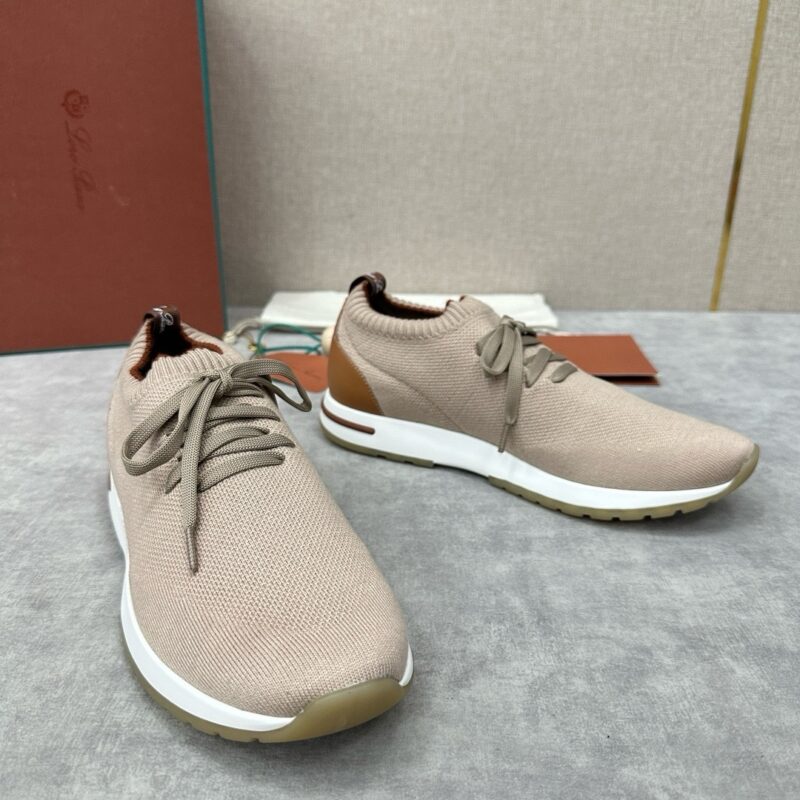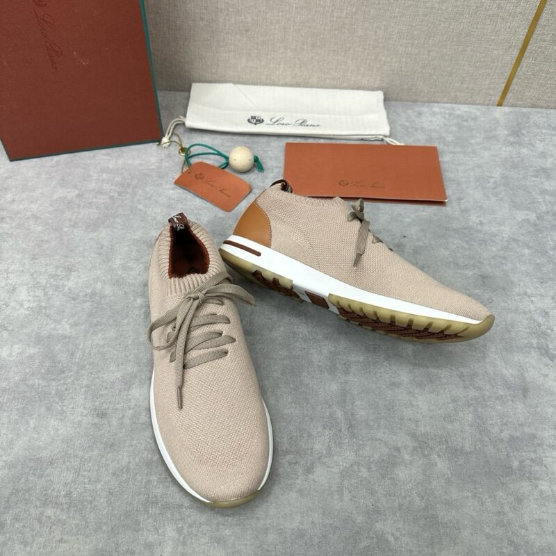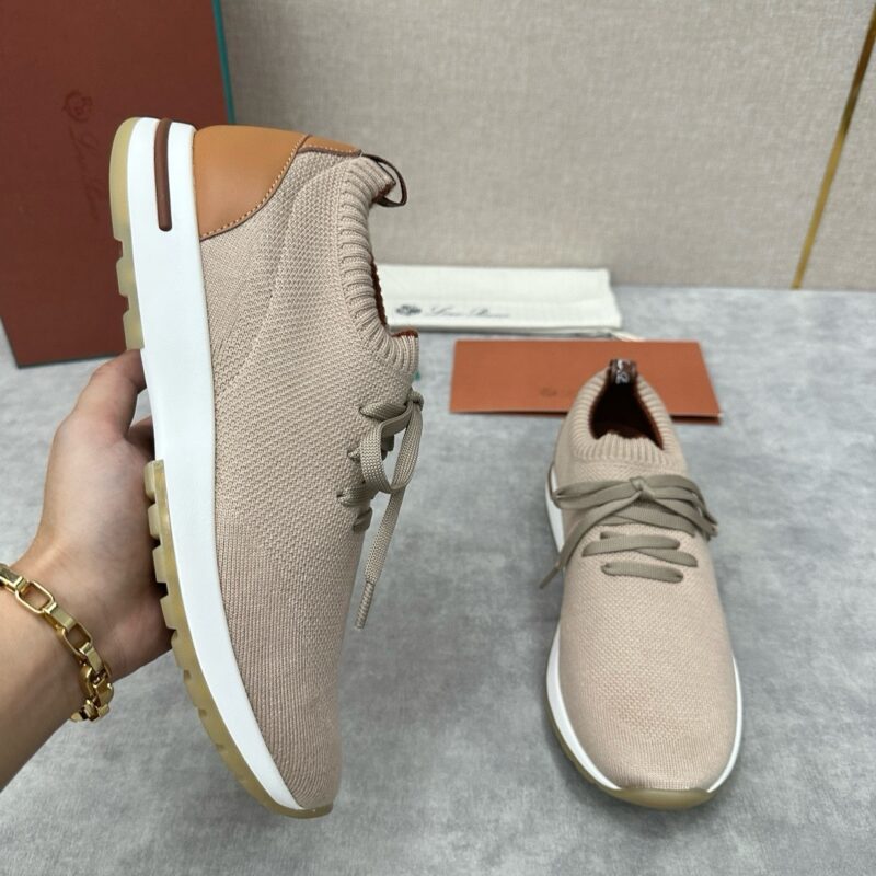 The upper of this sneaker is made of Wish double-layer knitting with a special process. The ribbed elastic shoe mouth is matched with Kummel color trim. The white outsole is matched with the Kummel color sole, printed with the Loro Piana initials classic pattern to create a non-slip effect. The Kummel color pull ring has the Loro Piana logo and is decorated with the same color calfskin. It is very light and comfortable, suitable for leisure and relaxation, creating a casual look. Let elegance and comfort spread on the soles of your feet, as light as the wind. 2024
