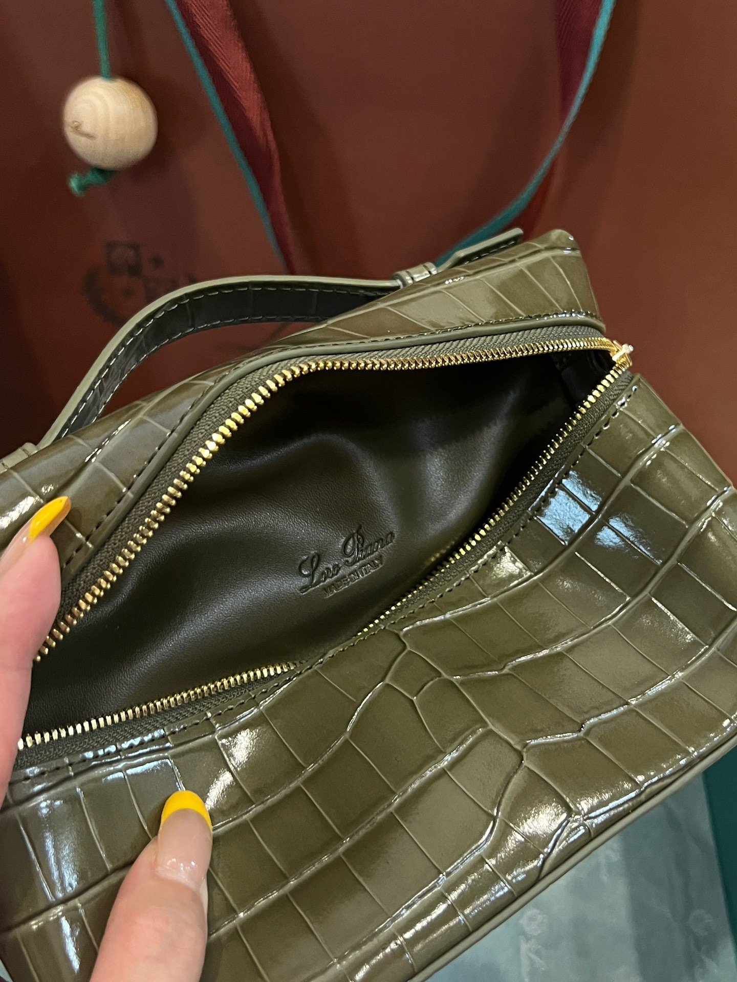 Craftskin embossed crocodile pattern. Two-way zipper closure, simple and versatile mainly. Super hot and practical small bag size: 19* 11*6.5 gold buckle