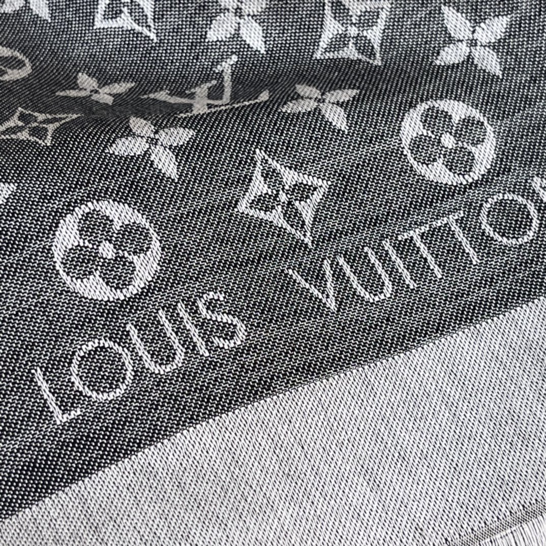 The Monogram Denim shawl featuring the iconic Monogram motif and the Louis Vuitton signature in jacquard and trimmed with fringe. The soft silk and wool blend lends a touch of sophistication to everyday looks.