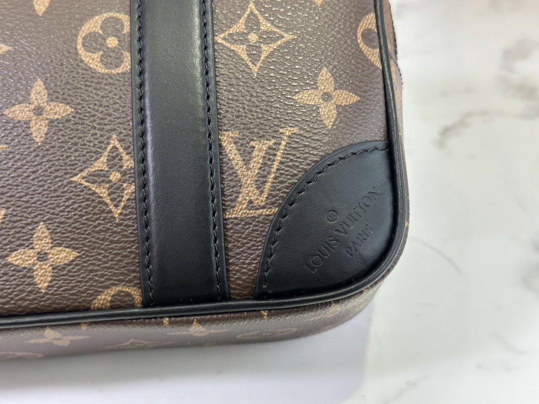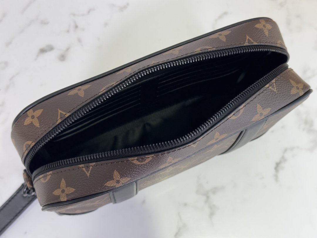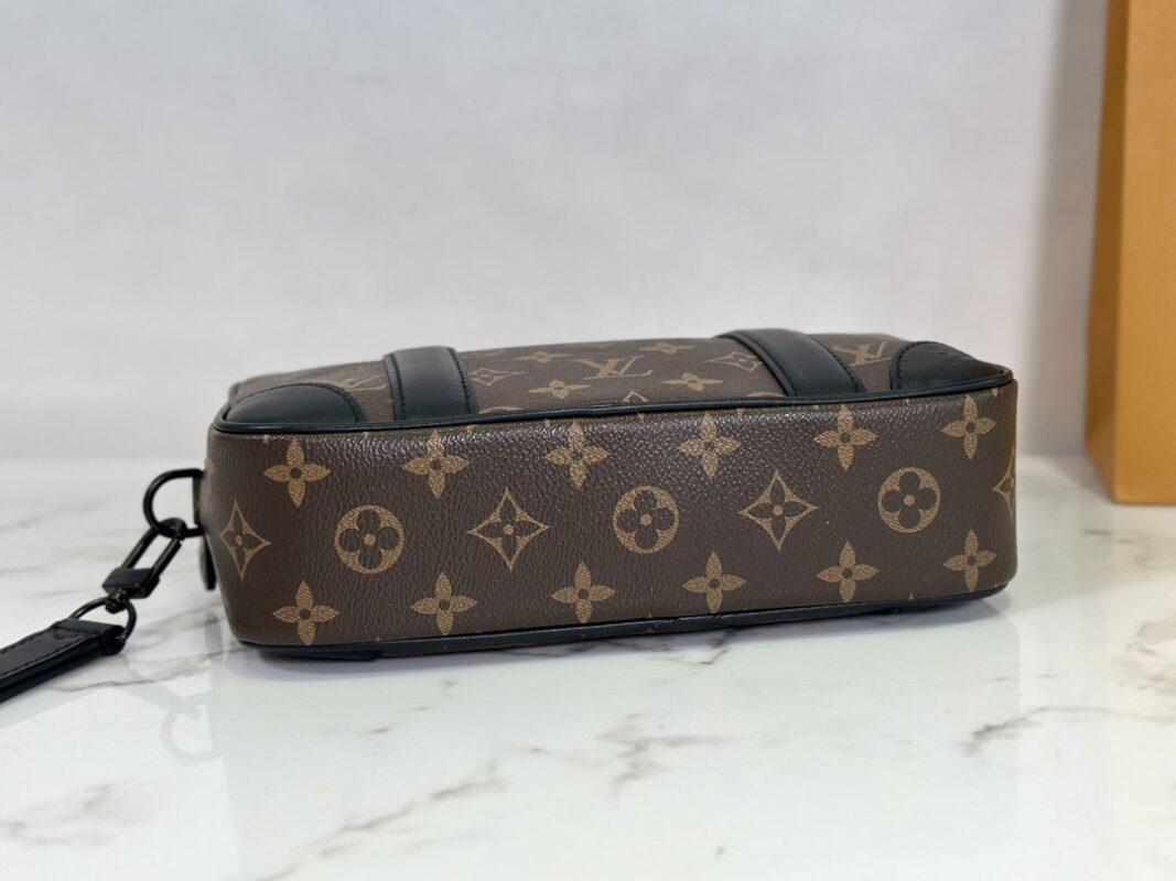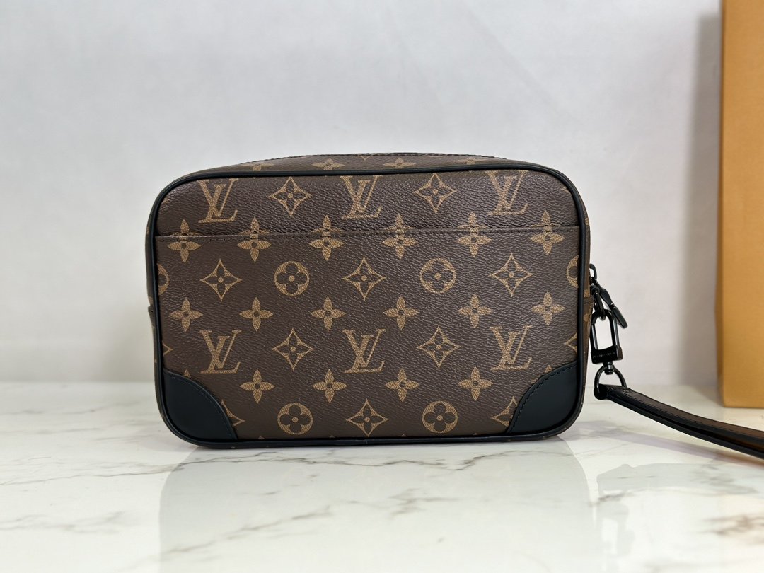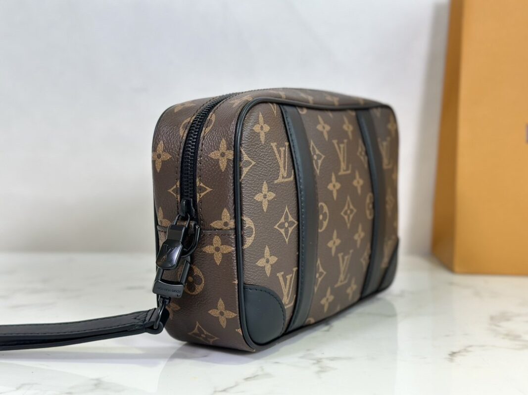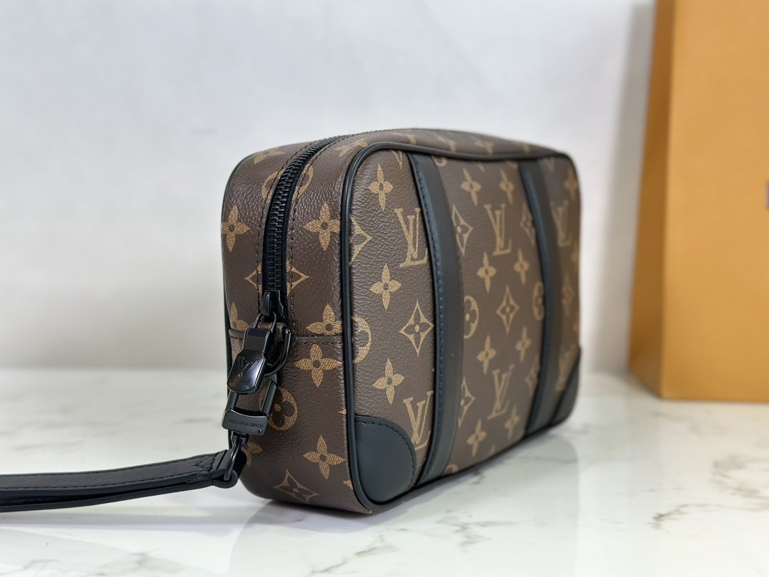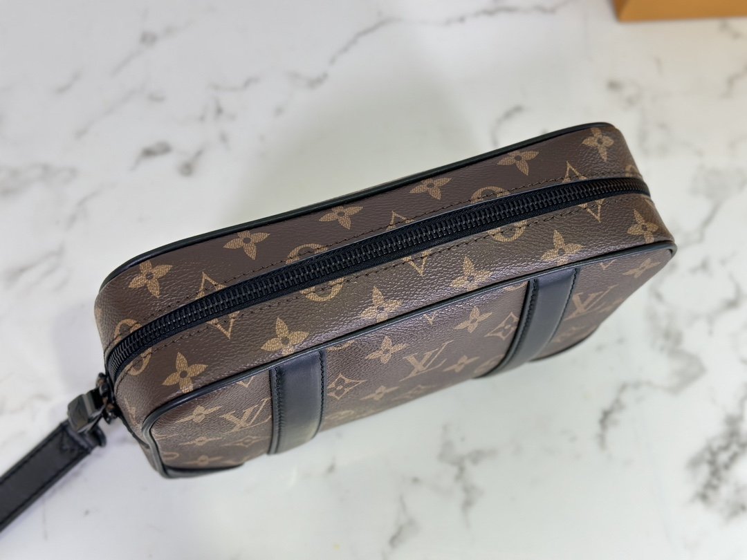 Men’s Clutch Clutch Collection POCHETTE KASAI Clutch This Kasaï pouch is made of Damier graphite canvas with reinforced corners and black leather straps on the front and zipped back pocket. Its wide zip opening provides access to three flat pockets and ten card slots. The piece can be worn as a bag or on the wrist with its detachable strap. 25 x 15.5 x 6.5 cm.