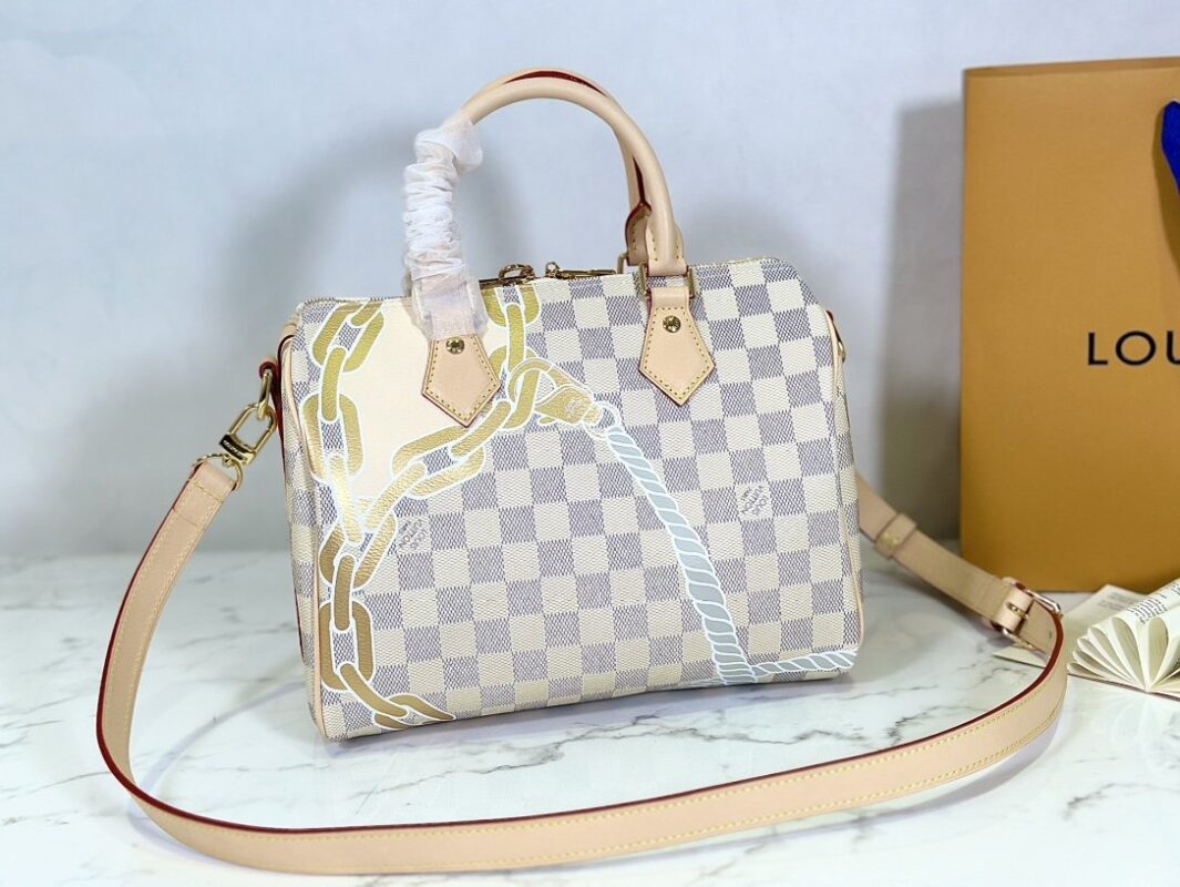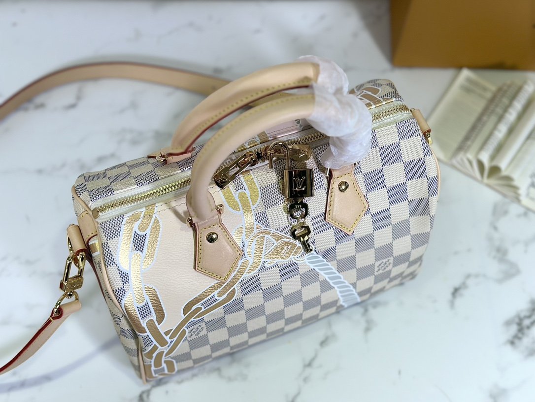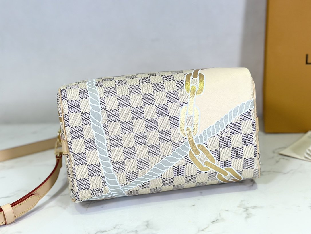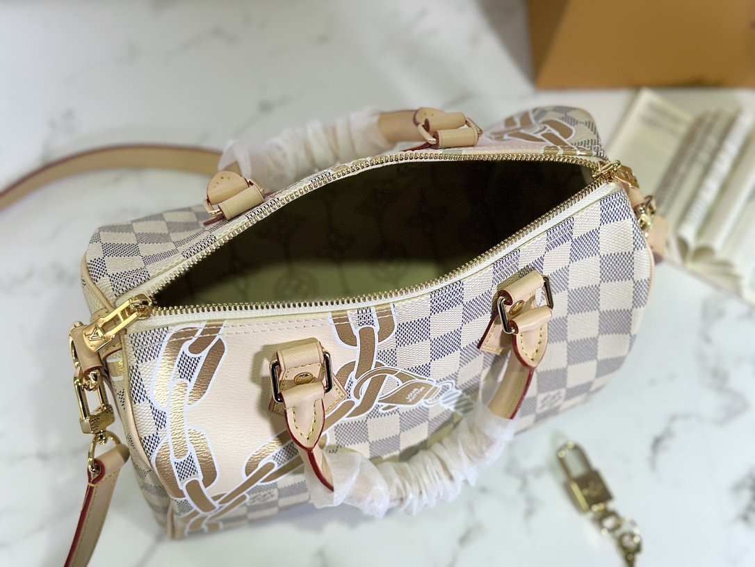 Pillow bag SPEEDY BANDOULIÈRE 25 handbag N40473 white grid screen printing This Speedy Bandoulière 25 handbag adopts five-color serigraphy printing process, depicting nautical prints composed of chain and rope patterns on the surface of Damier Azur canvas, slowly blowing the breath of midsummer. Use the rolled leather handle and detachable and adjustable shoulder strap to explore more ways to carry it.