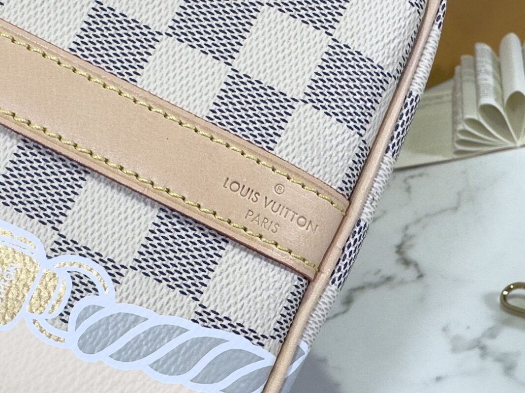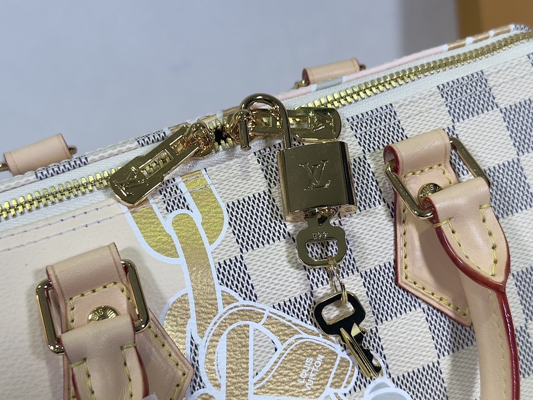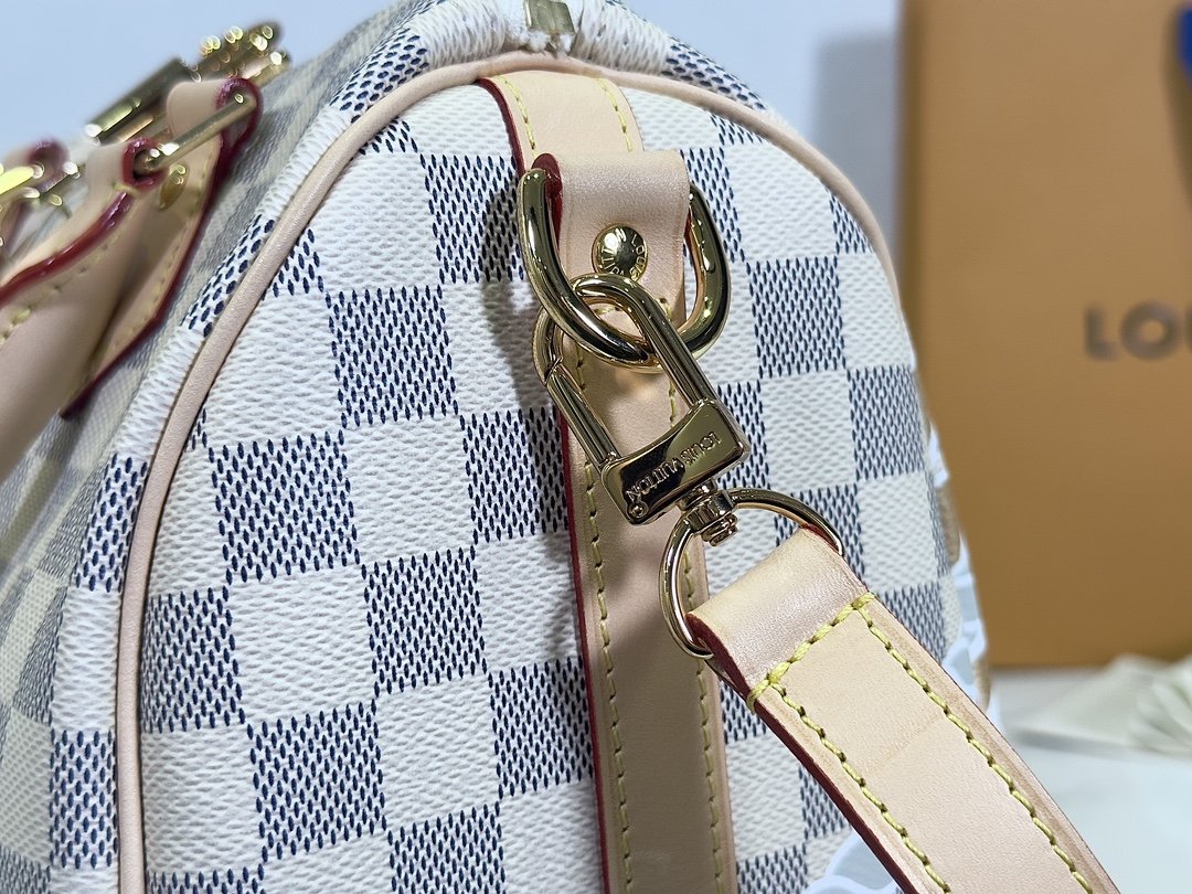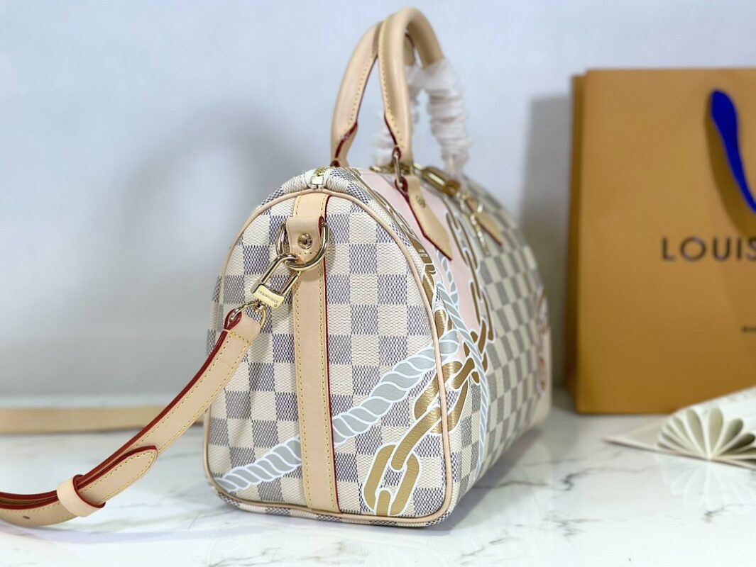 Pillow bag SPEEDY BANDOULIÈRE 25 handbag N40473 white grid screen printing This Speedy Bandoulière 25 handbag adopts five-color serigraphy printing process, depicting nautical prints composed of chain and rope patterns on the surface of Damier Azur canvas, slowly blowing the breath of midsummer. Use the rolled leather handle and detachable and adjustable shoulder strap to explore more ways to carry it.