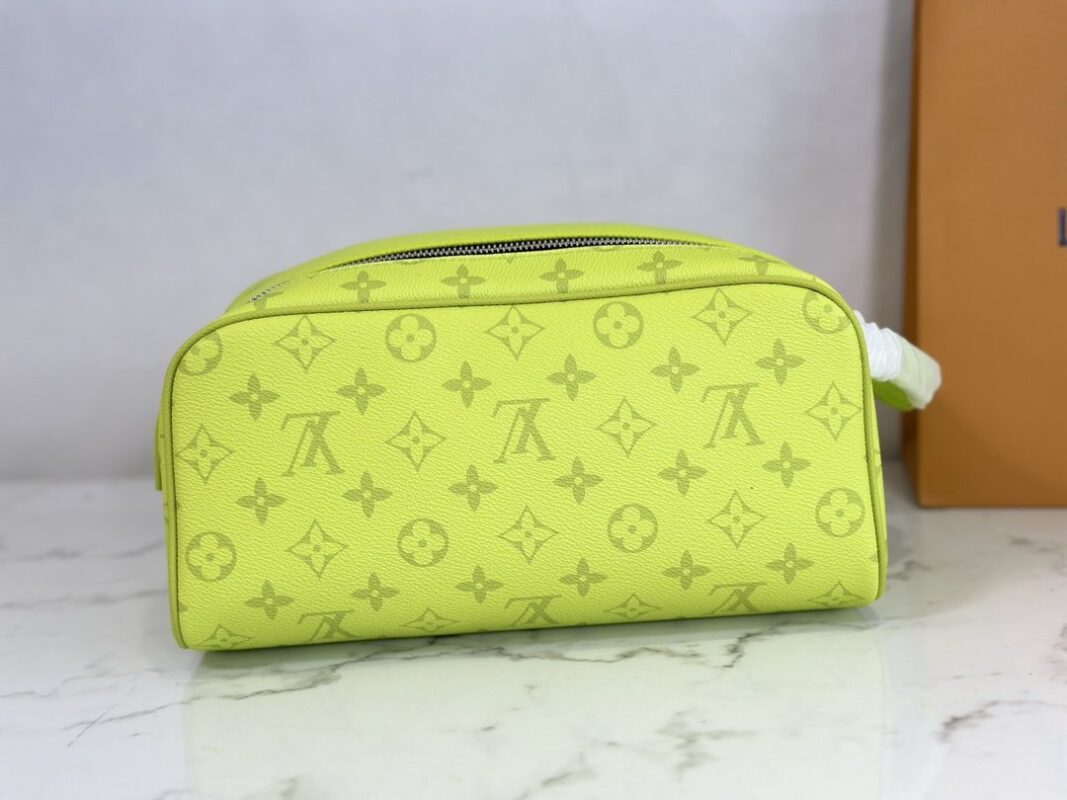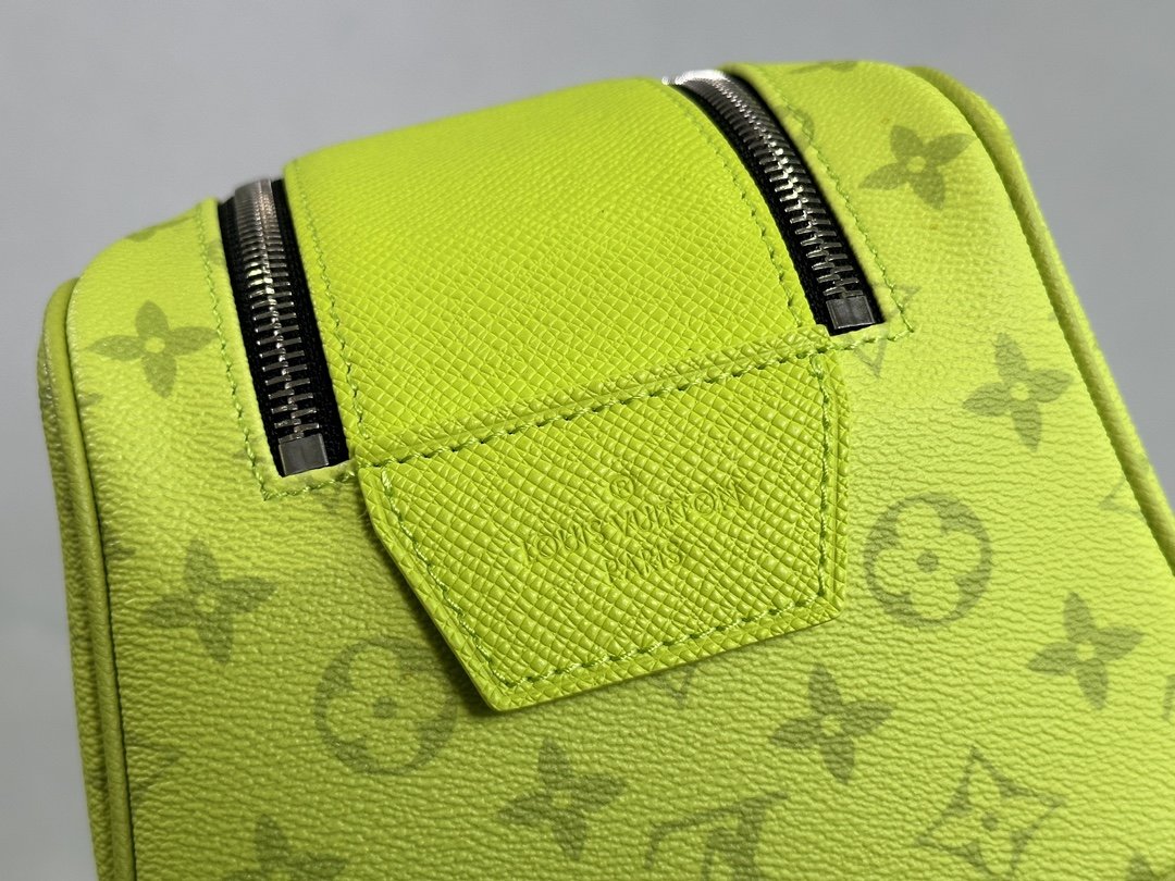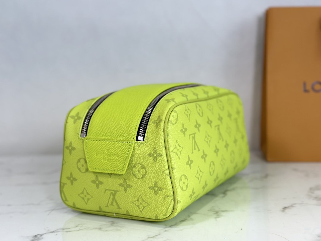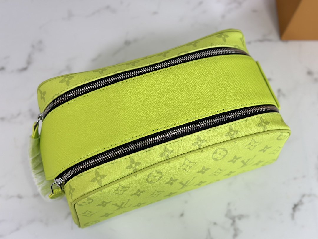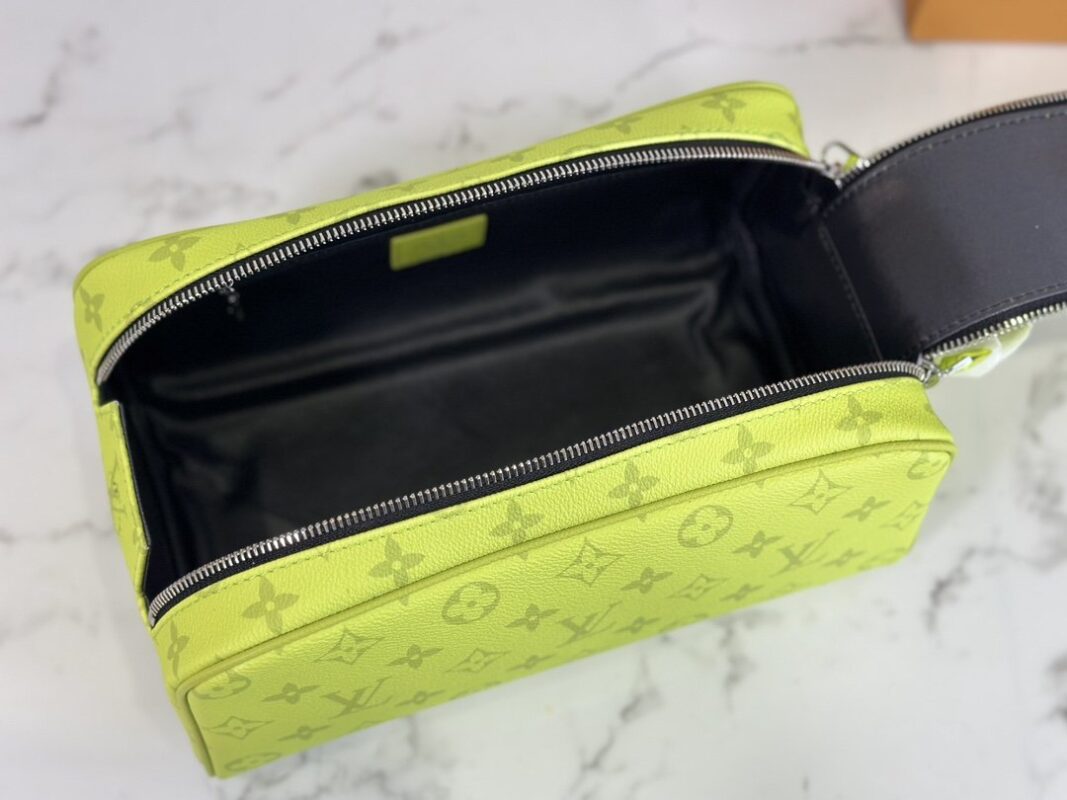Amenity Bag Clutch Collection This Dopp Kit amenity bag in fine-grain Taurillon Monogram leather is an elegant way to carry toiletries and other personal items. Style and function in this roomy bag with double zipper closure and washable lining. This accessory makes a thoughtful gift or complements any Louis Vuitton travel bag perfectly. Dimensions in detail: 28 x 15 x 16.5 cm