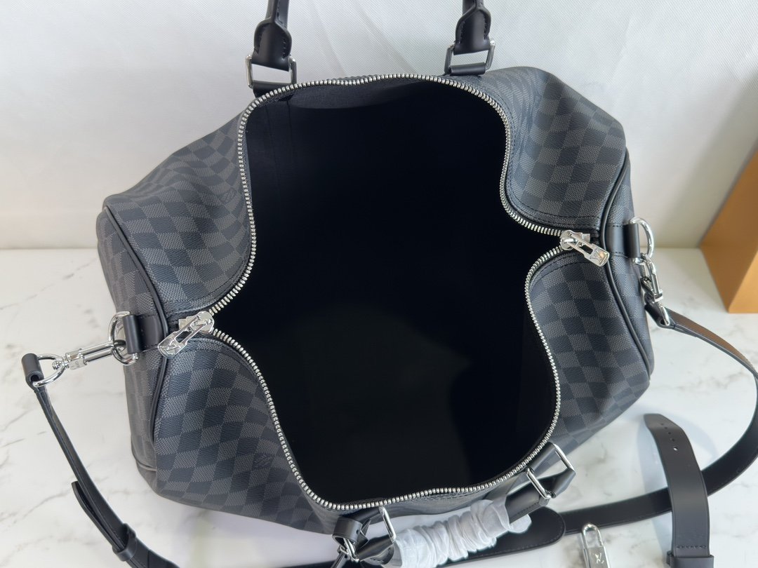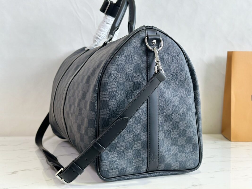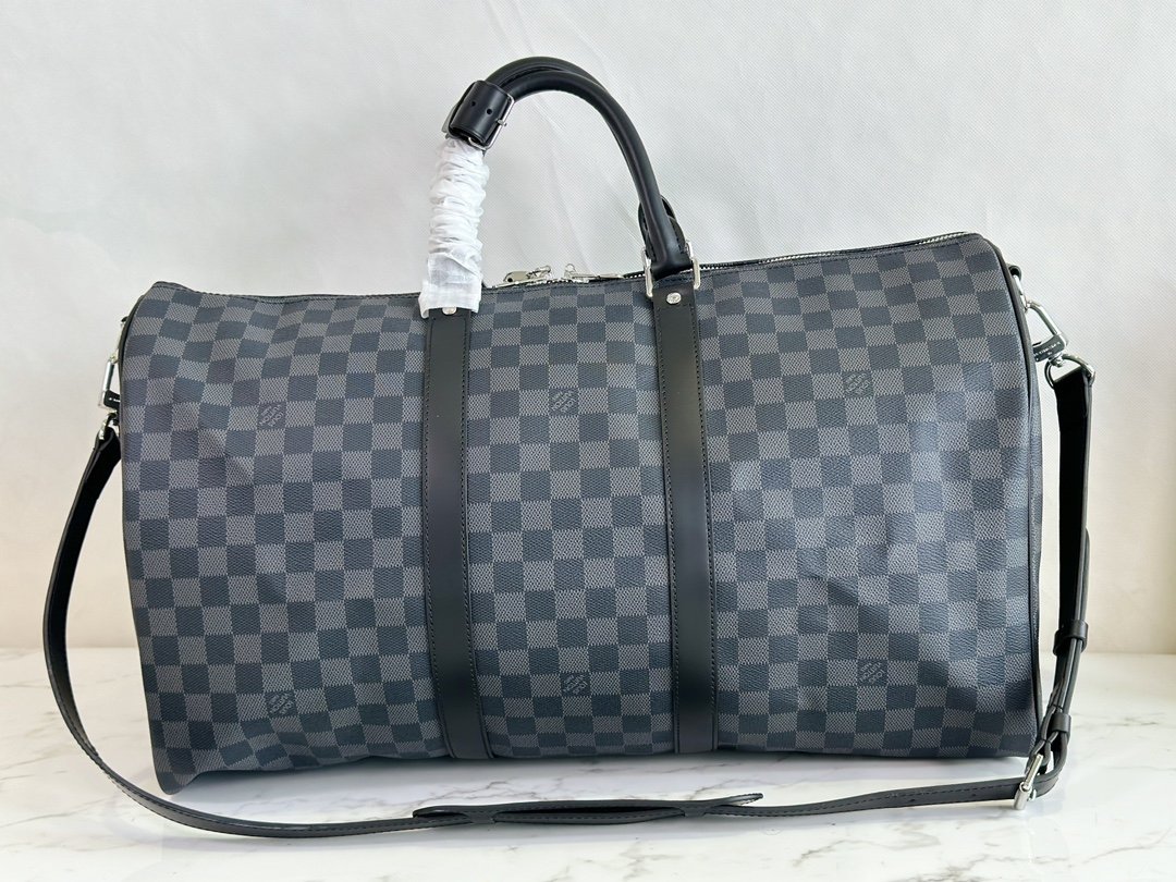 KEEPALL 50 Travel Bag (with shoulder strap) This travel bag in Damier Graphite canvas reproduces the classic design of Louis Vuitton, which is stylish and elegant, but at the same time light and durable. Equipped with a detachable strap, it can be carried by hand or over the shoulder, which is very practical. Dimensions: 50.0 x 29.0 x 23.0 cm (L x H x W)