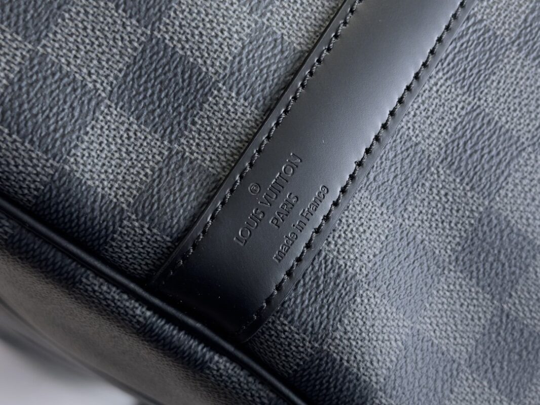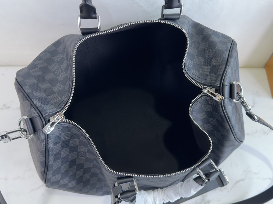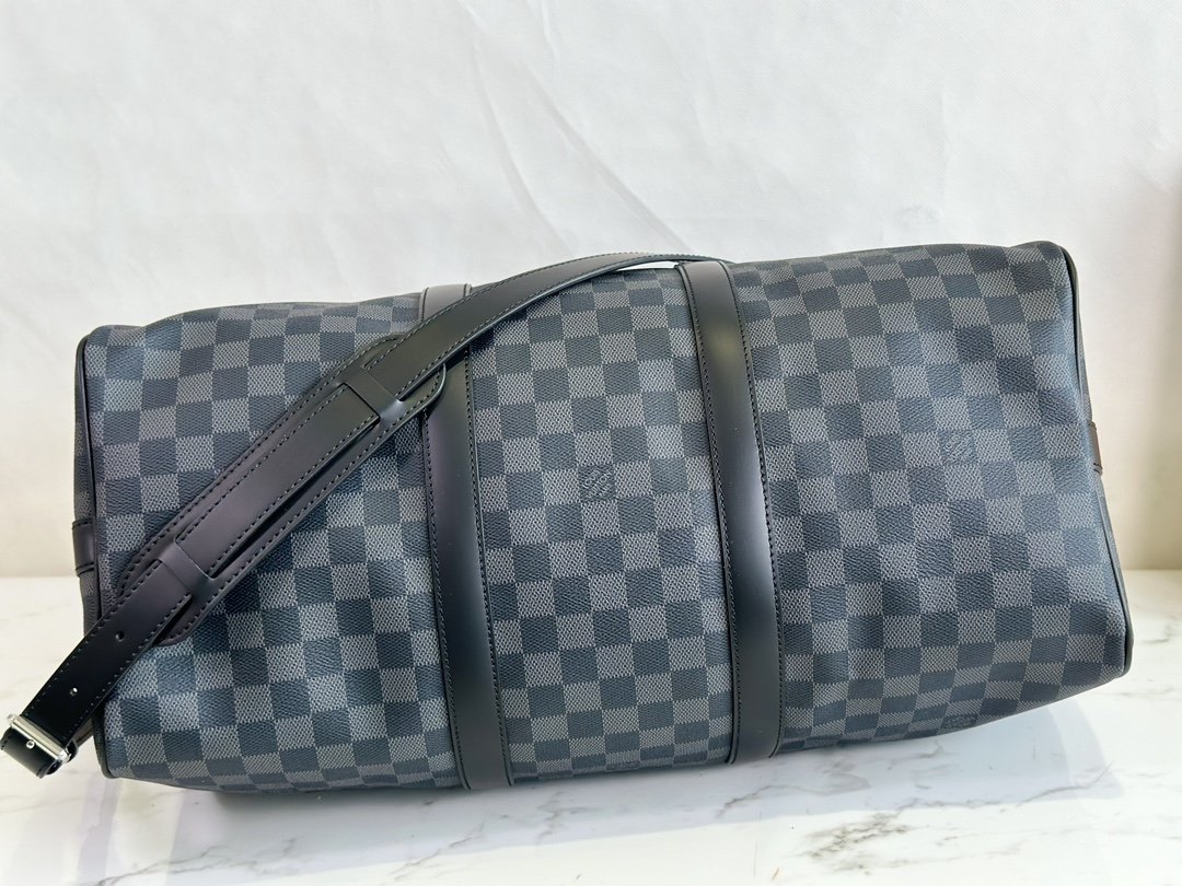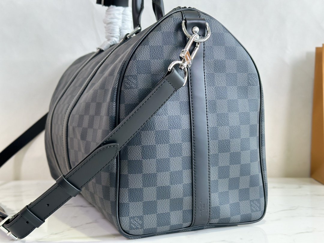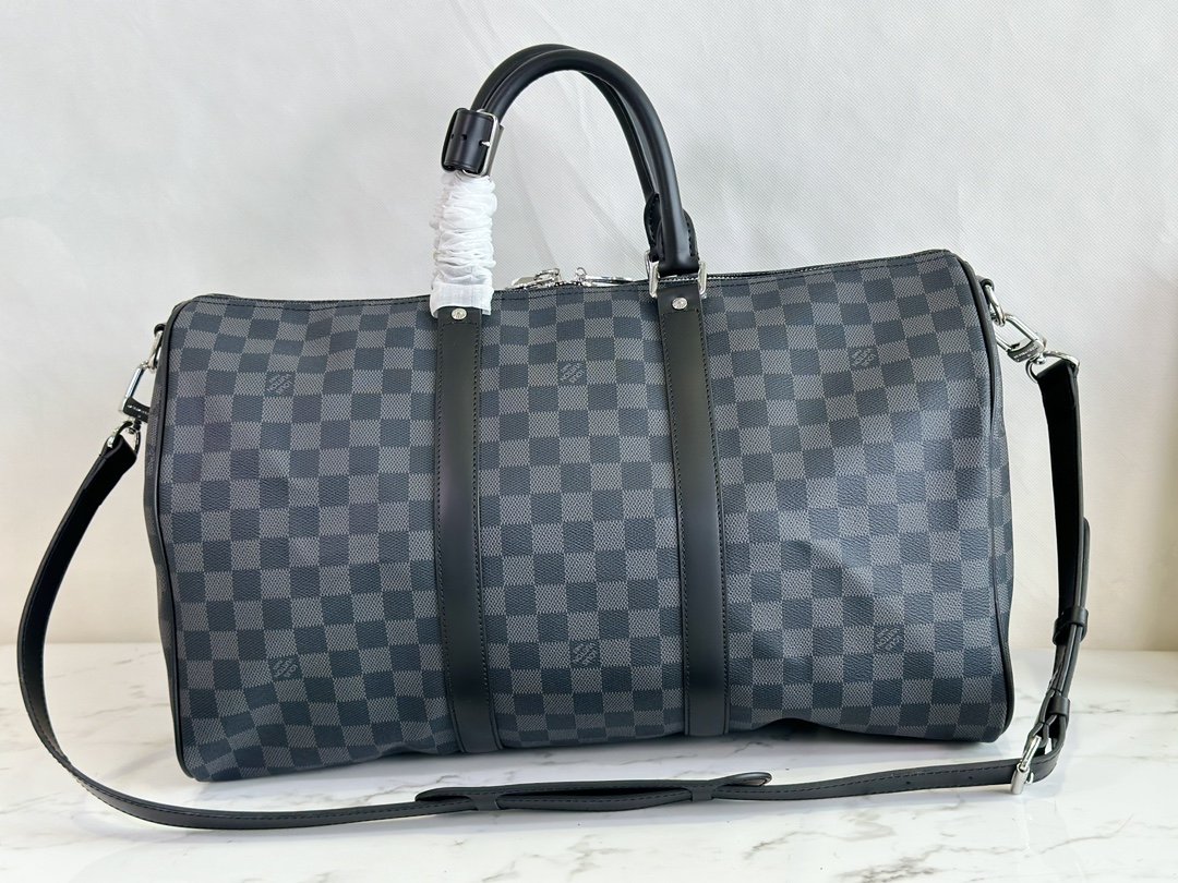 KEEPALL 45 Travel Bag (With Strap) The classic Keepall 45 bag in Damier Graphite canvas is hand luggage sized. It features rounded leather handles and an adjustable, detachable shoulder strap with padded shoulders for more comfortable carrying.