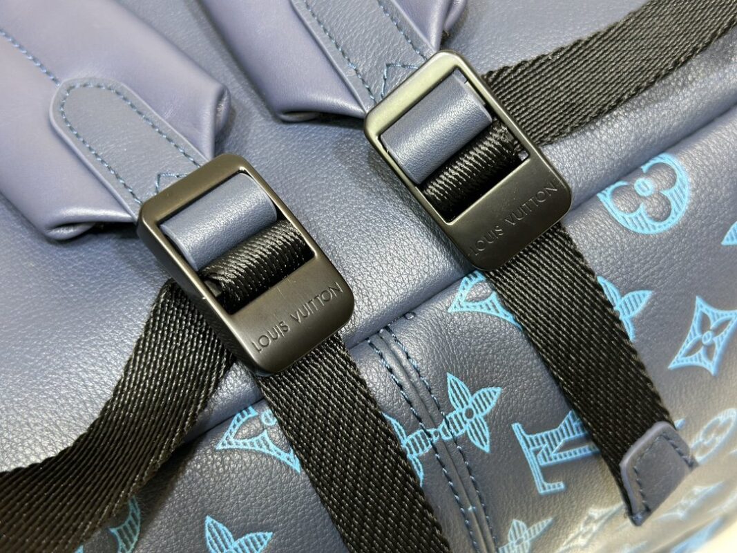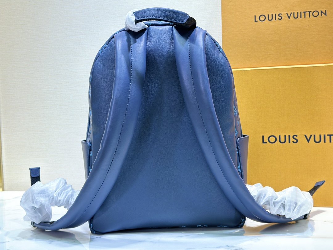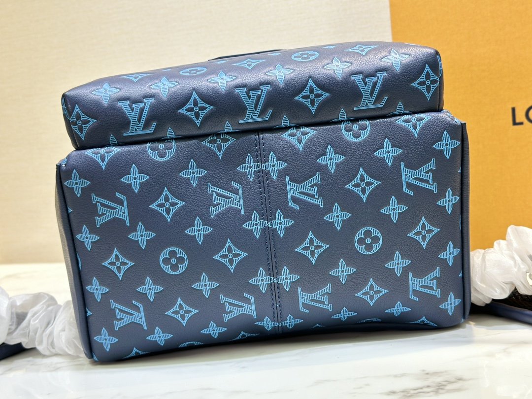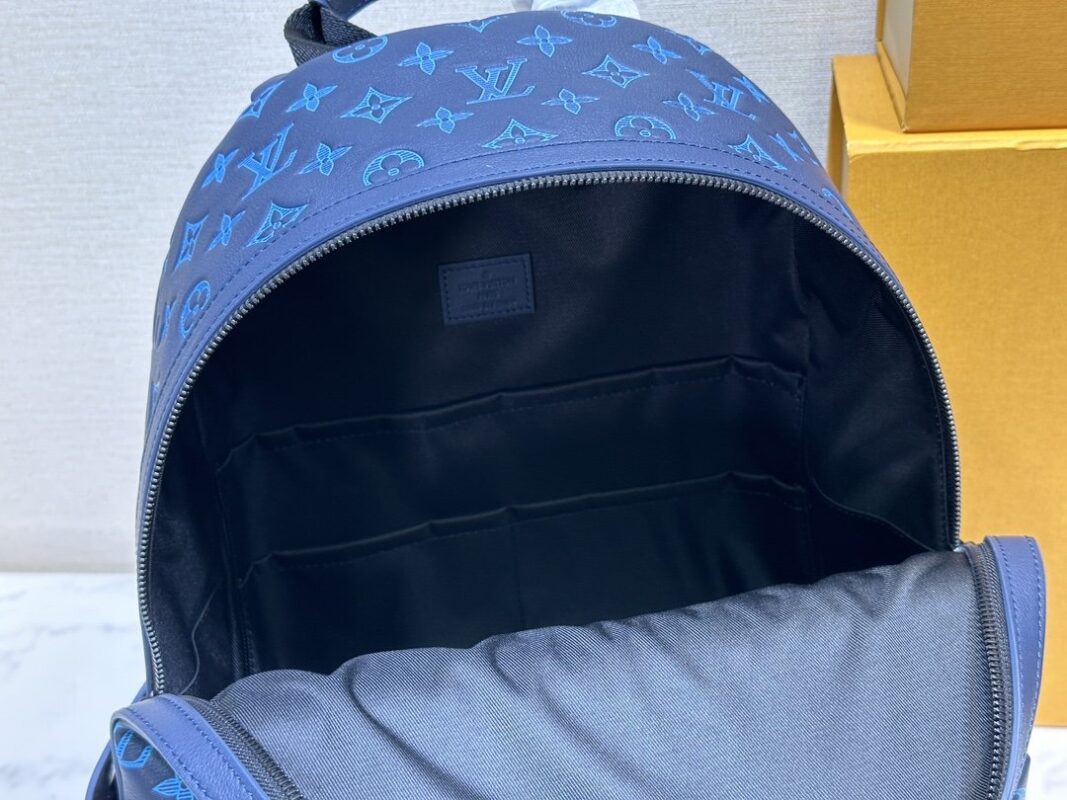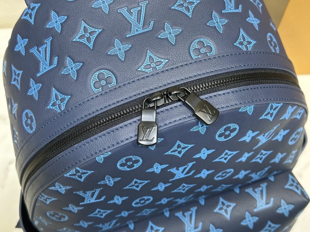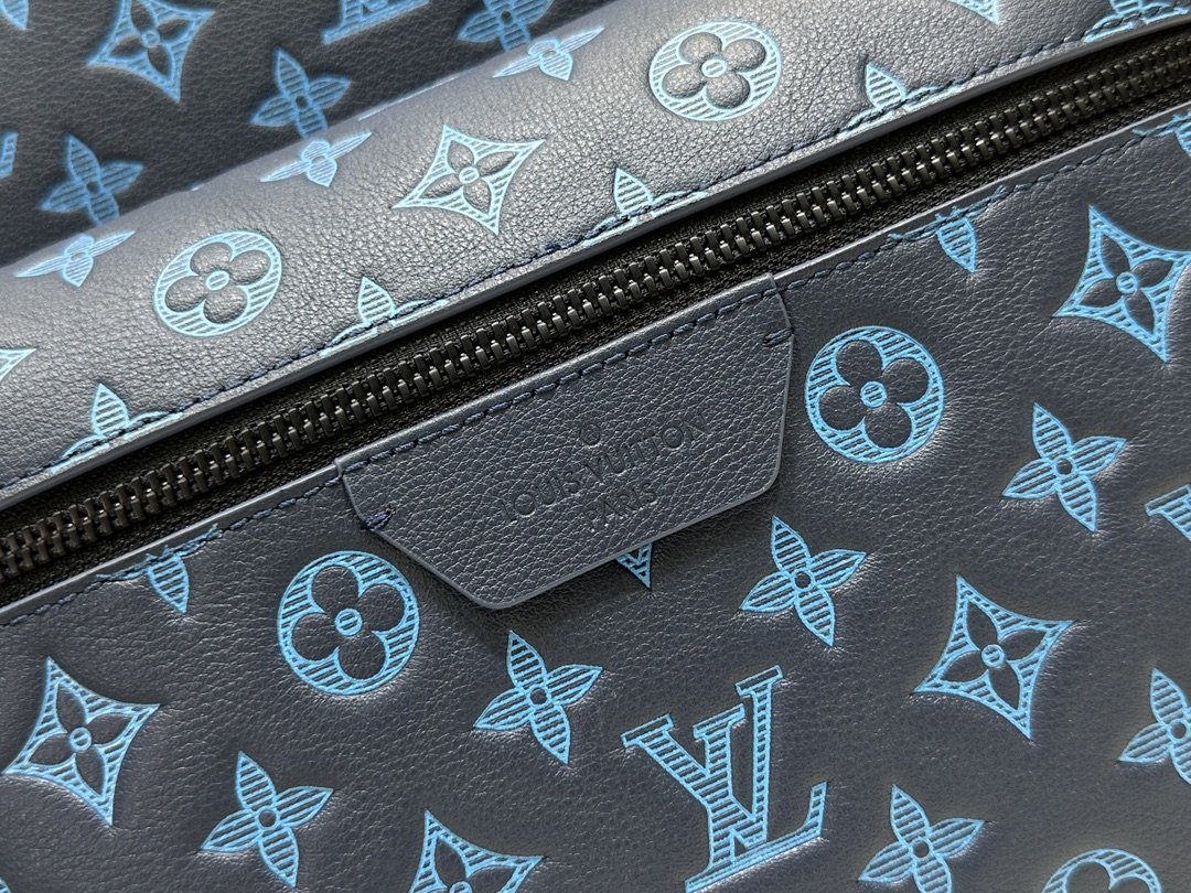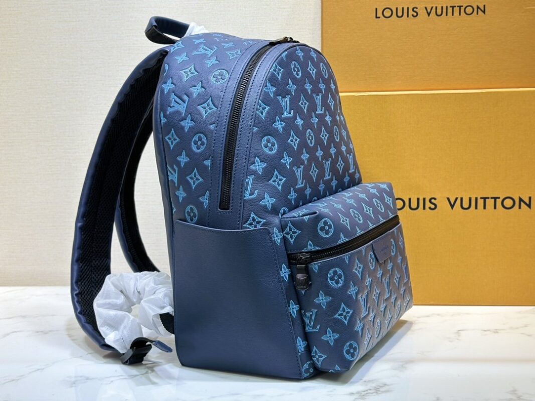 Full Leather Backpack Series DISCOVERY Backpack This Discovery Backpack is made of Monogram embossed calfskin for a soft, close-fitting shape, complemented by the calmness of metal parts. The outer pocket provides easy access to accompanying items, while the inner pocket provides organized storage. Detailed features 29 x 38 x 20 cm