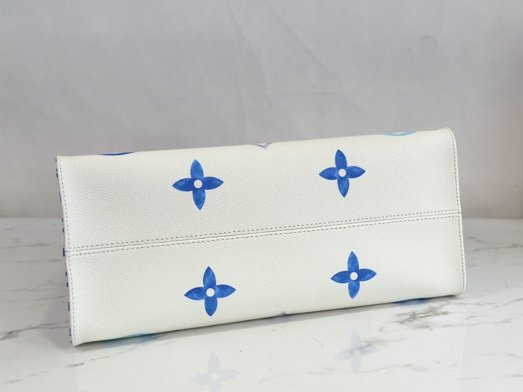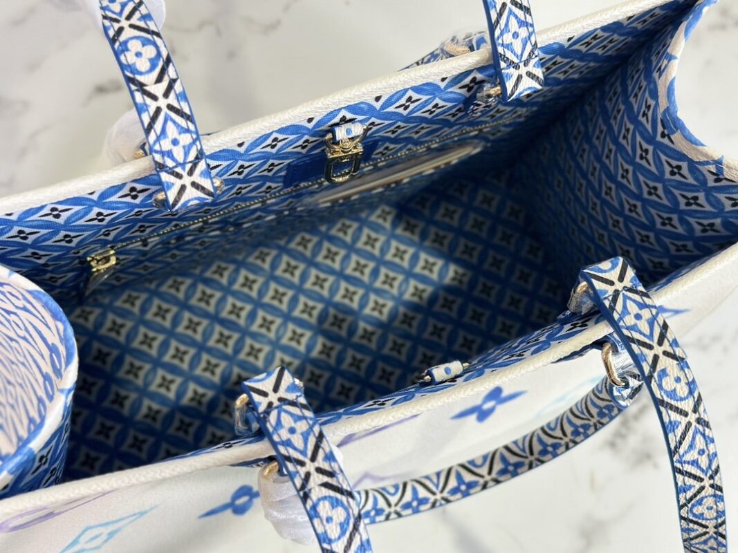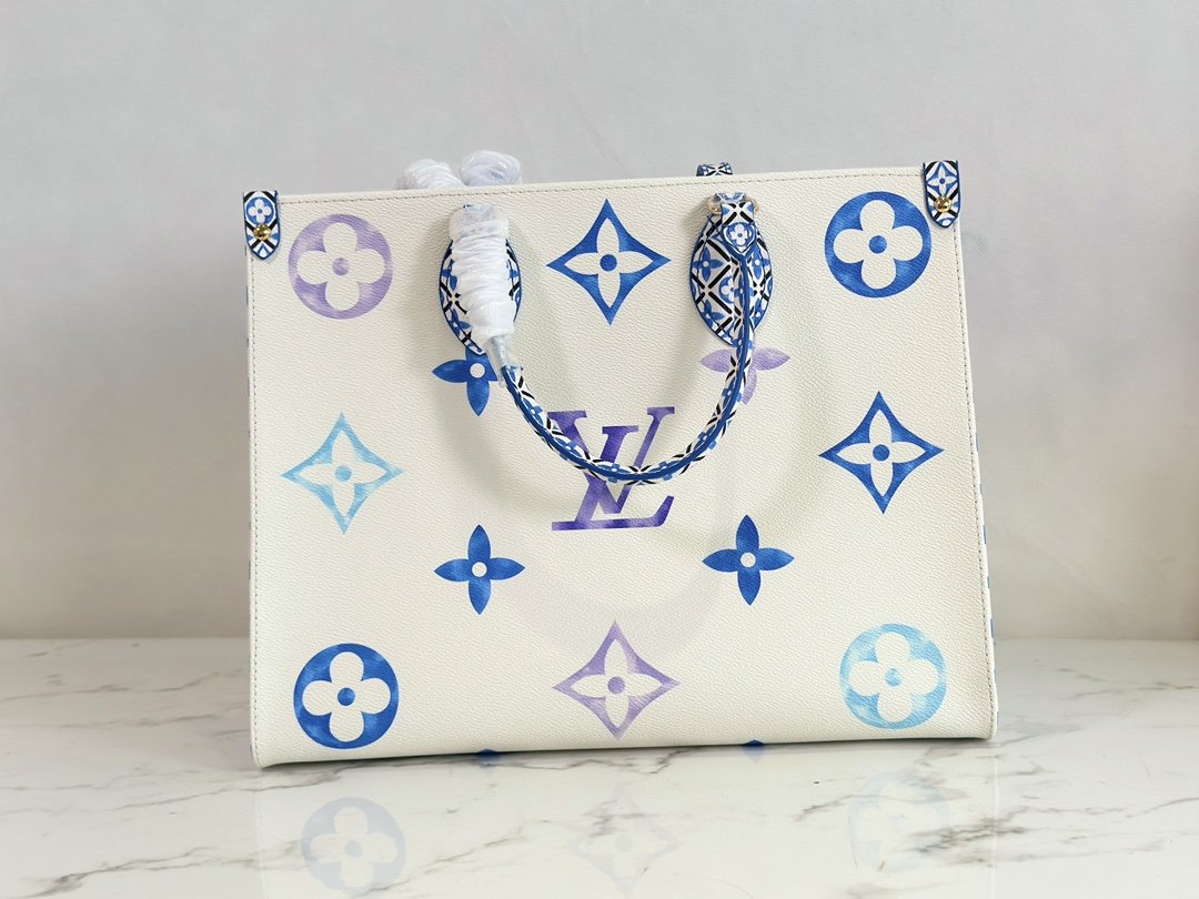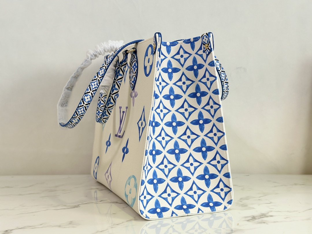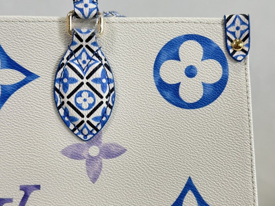 Square Bag Mommy Bag Series Seasonal New ONTHEGO Medium Handbag This OnTheGo medium handbag depicts a large Monogram pattern on coated canvas, and then lays out intricate Monogram flowers on the trim and lining, showing the inspiration of traditional Portuguese tiles. The ample space combined with the long and short handle design makes it a good choice for daily travel.