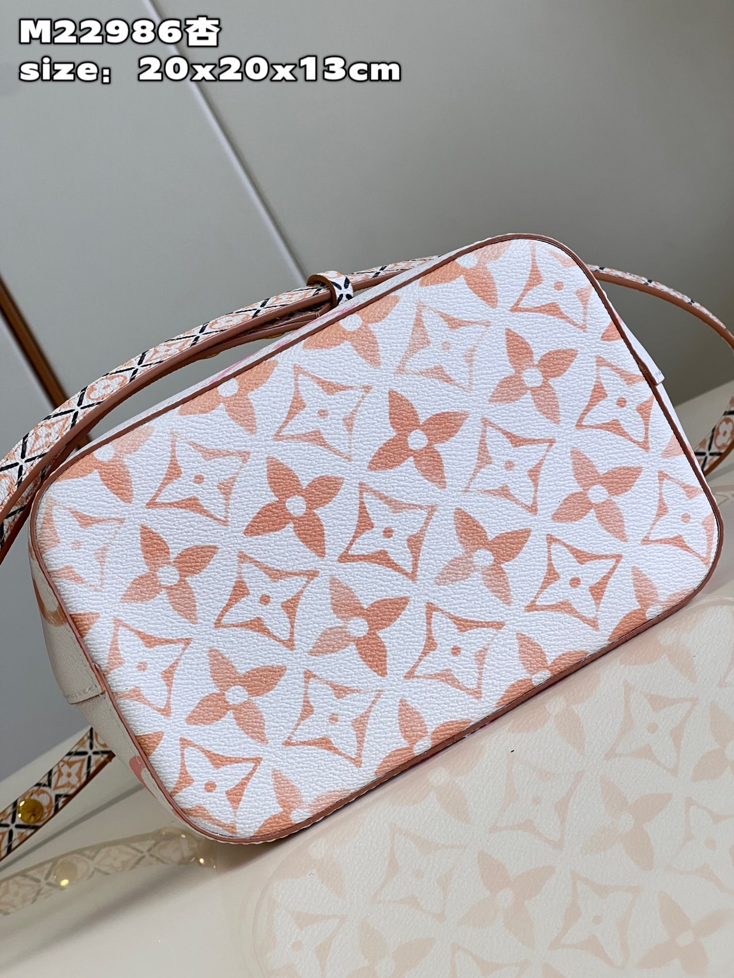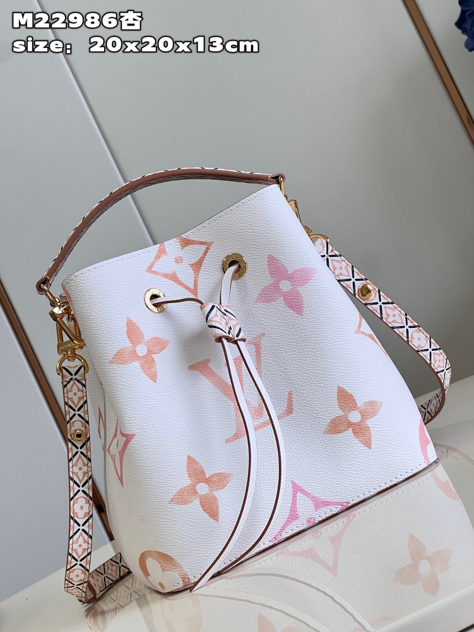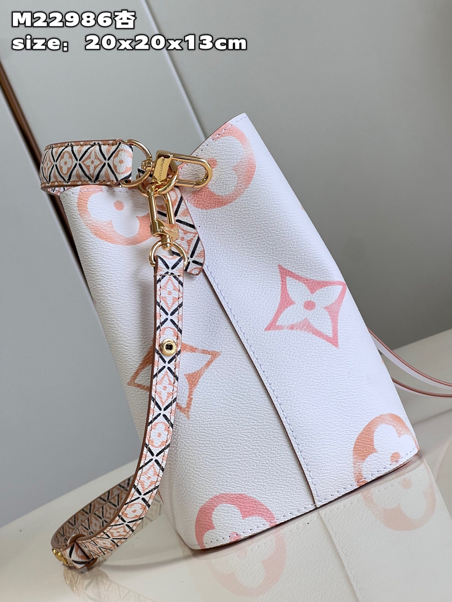 This NeoNoé bucket bag is painted with Giant Monogram print on light and elegant canvas, which makes LV and Monogram flowers appear in different shades of watercolor effects. size: 20x20x13cm