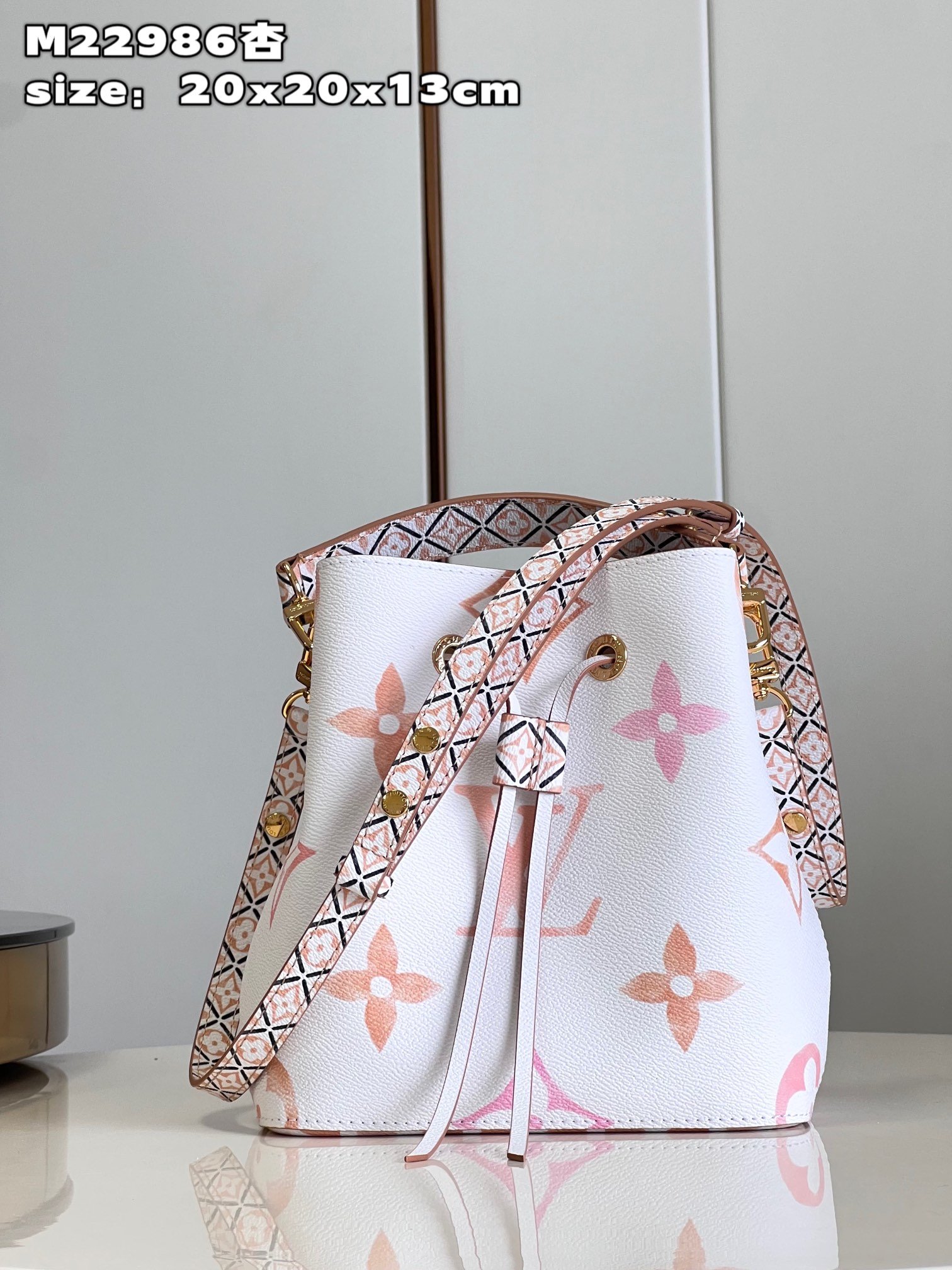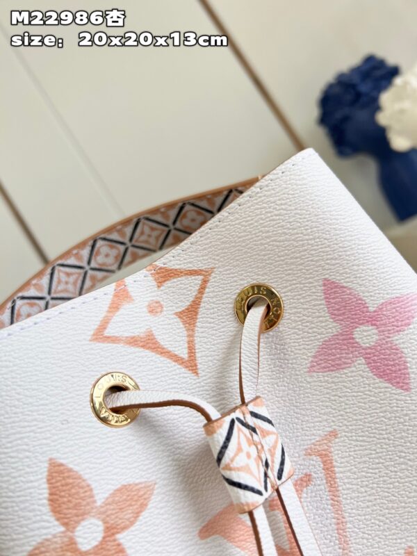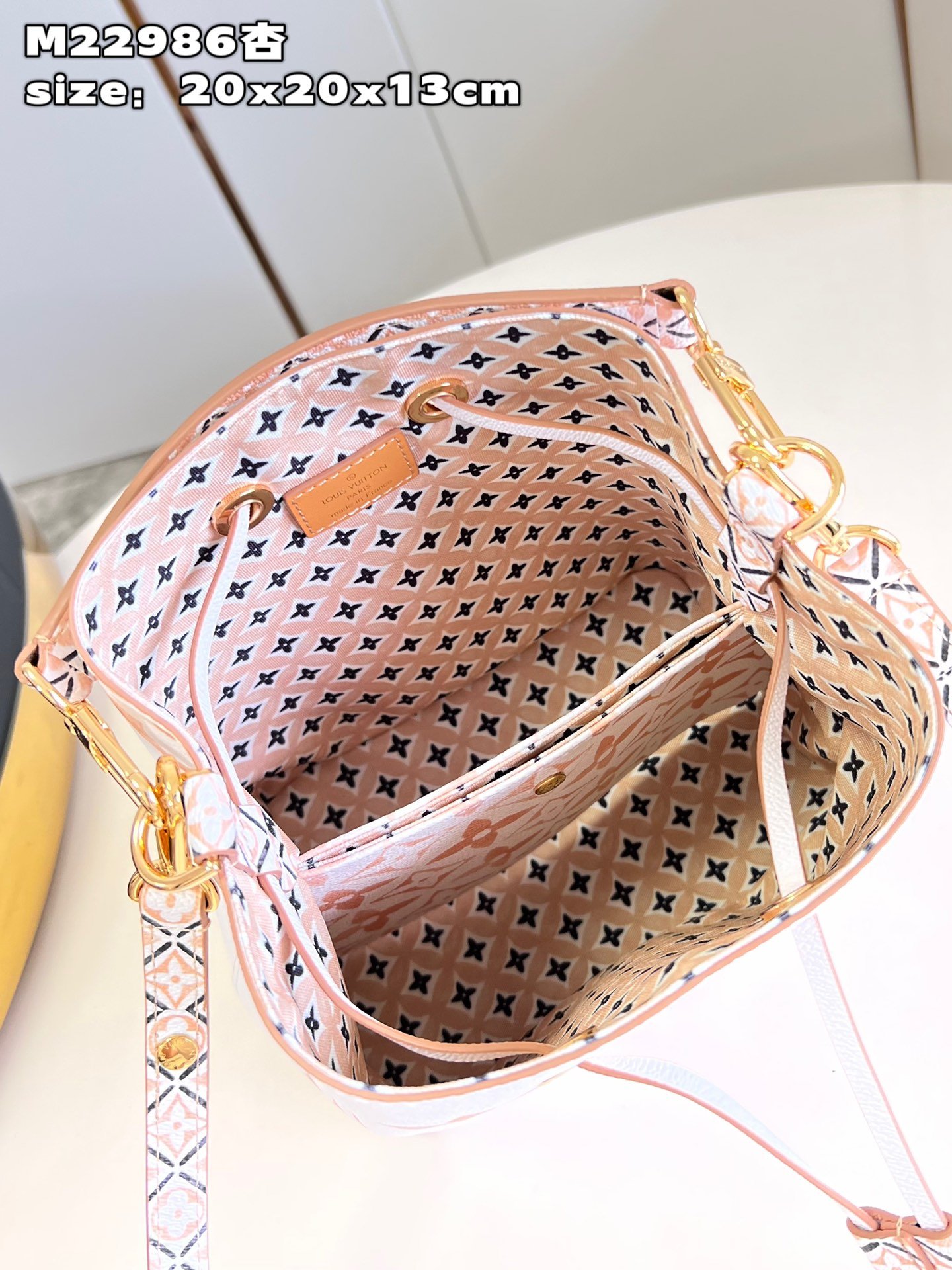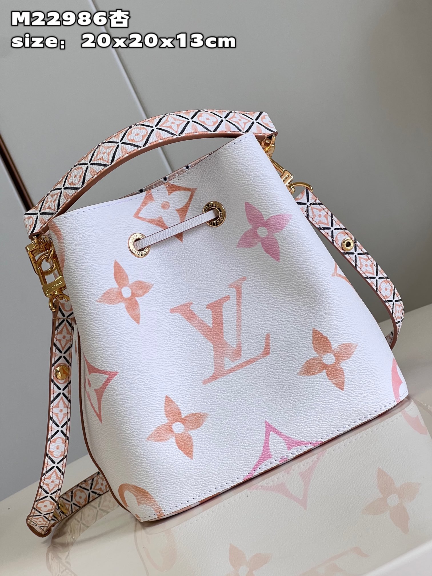 This NeoNoé bucket bag is painted with Giant Monogram print on light and elegant canvas, which makes LV and Monogram flowers appear in different shades of watercolor effects. size: 20x20x13cm