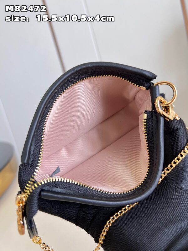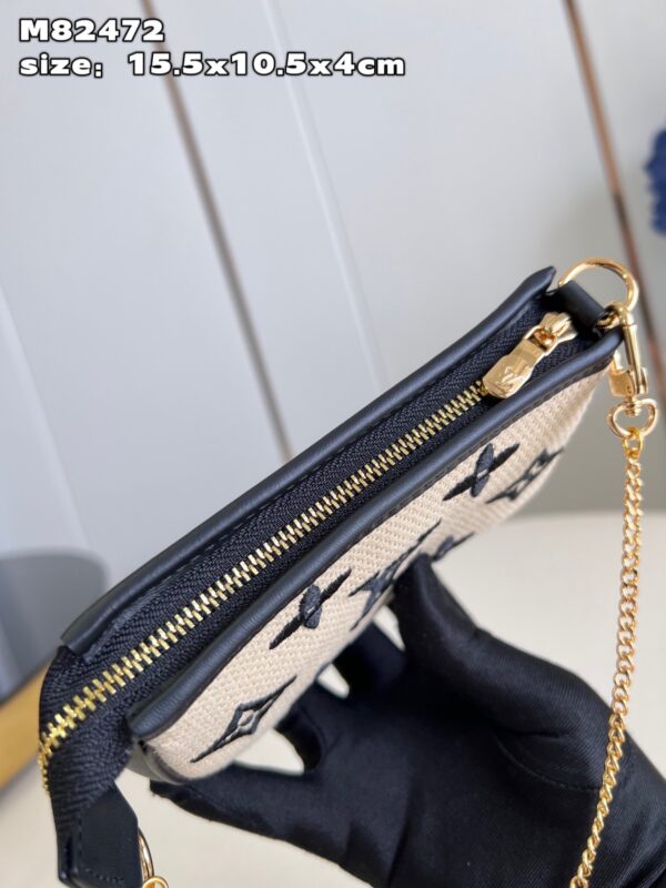 This exquisite mini leather bag is made of natural pure cotton, decorated with black Monogram pattern and matching leather trim, which can store all kinds of small necessities, with safety zipper closure, golden hook and chain strap , can be attached to a handbag or belt. size: 15.5×10.5x4cm