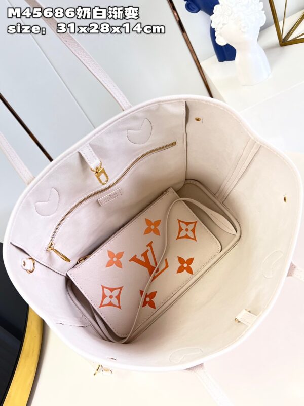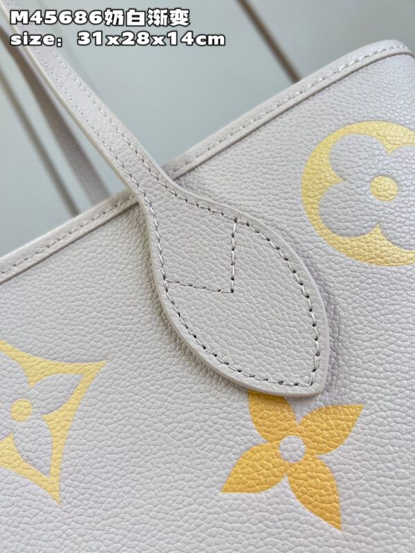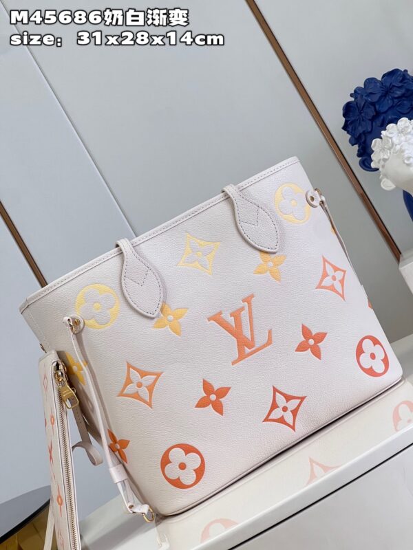 Neverfull medium-sized handbag conveys soft charm with Monogram Empreinte leather, embellished with large LV letters in gradient colors and Monogram flowers. Untie the side straps, and the compact shape immediately transforms into a casual tote bag The detachable zipper bag is made of Monogram Empreinte leather, suitable for storing valuables size: 31x28x14cm