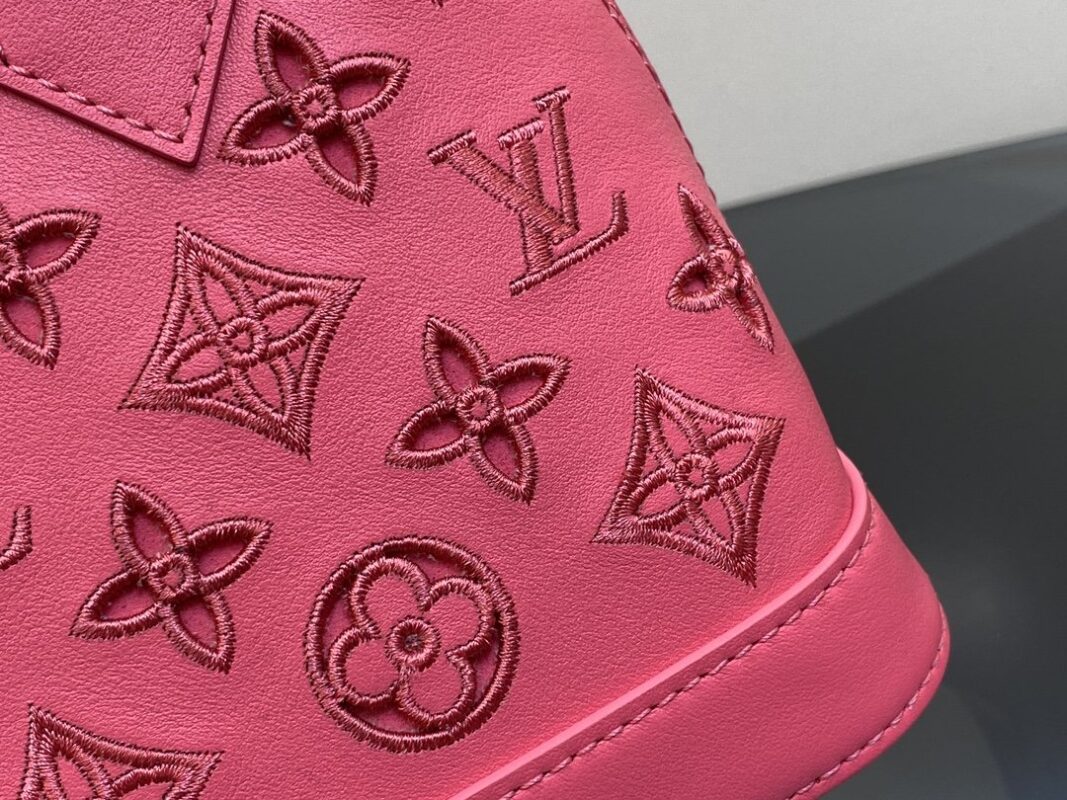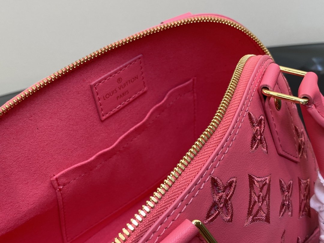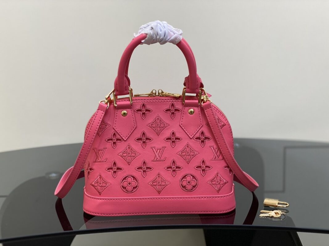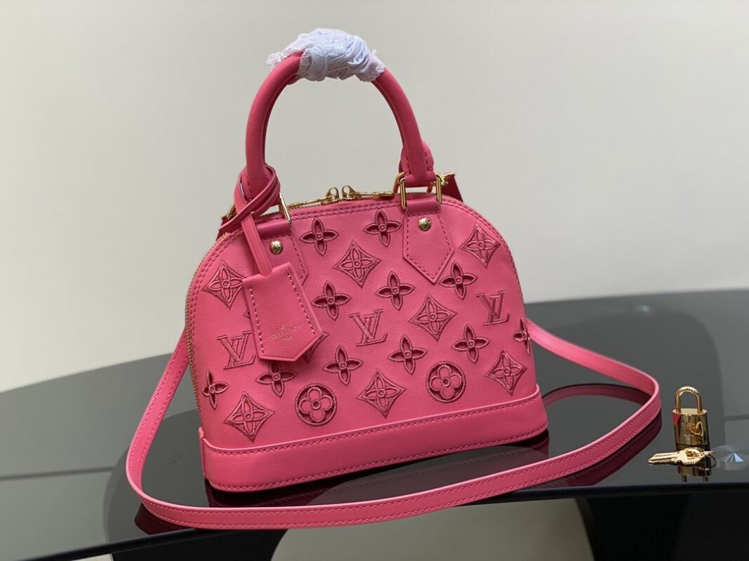 rose red embroidery shell bag series New Alma BB handbag for the season M91606 This Alma BB bag is to commemorate the LV English embroidery theme of this season. This charming piece is expertly crafted from supple calfskin with Monogram motif. The openwork design is enhanced with drone stitching to create the effect of delicate British embroidery. Available in lively and playful shades, this bag can sublime into a sunny day. 23.5 x 17.5 x 11.5 cm.