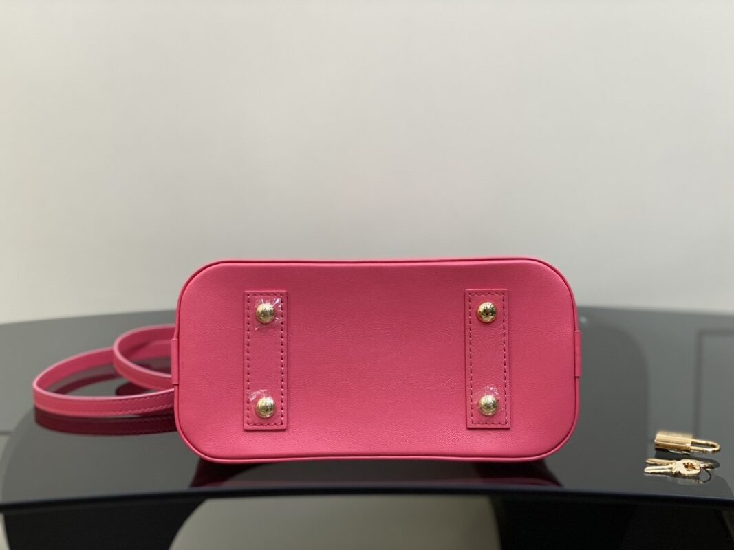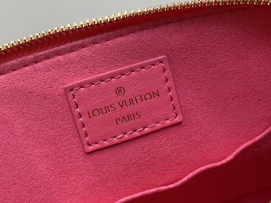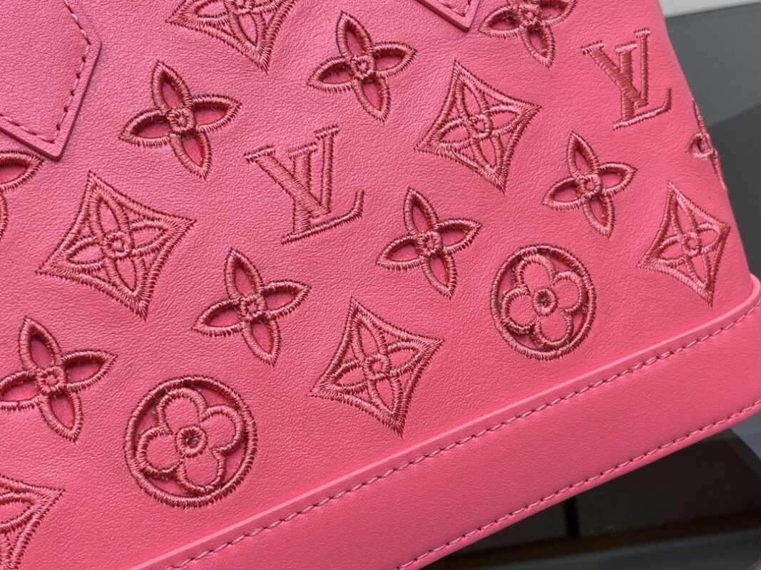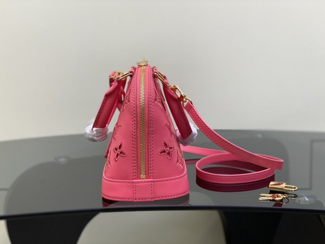 rose red embroidery shell bag series New Alma BB handbag for the season M91606 This Alma BB bag is to commemorate the LV English embroidery theme of this season. This charming piece is expertly crafted from supple calfskin with Monogram motif. The openwork design is enhanced with drone stitching to create the effect of delicate British embroidery. Available in lively and playful shades, this bag can sublime into a sunny day. 23.5 x 17.5 x 11.5 cm.