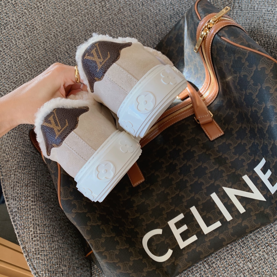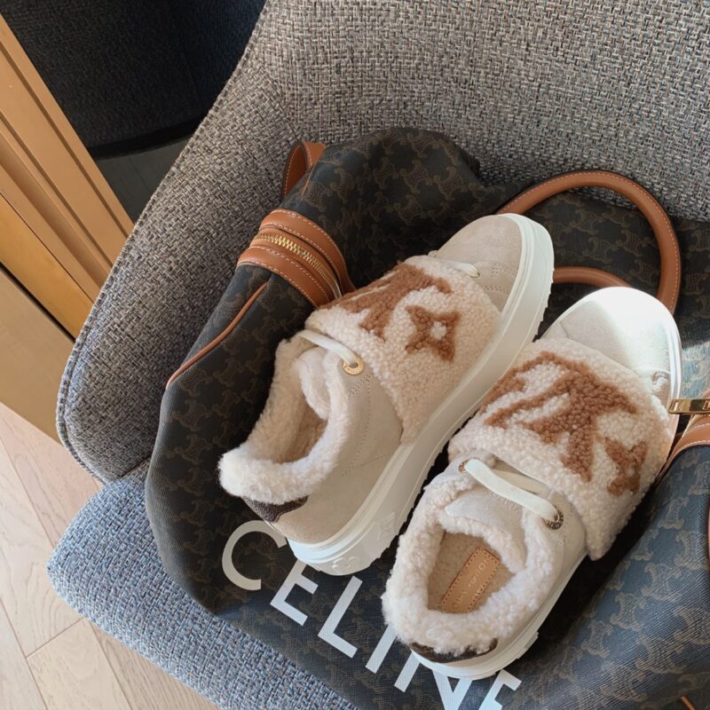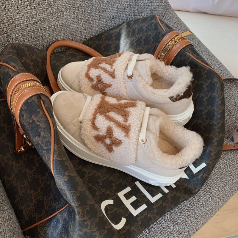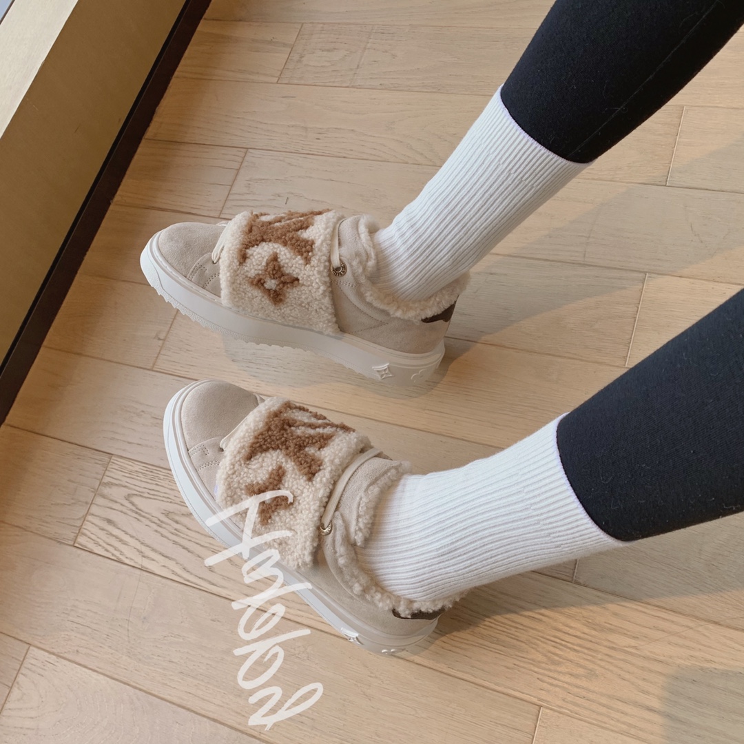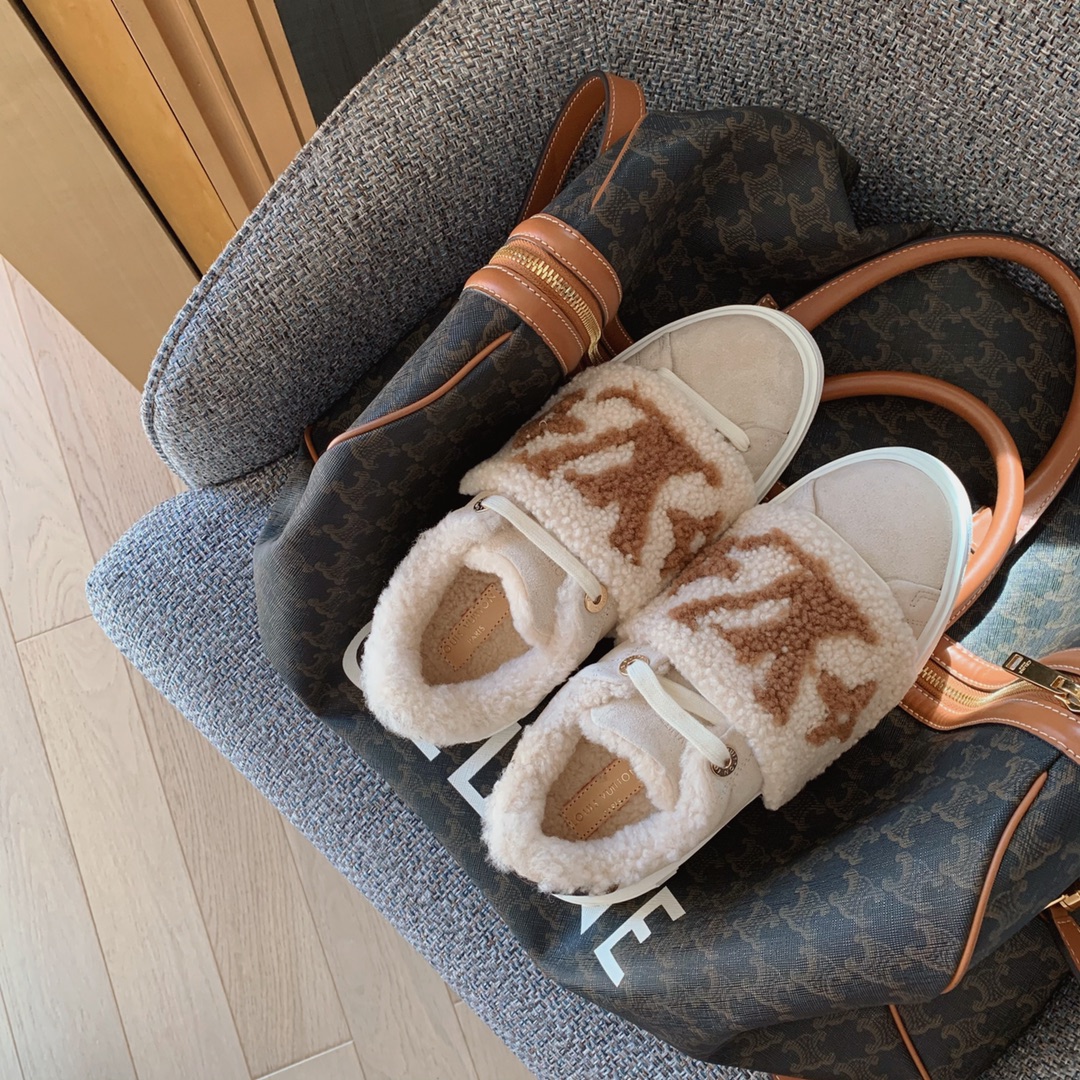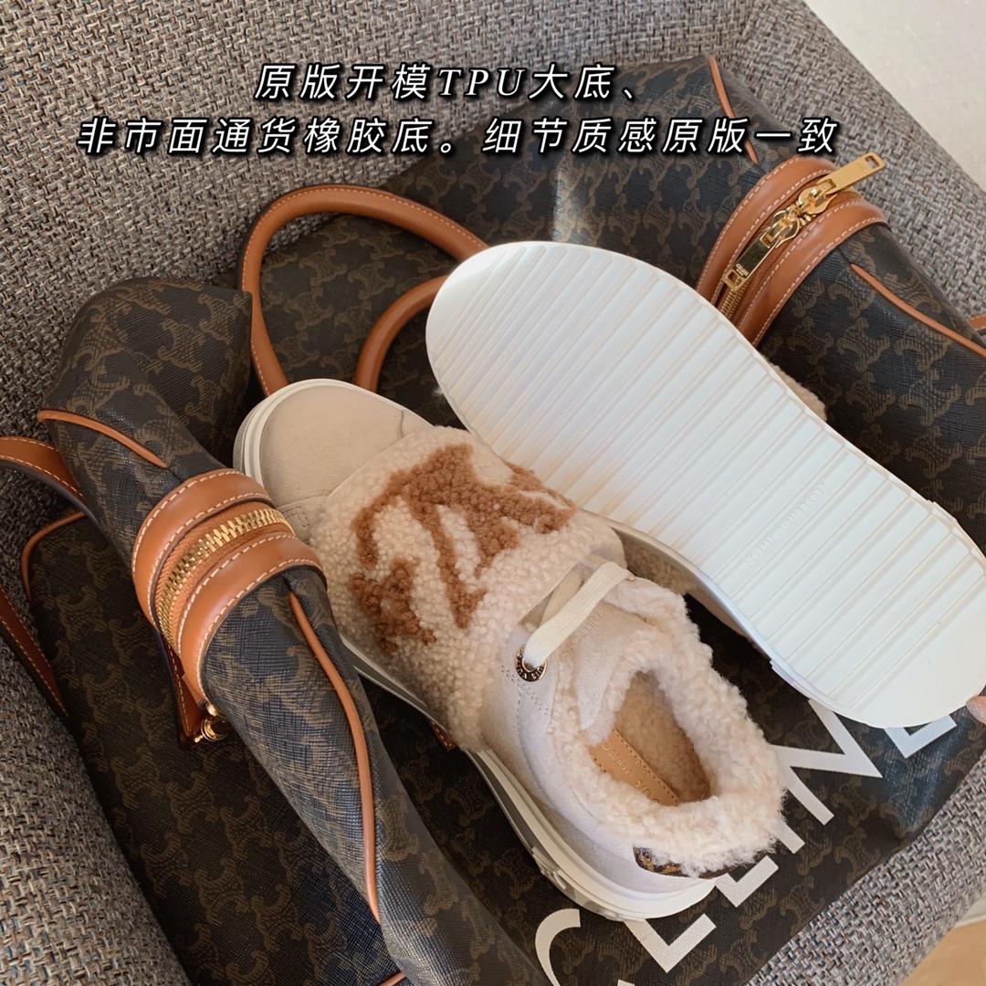 LV time out wool platform sneakers New for autumn and winter! The lamb wool is super warm, the upper foot is super western style, and the logo printed on the shoe body is low-key and tasteful. The bottom thickness is 4cm, instantly elongating the legs. Close your eyes, top quality The upper is made of real fur, and the texture is as delicate as zp! Original consistent fleece on inner pads. The original molded Tpu outsole is of the same quality as before, with impeccable details. Please distinguish it from cheap products in the market Size: 35-41 full set ⚠️40, 41 customized non-refundable