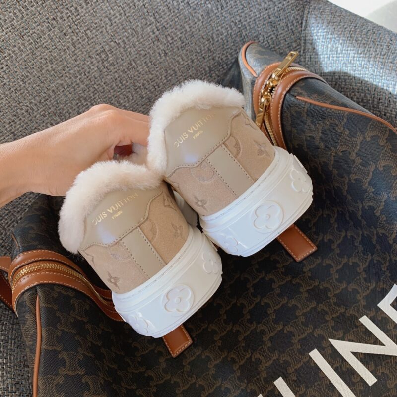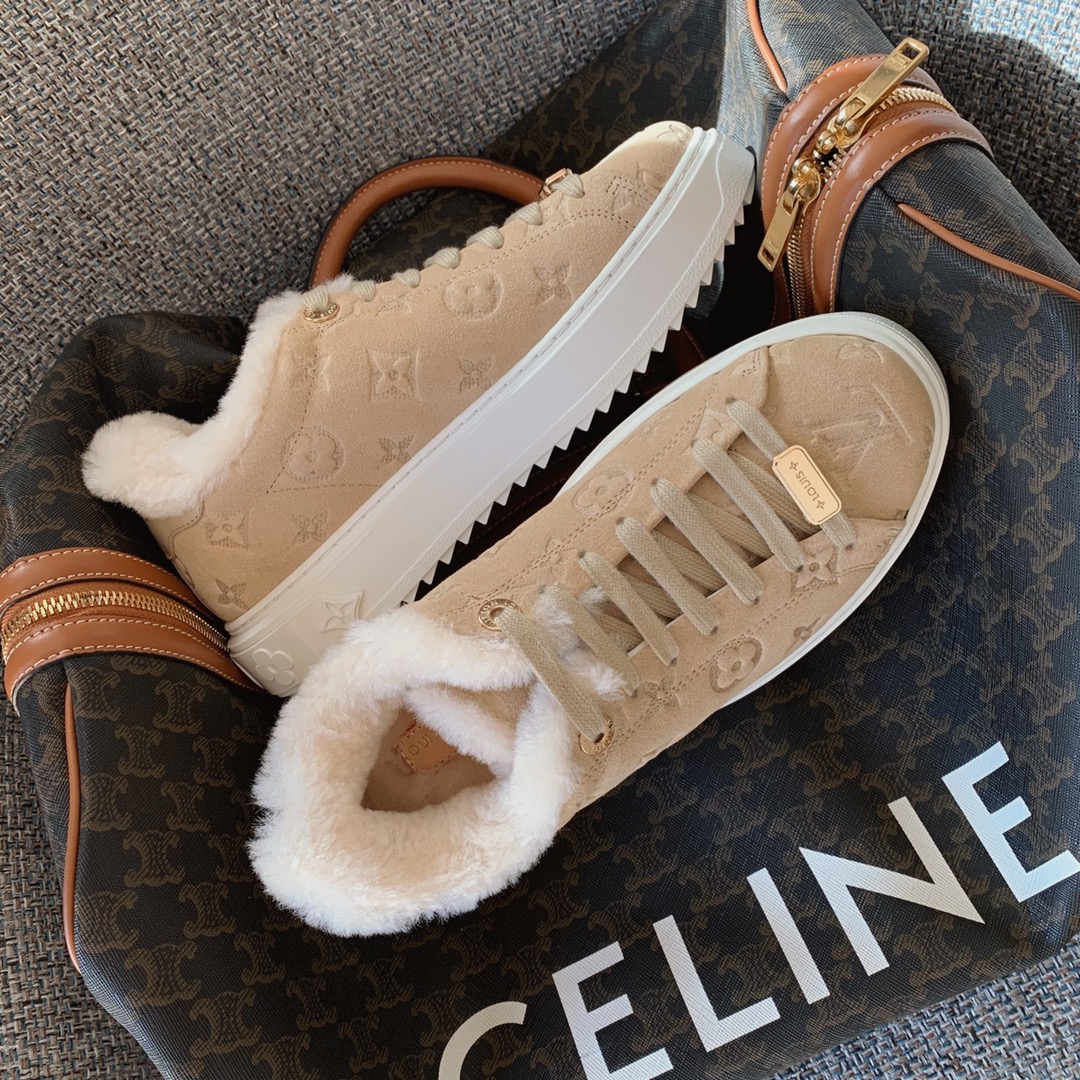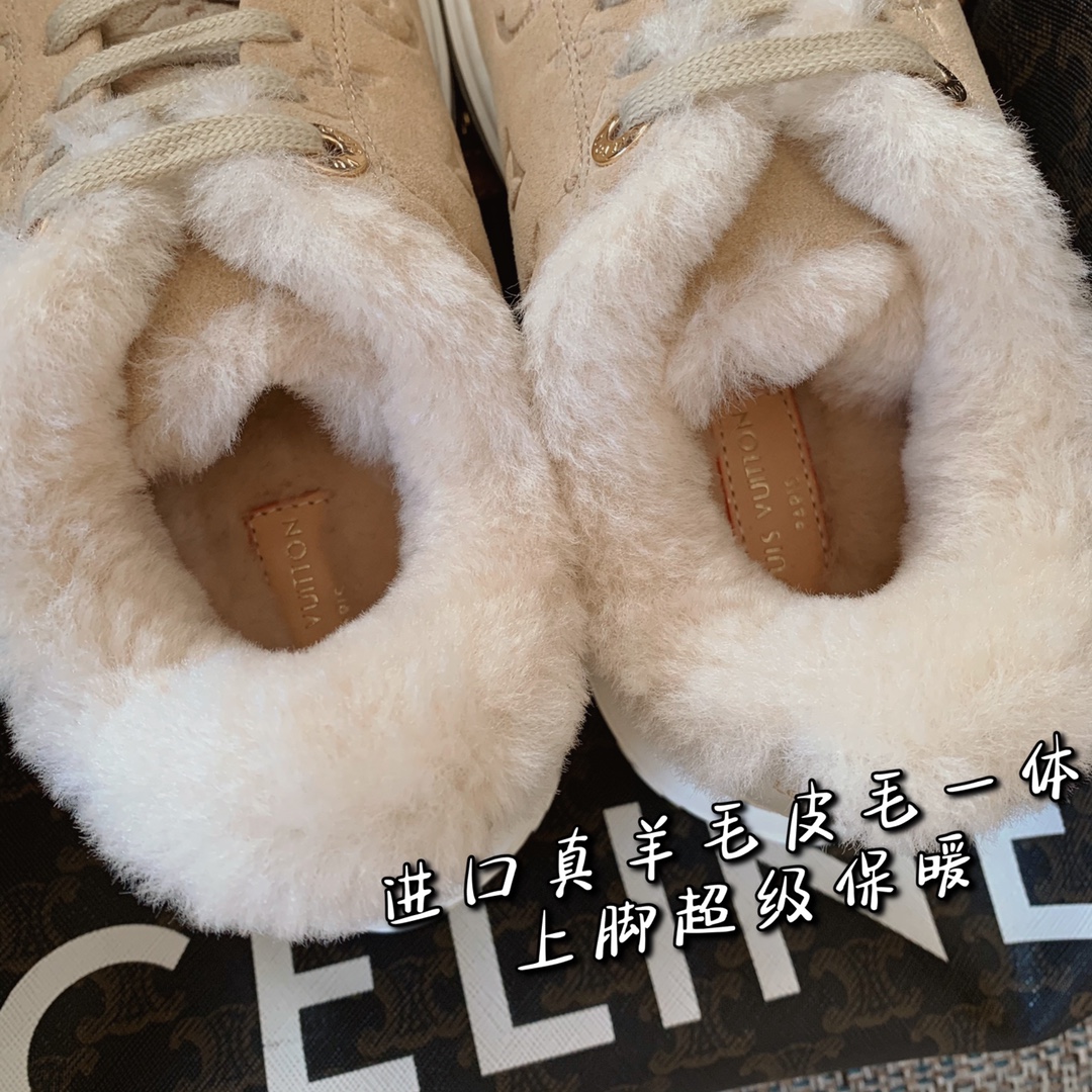 LV time out wool platform sneakers New for autumn and winter! The fleece is super warm, the upper foot is super foreign, and the logo printed on the shoe body is low-key and tasteful. The bottom thickness is 4cm, instantly elongating the legs. Close your eyes, top quality The upper is made of real fur, and the texture is as delicate as zp! Original consistent fleece on inner pads. The original molded Tpu outsole is of the same quality as before, with impeccable details. Please distinguish it from cheap products in the market Size: 35-41 full set ⚠️40, 41 customized non-refundable